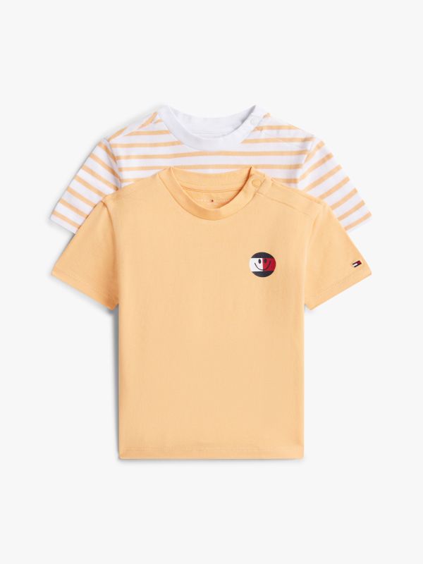 • Stretch cotton jersey • 2-pack • Crew neck • Snap-button closure on shoulder • One with all-over horizontal stripe • One with Tommy Hilfiger smiley flag logo on chest and back • Signature tape on side • Tommy Hilfiger branding • Tommy Hilfiger flag embroidery on sleeve