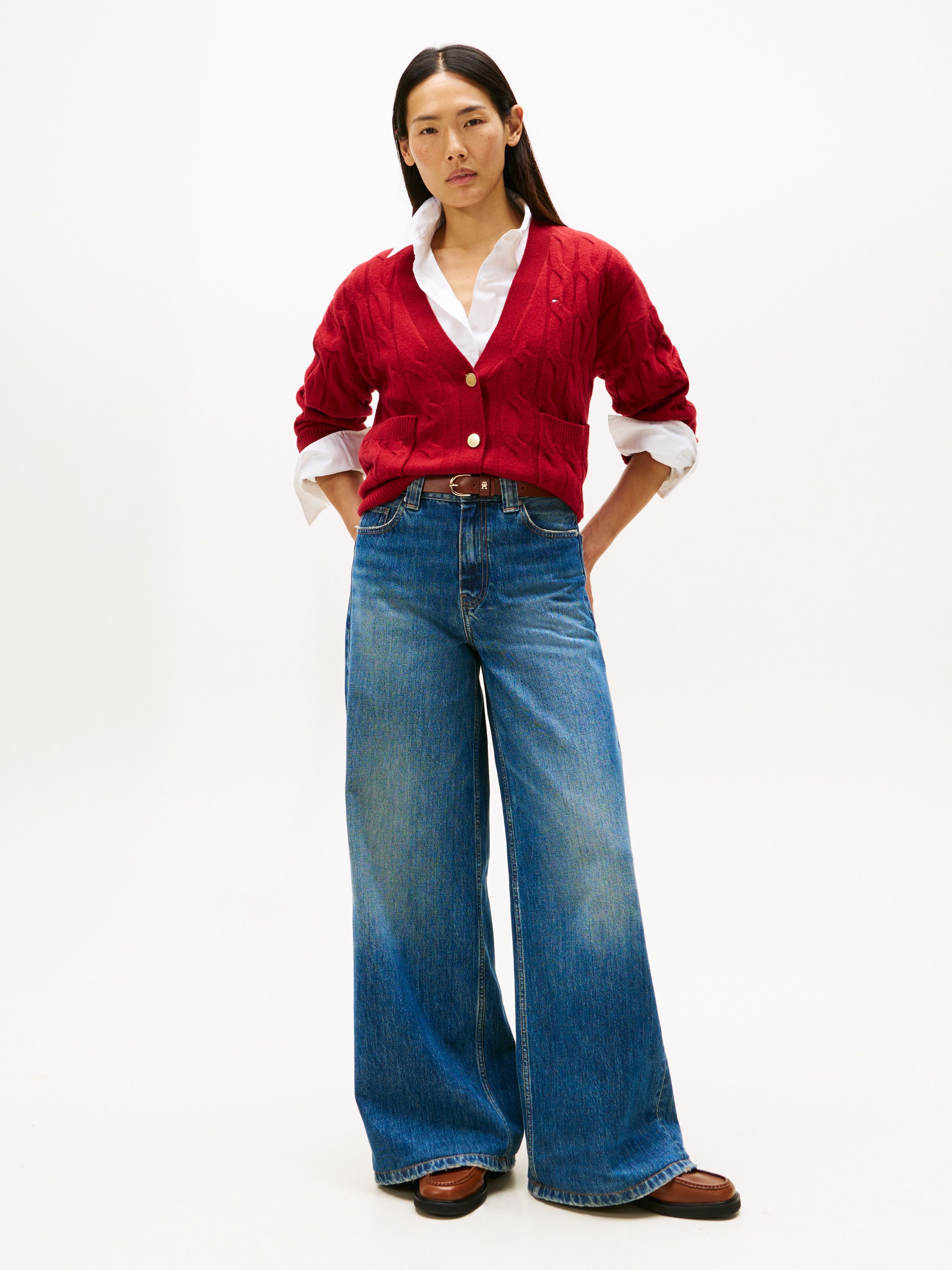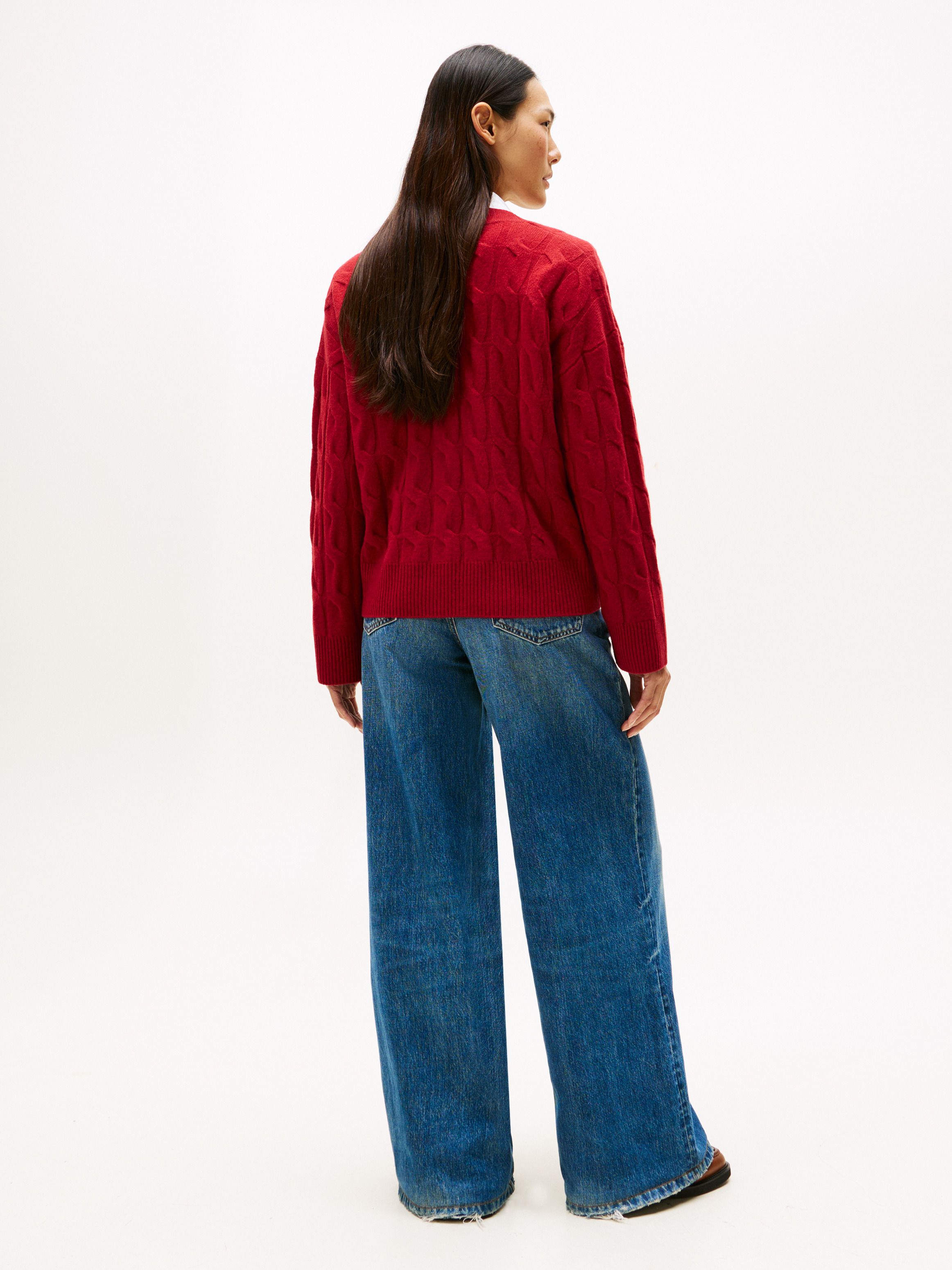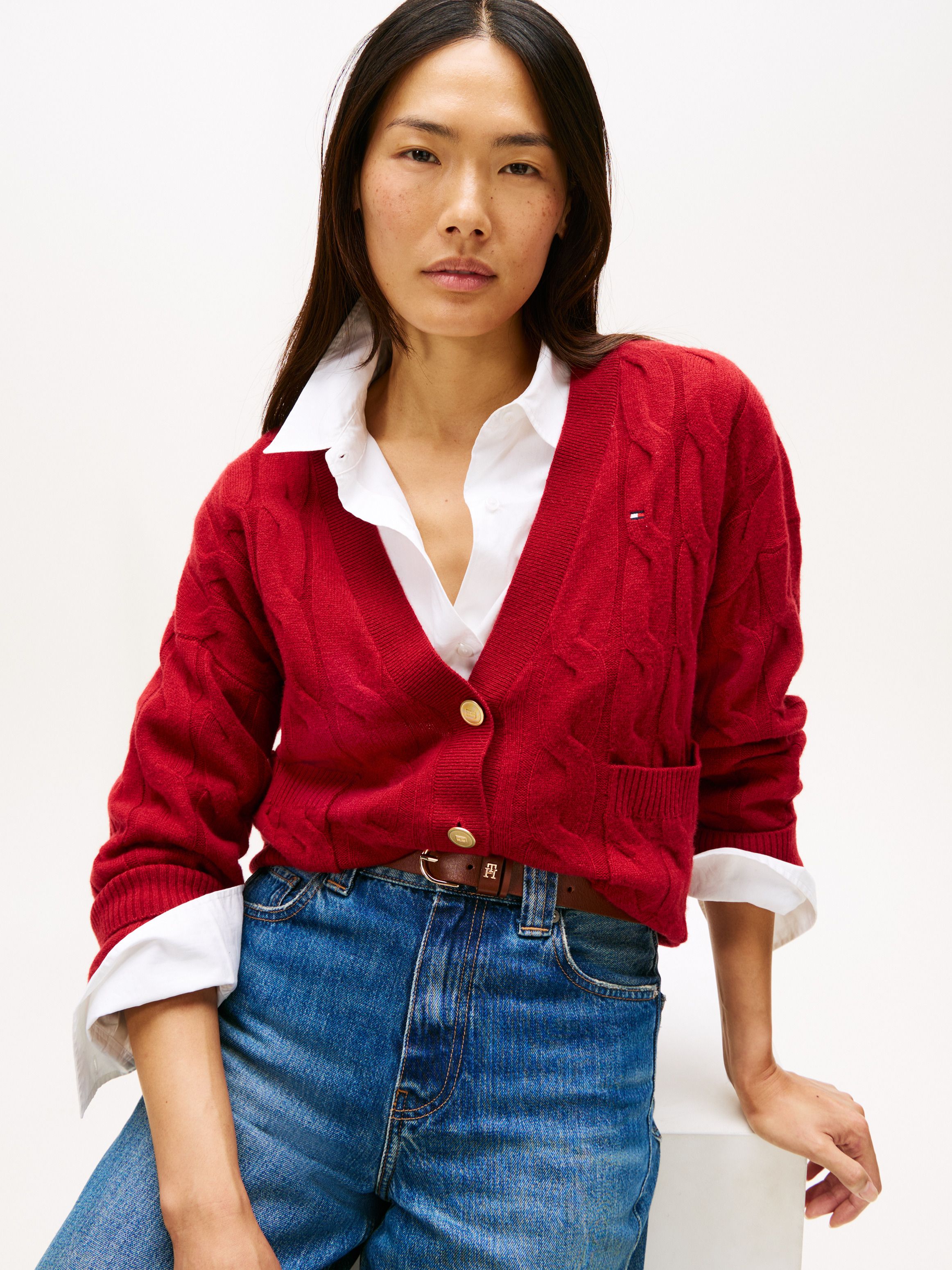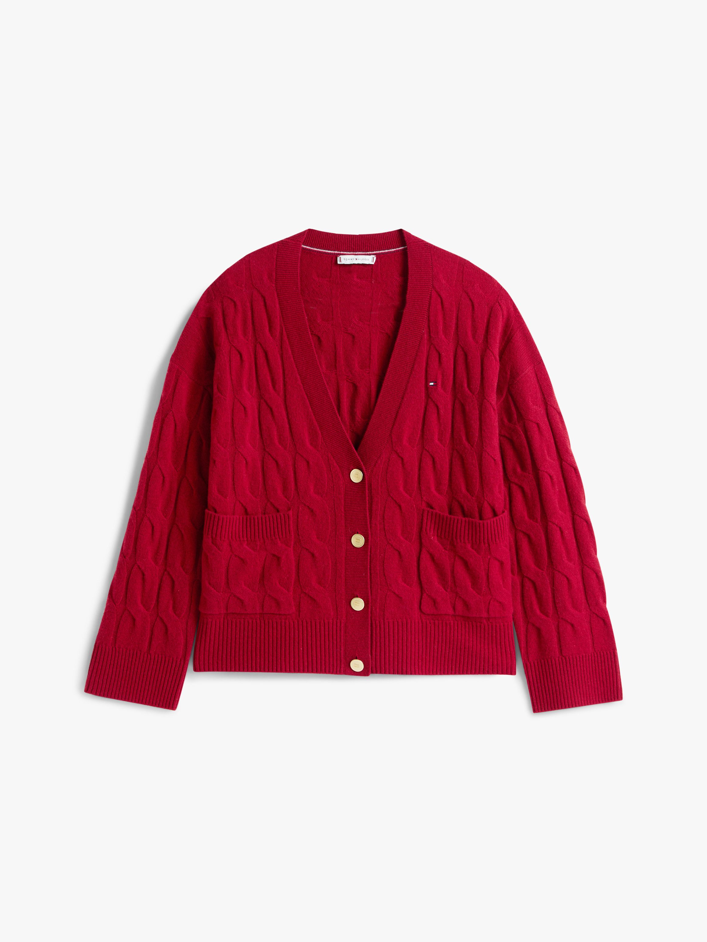 • Pure wool • All-over cable knit • Gold-tone buttons • V-neck • Button closure • Two front patch pockets • Rib-knit collar, placket, cuffs and hem • Tommy Hilfiger flag debossed on buttons • Tommy Hilfiger branding • Tommy Hilfiger flag embroidery on chest