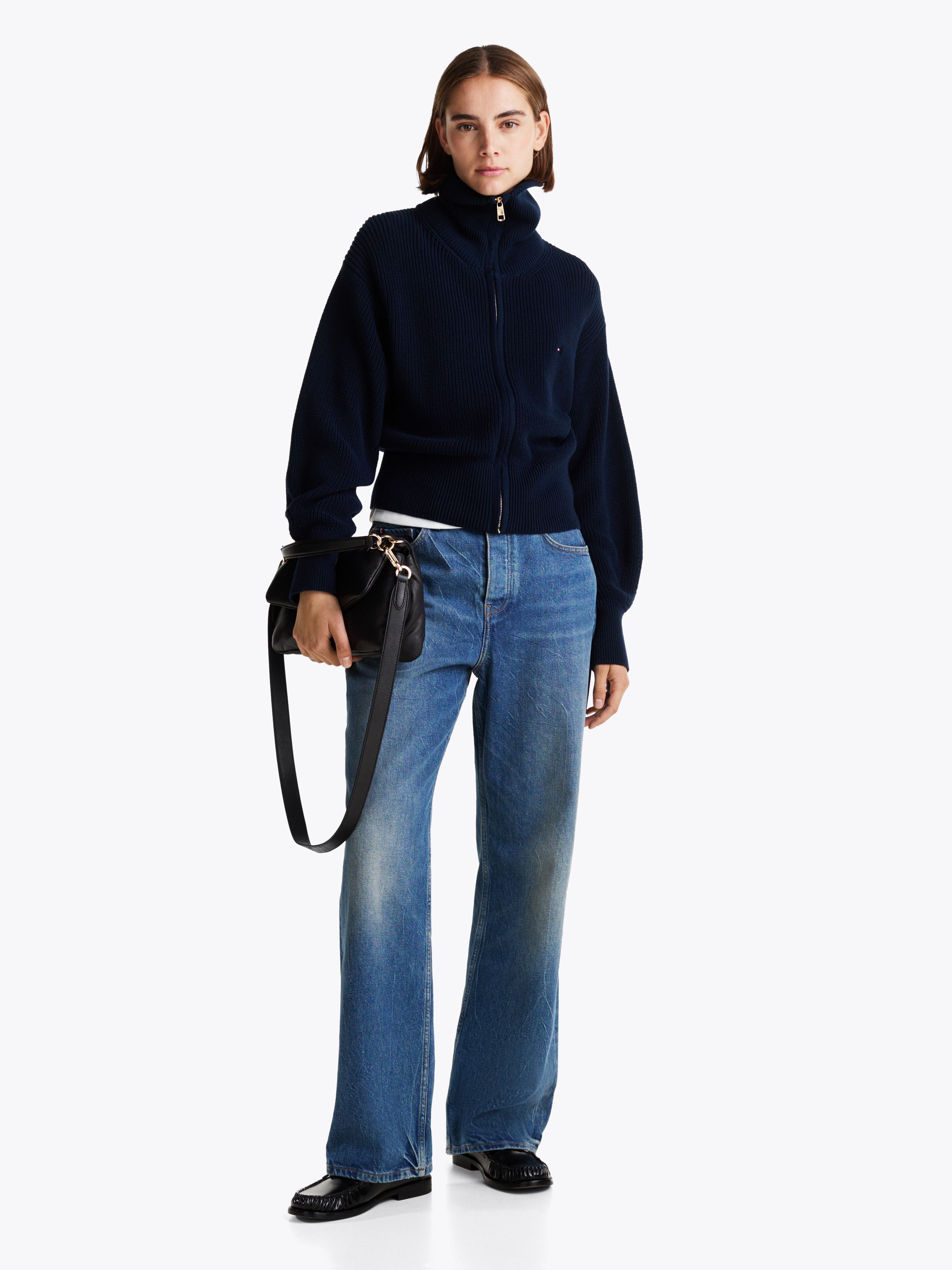 • Pure cotton • Cardigan stitch • High neck • Zip-thru • Rib-knit collar, cuffs and hem • Tommy Hilfiger branding • Tommy Hilfiger flag embroidery on chest