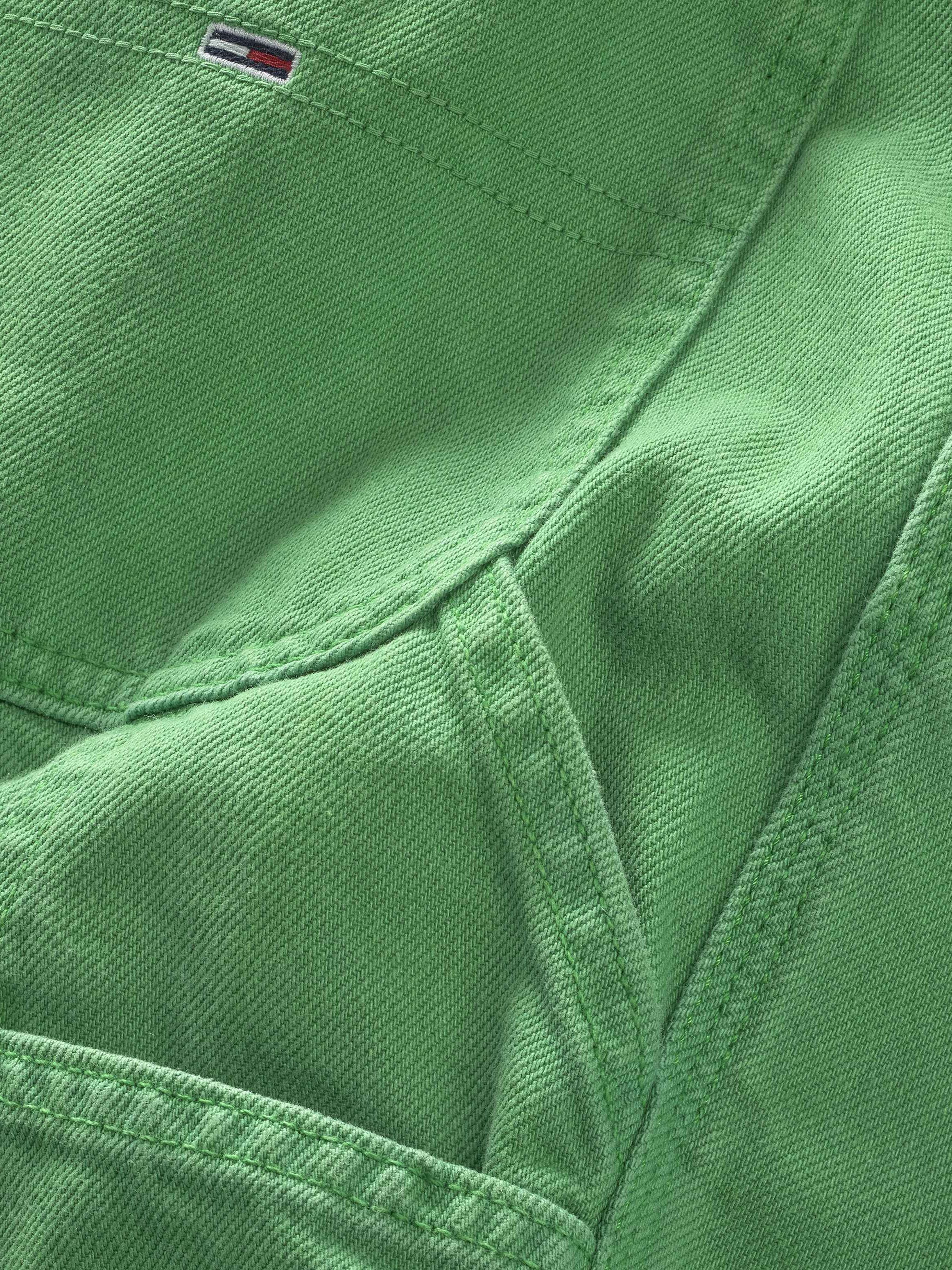 • Recycled rigid denim • Five-pocket styling • Additional carpenter style pockets • Tommy badge at back • Tommy Jeans branding • Tommy Jeans flag patch on coin and back pockets
