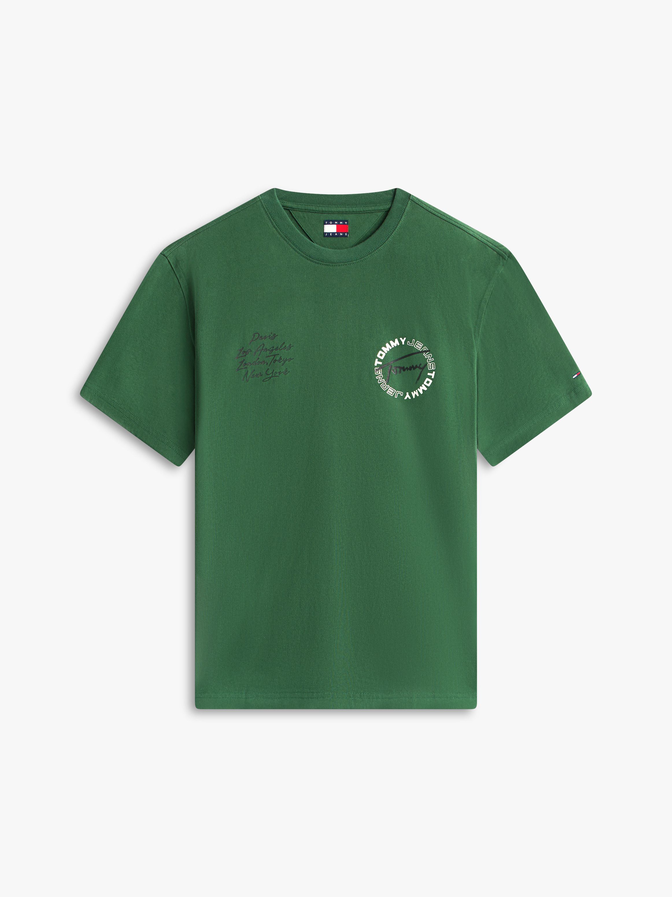 • Pure peached cotton jersey • Crew neck • Tommy Jeans oversized circular logo on back • Tommy Jeans signature circular logo on chest • Tommy Jeans branding • Tommy flag embroidery on sleeve