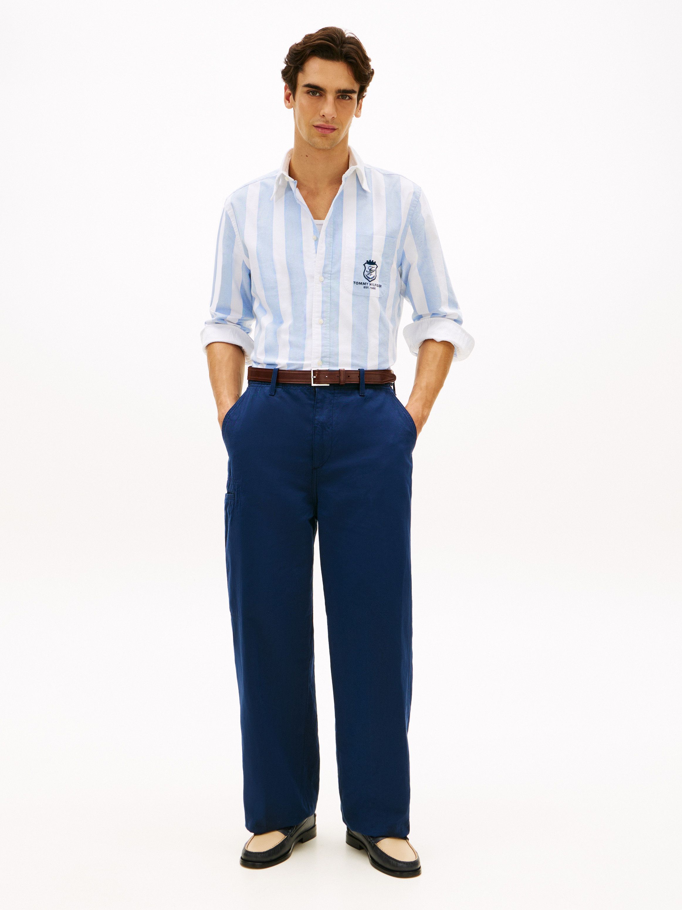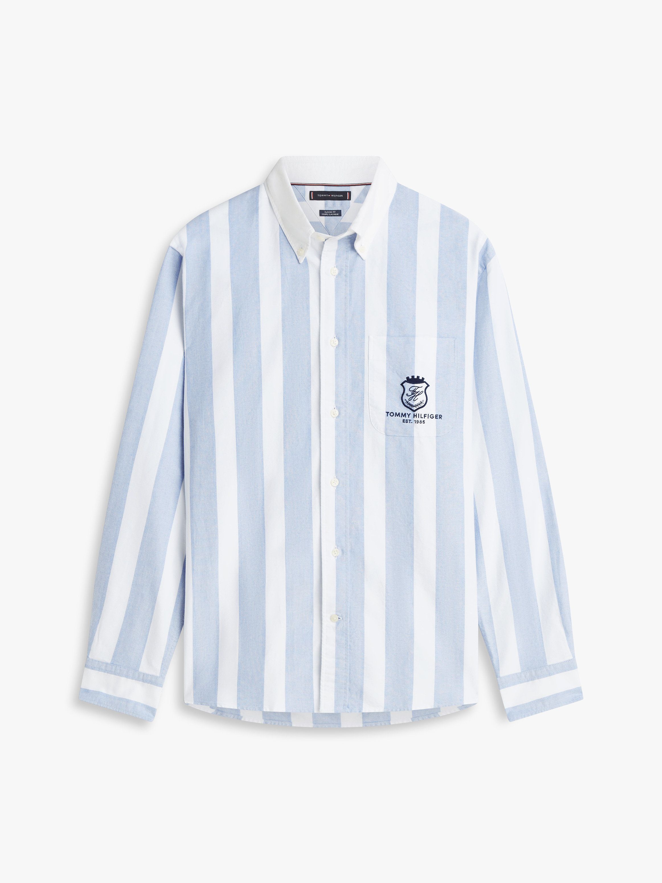 • Pure Oxford cotton • Yarn dyed • Button-down collar • One chest patch pocket • Rounded one-button cuffs • Box pleat on back • Shirttail hem • TH crest embroidery on pocket • Tommy Hilfiger branding • Tommy Hilfiger flag embroidery on cuff