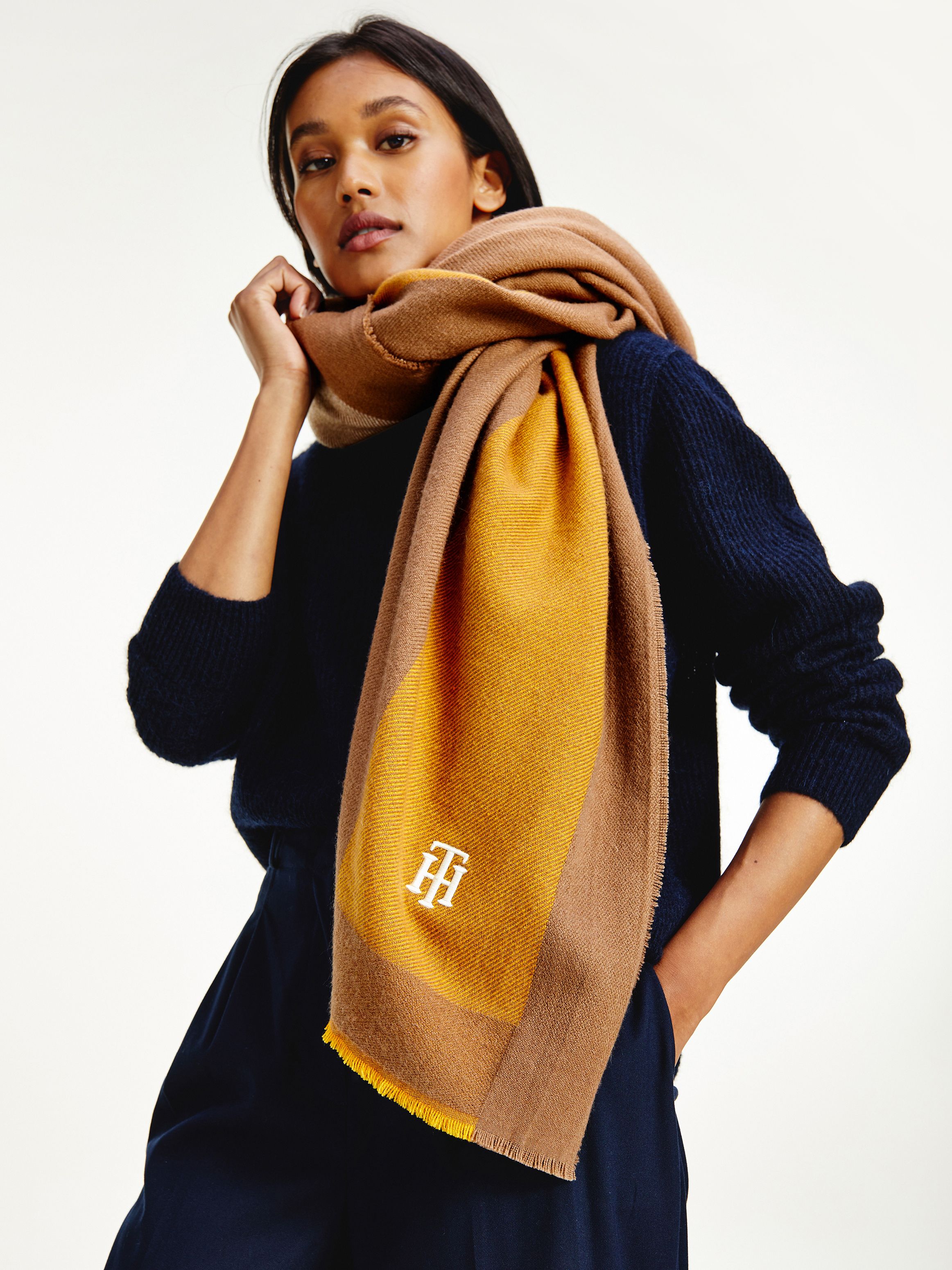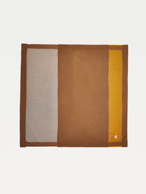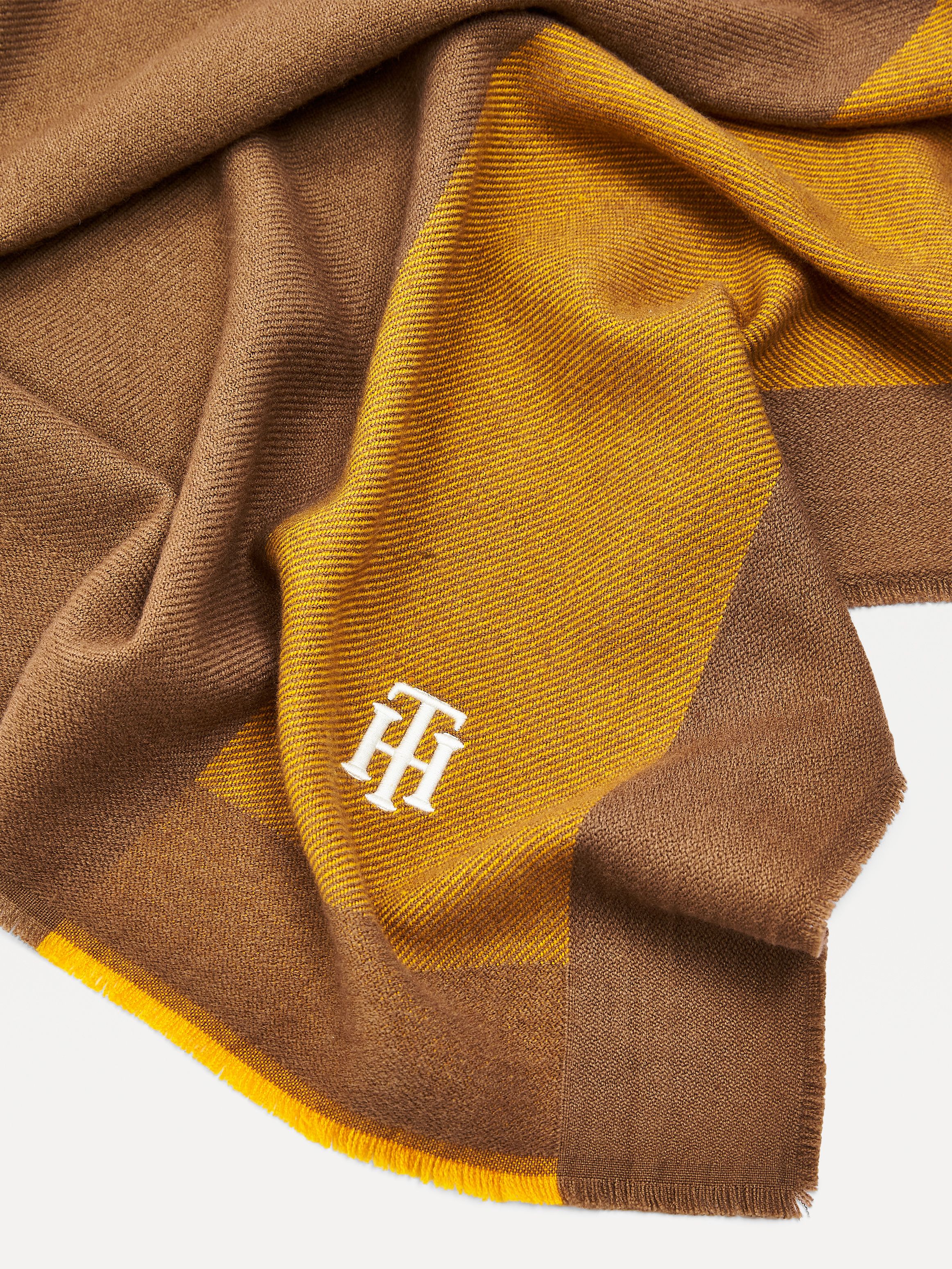 This colour-blocked blanket scarf is knitted from a luxurious wool blend and finished with monogram embroidery and a frayed hem.