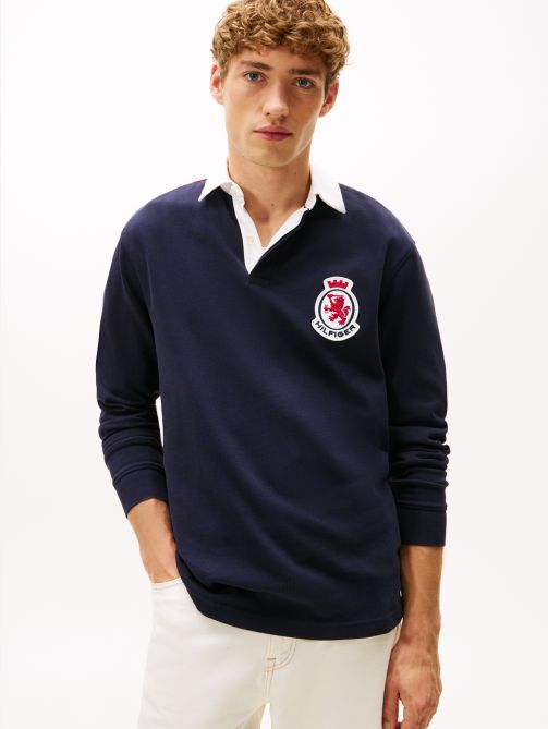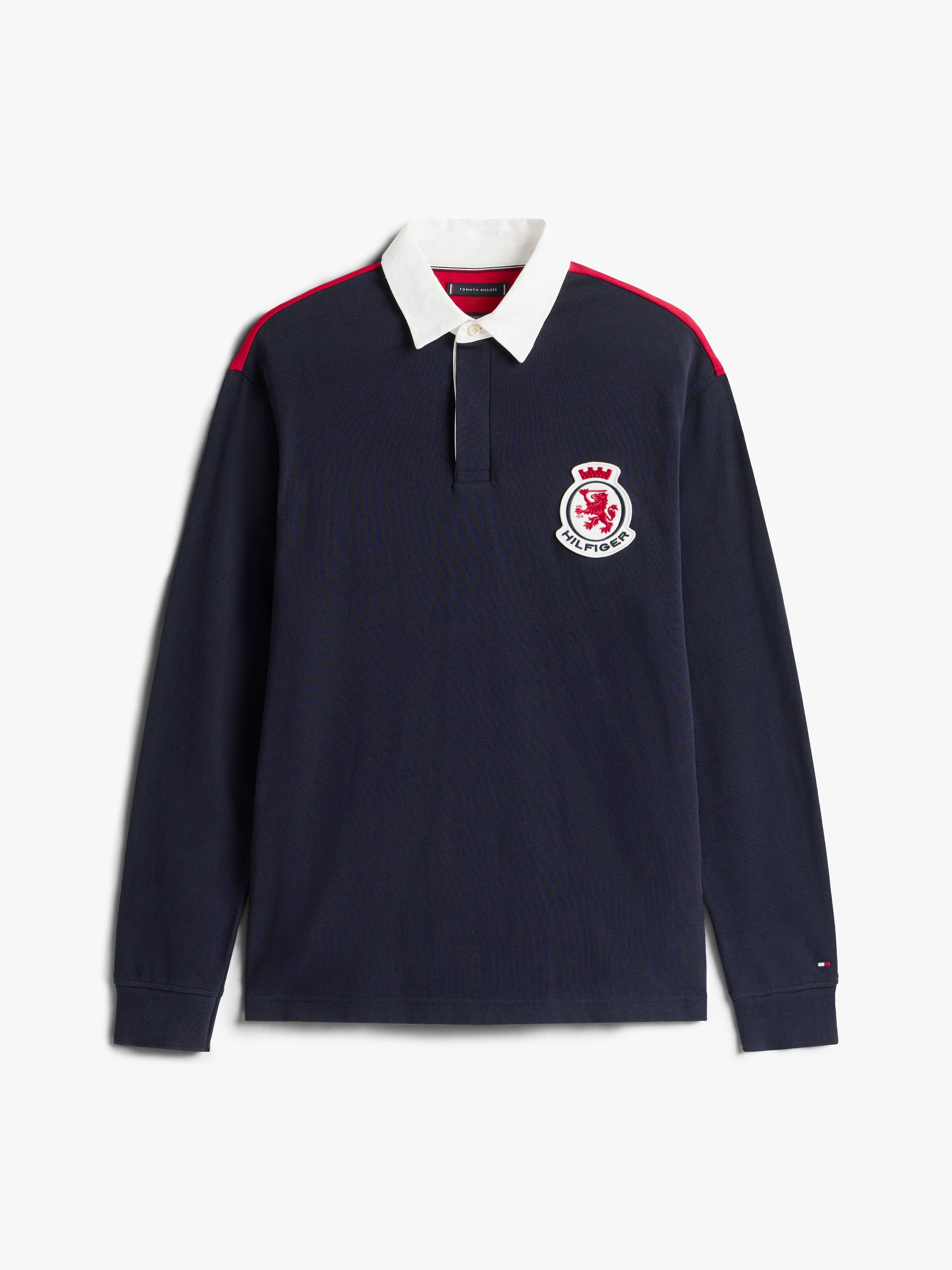 • Pure cotton jersey • Signature colour-blocked design • Rugby collar • Concealed placket • Rib-knit cuffs • TH crest patch on chest • Tommy Hilfiger branding • Tommy Hilfiger flag embroidery on sleeve