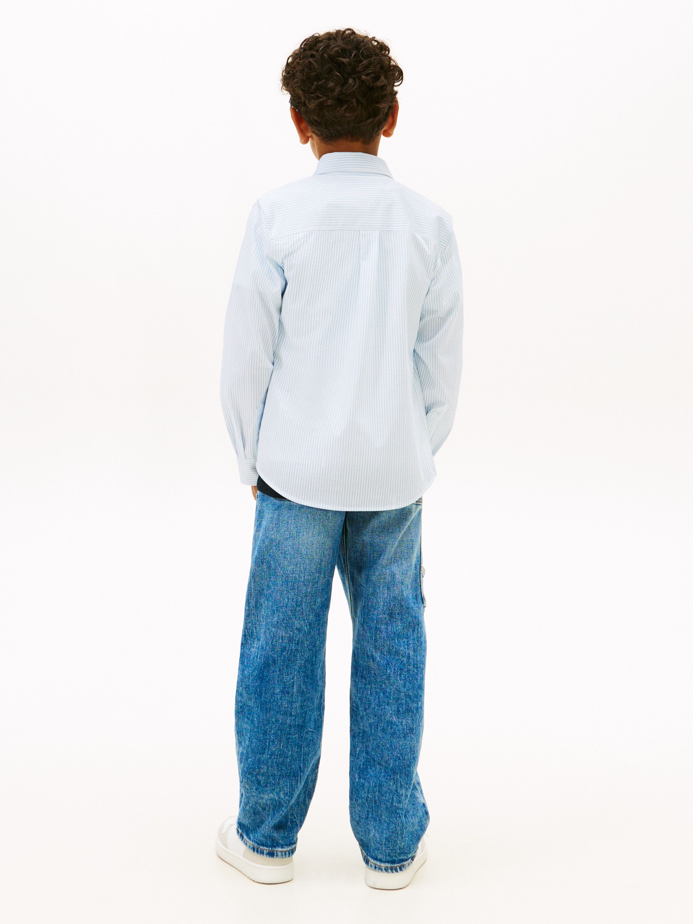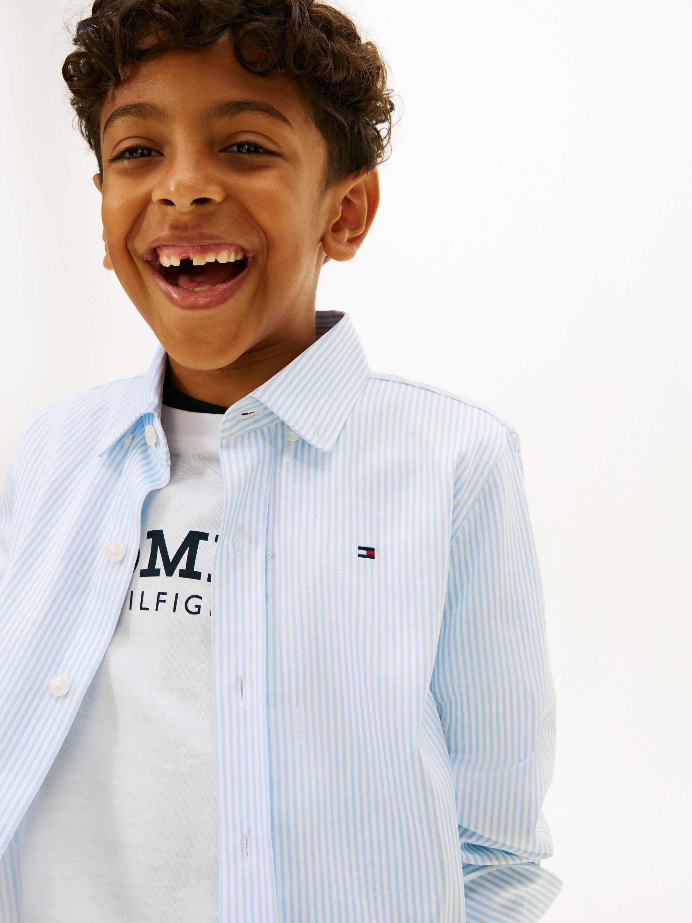 • Pure cotton • All-over vertical stripe • Button-down collar • Rounded one-button cuffs • Tommy Hilfiger branding • Tommy Hilfiger flag embroidery on chest