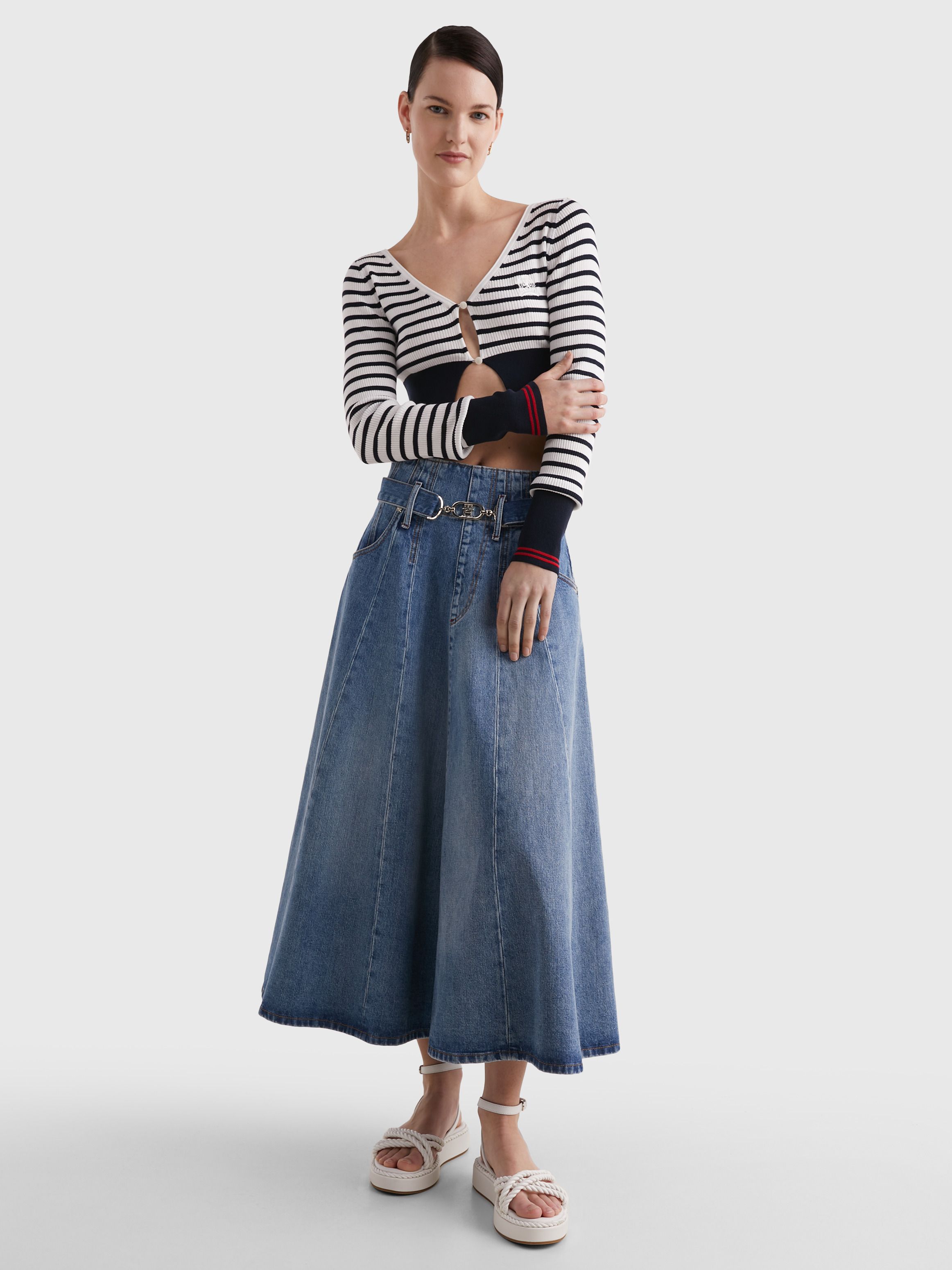 A stylish take on classic Breton stripe designs, this cardigan features a cropped silhouette for a dramatic finish.