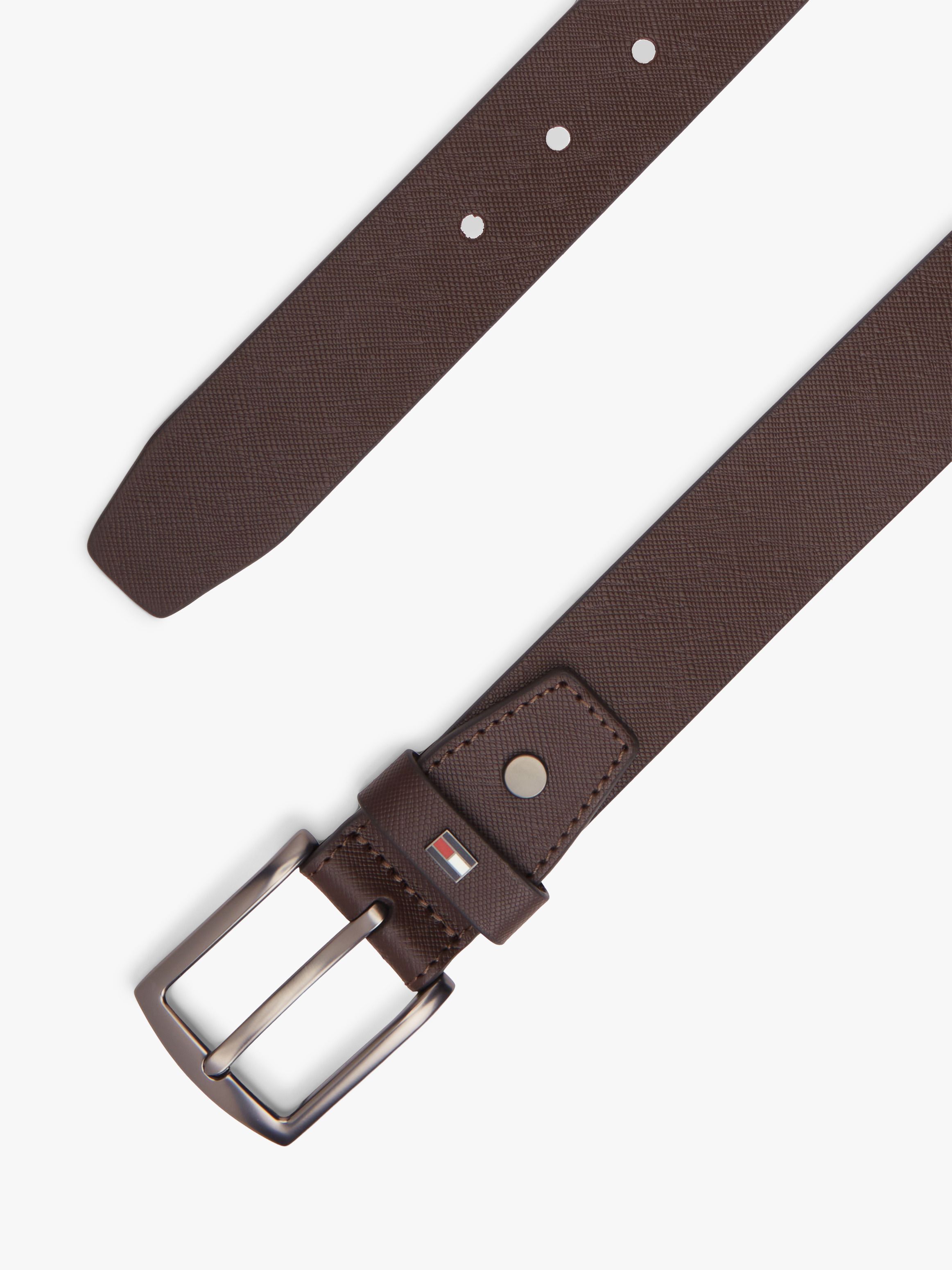 Add a touch of texture to your ensemble with this sleek leather belt, featuring a polished metal buckle and flag plaque detailing.