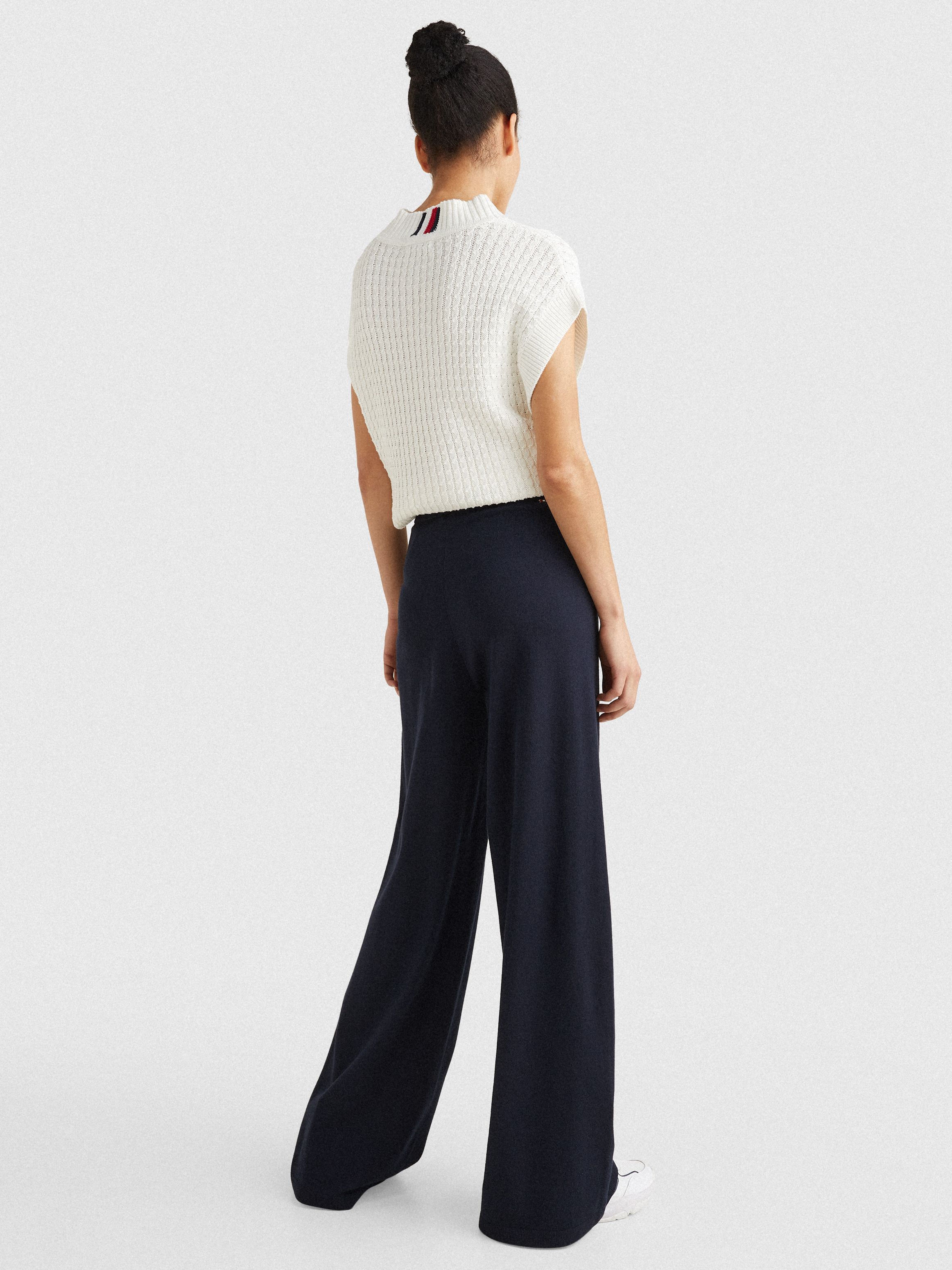 Knitted from pure organic cotton with a flexible drawstring waist, these wide-leg trousers are perfect for casual days.