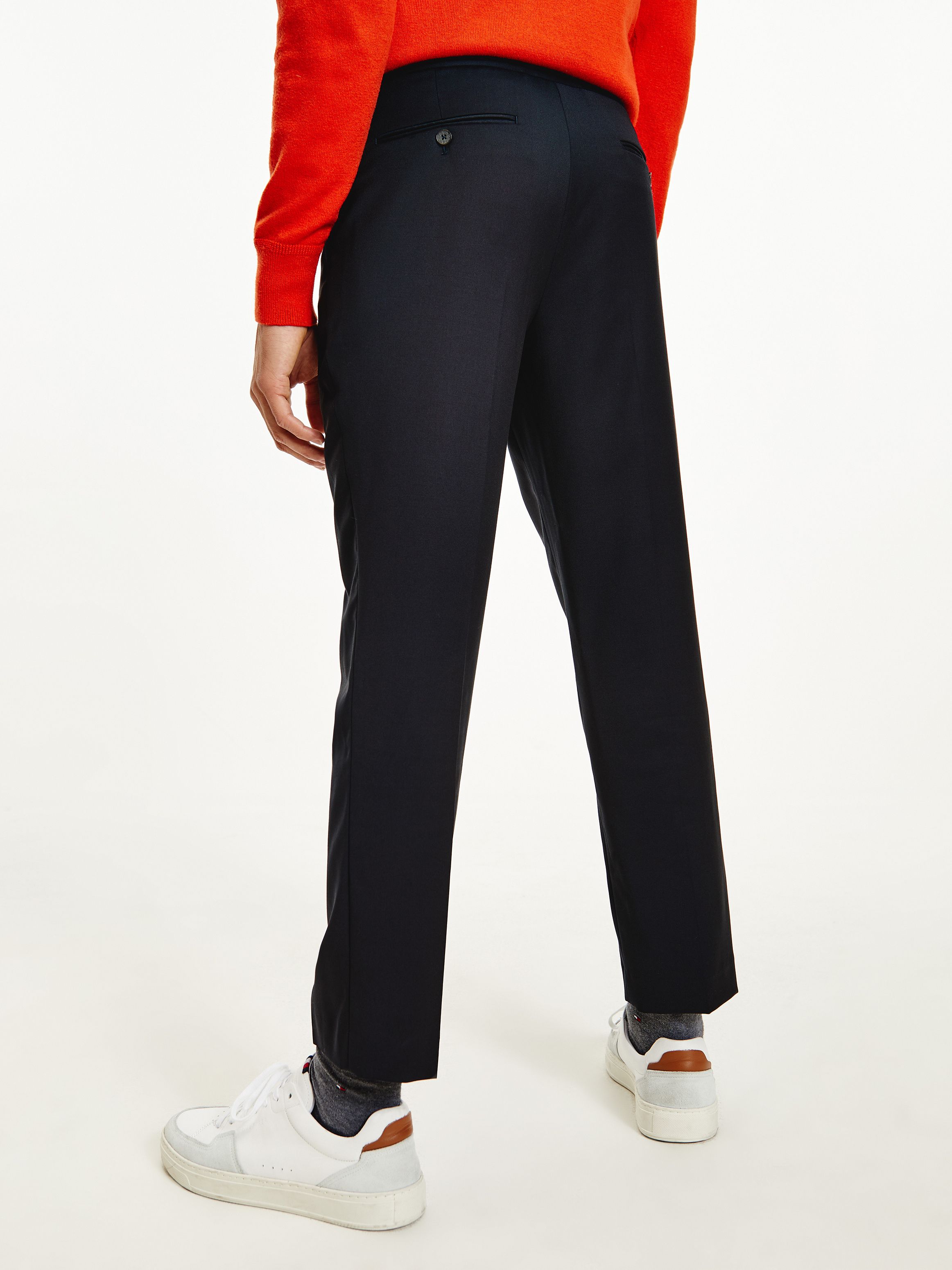 • Stretch virgin wool • Concealed drawstring waist • Pressed creases at front and back • Two waist angled pockets • Two back buttoned pockets • Tommy Hilfiger branding • Tommy Hilfiger enamel flag on back