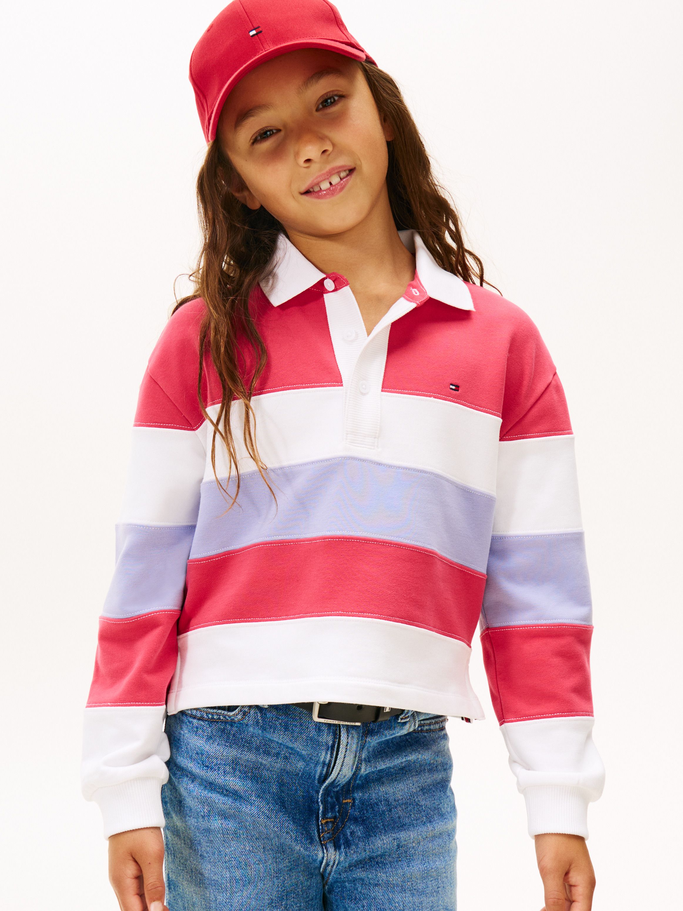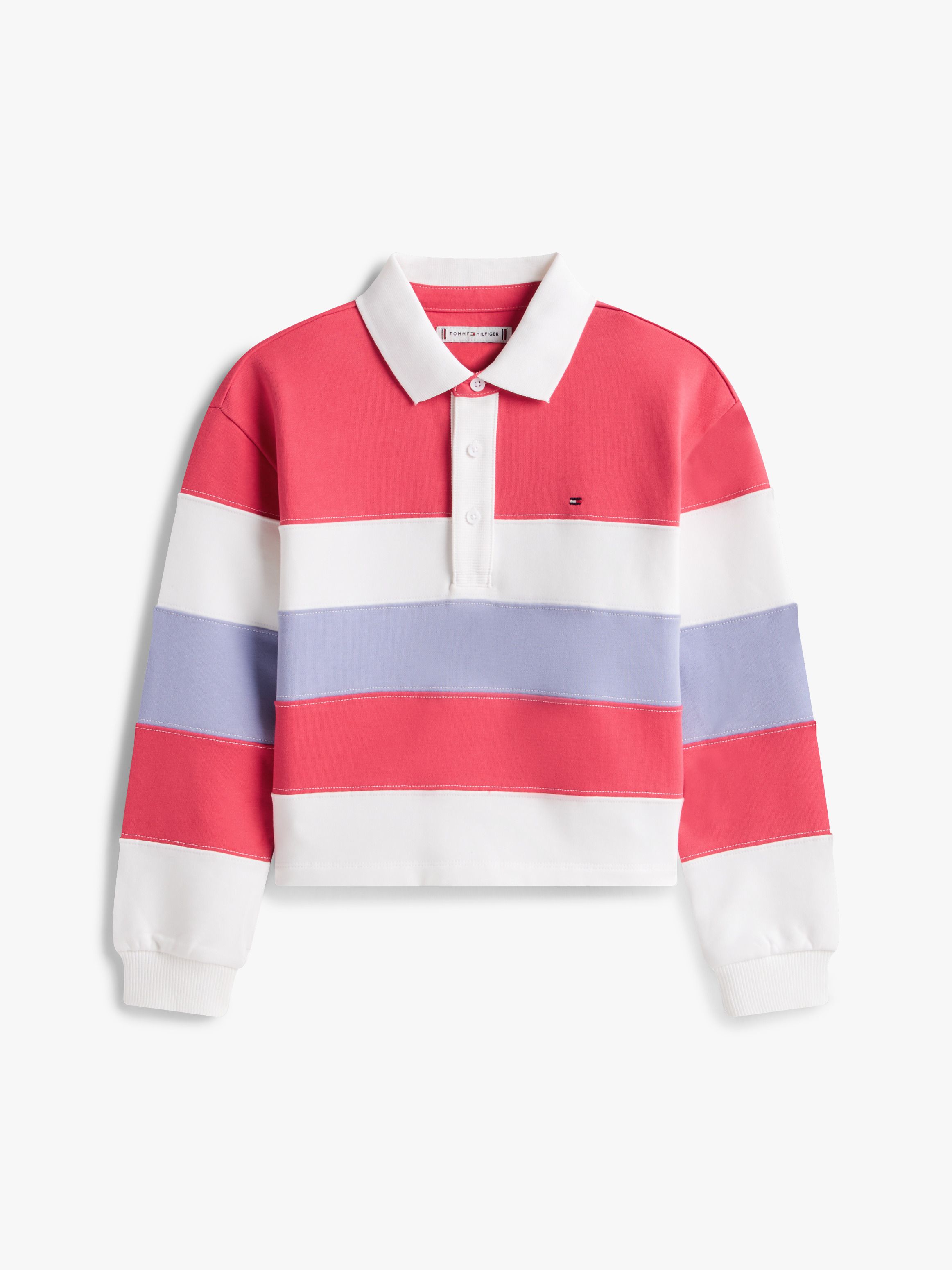 • Stretch peached cotton blend terry • Colour-blocked design • Polo collar • Three-button placket • Rib-knit cuffs and hem • Tommy Hilfiger branding • Tommy Hilfiger flag embroidery on chest