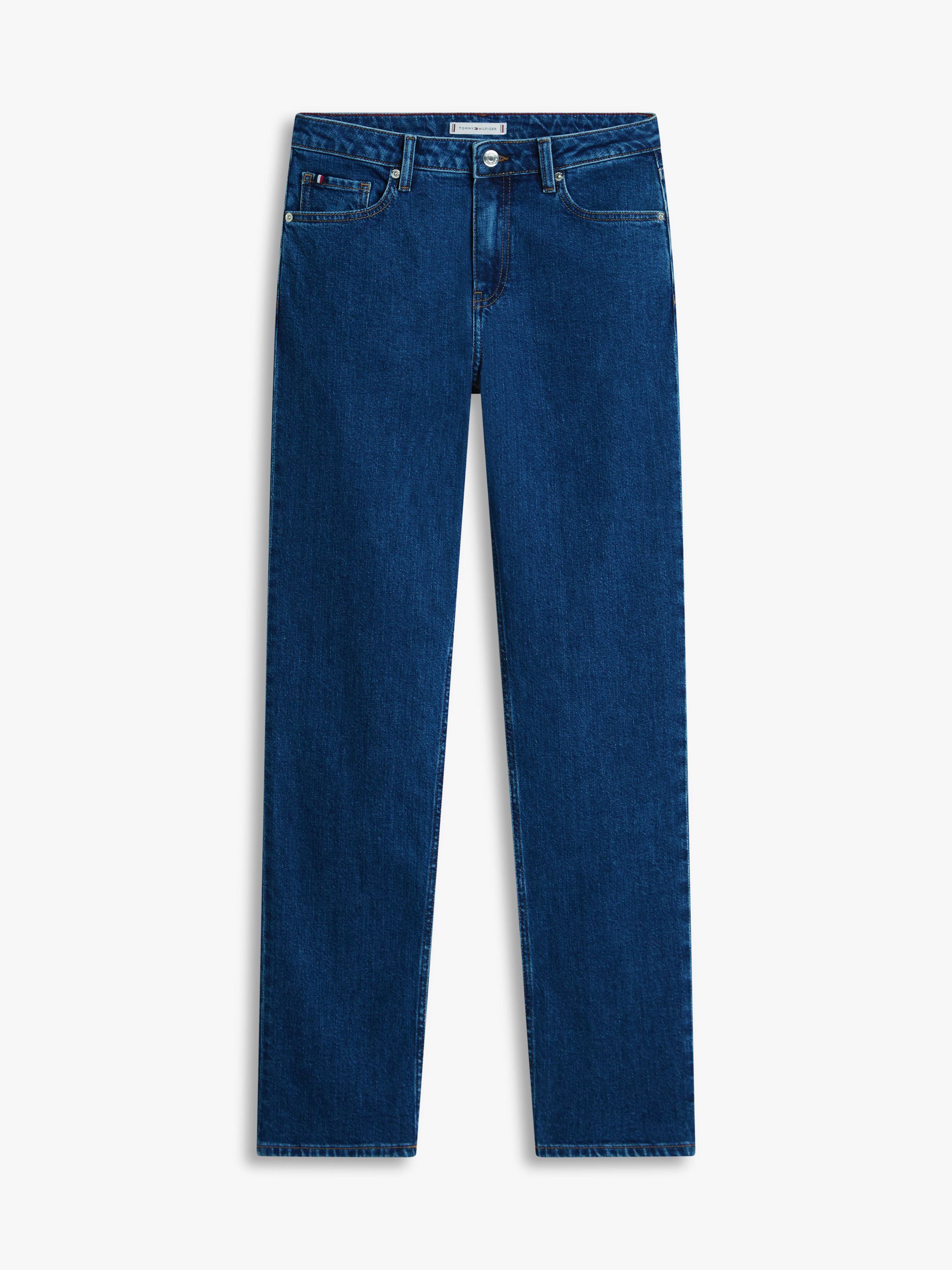 • Stretch cotton denim • Fading on seams • Zip with button closure • Five-pocket styling • Branded metal buttons and rivets • Signature tape on coin pocket • Tommy Hilfiger branding