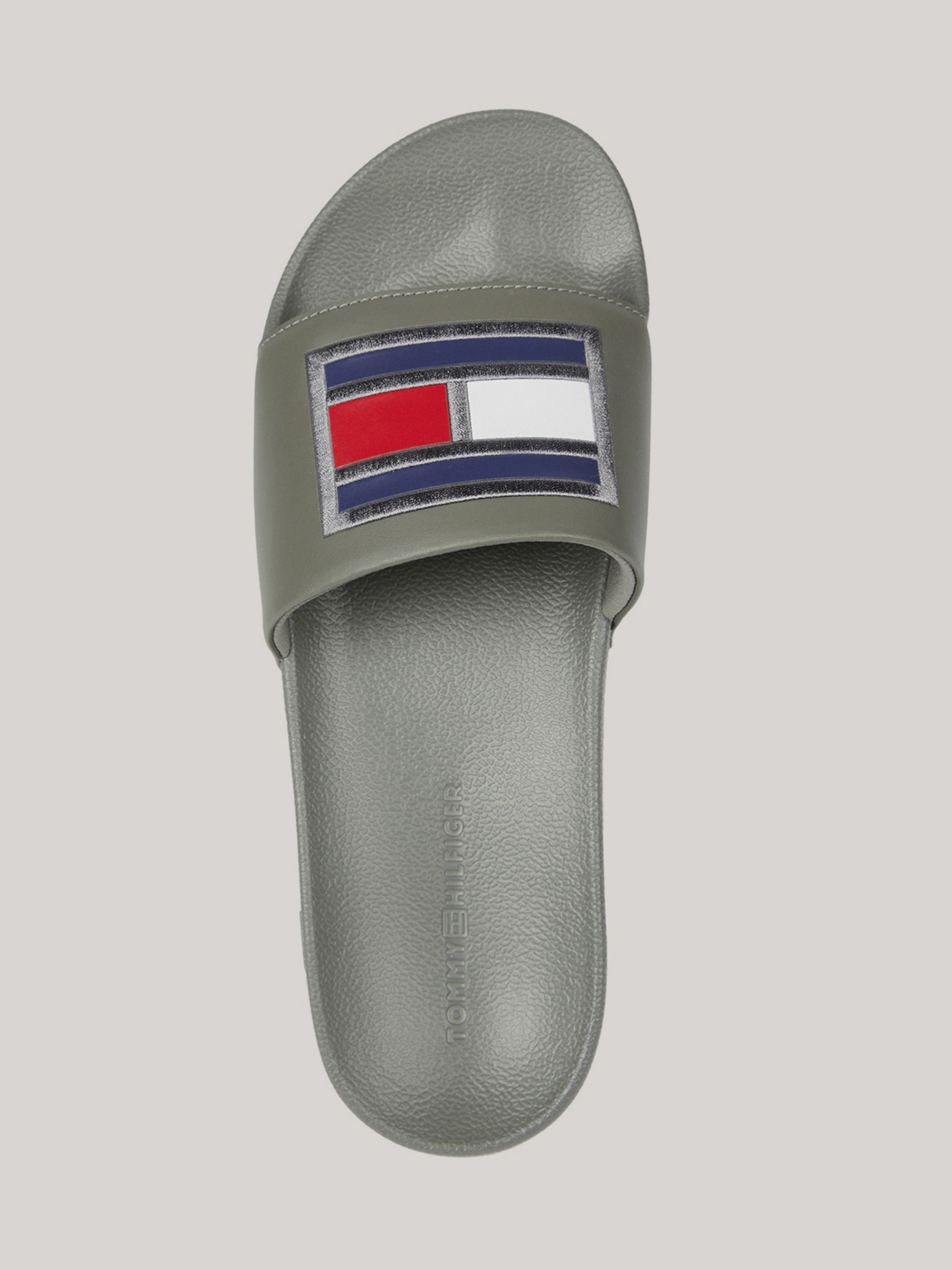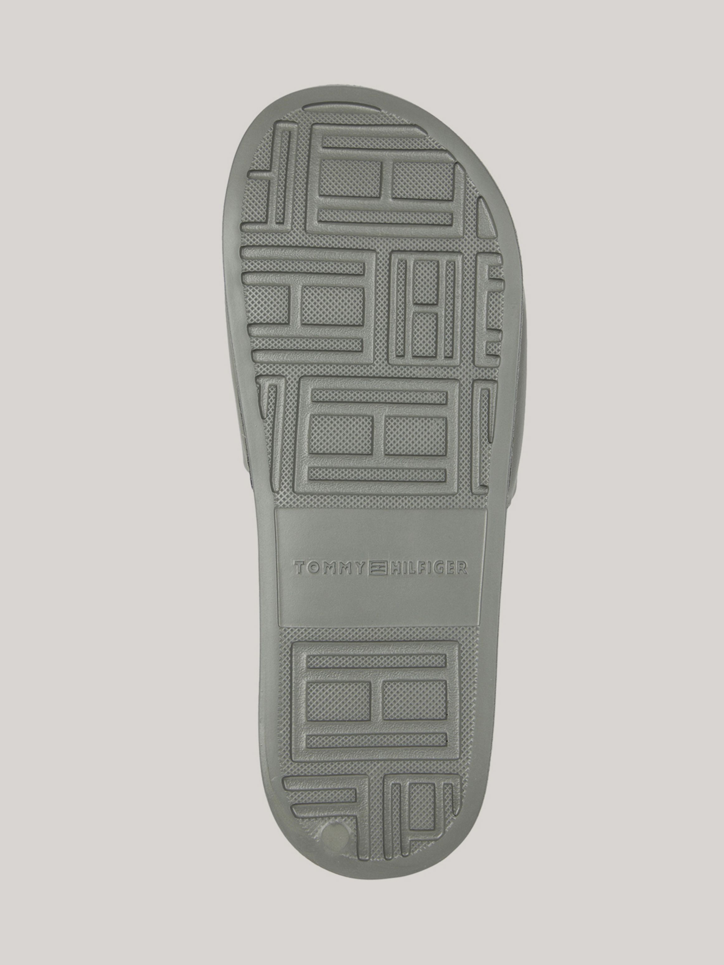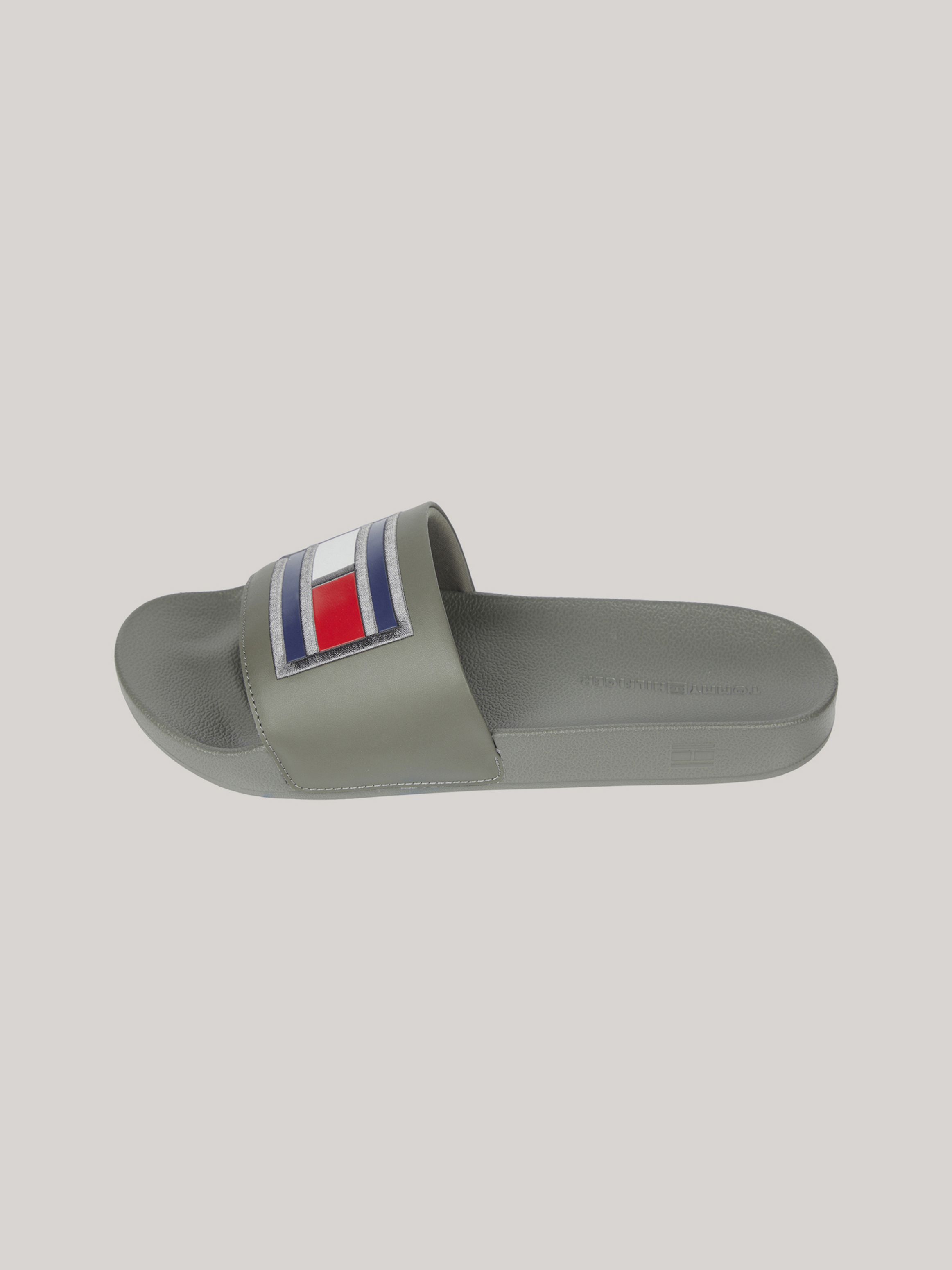 • Mixed upper: polyurethane, polyester • Polyester contoured footbed • EVA outsole • Oversized Tommy Hilfiger flag appliqué on strap • Tommy Hilfiger branding • Tommy Hilfiger flag debossed on midsole