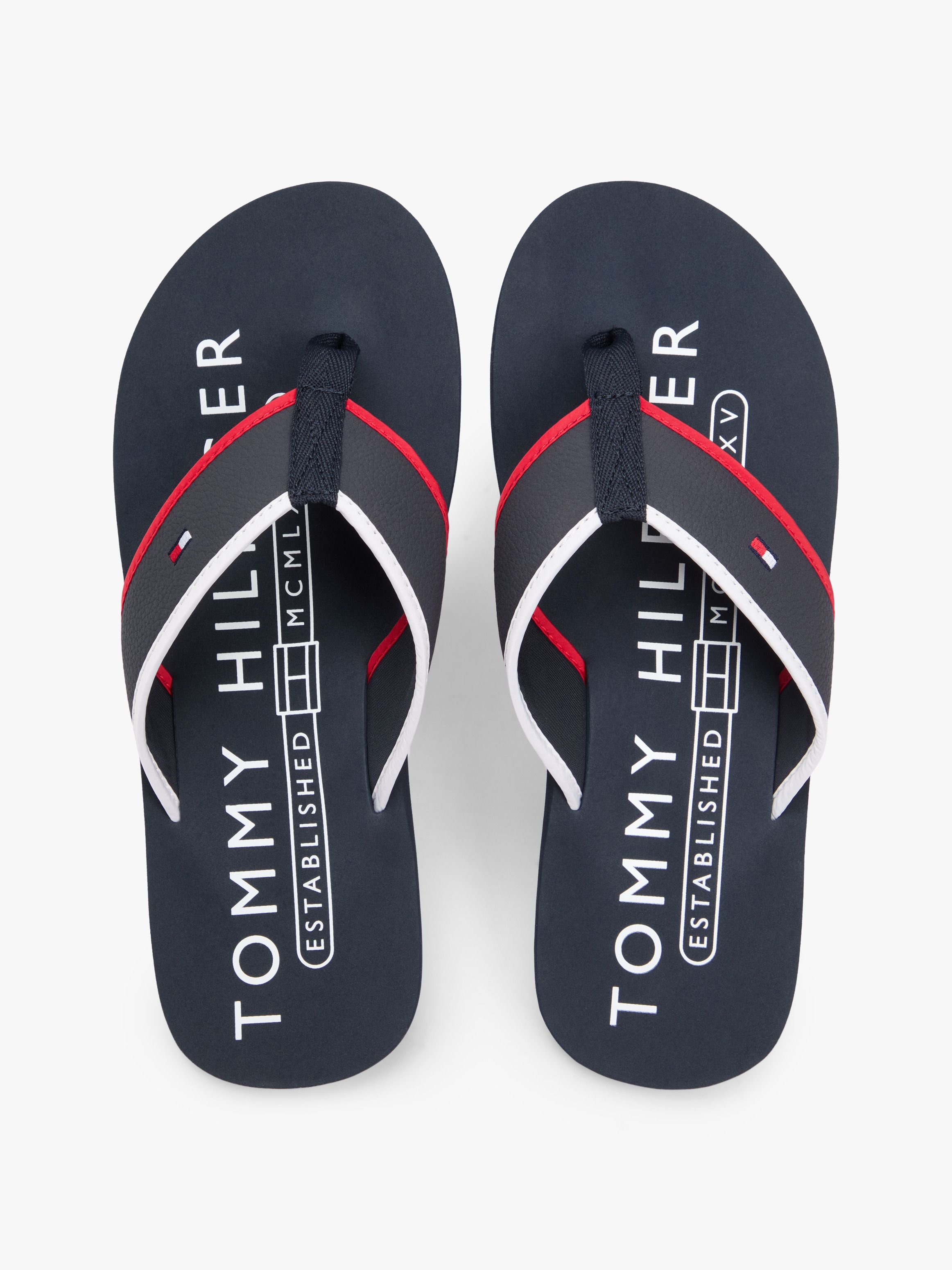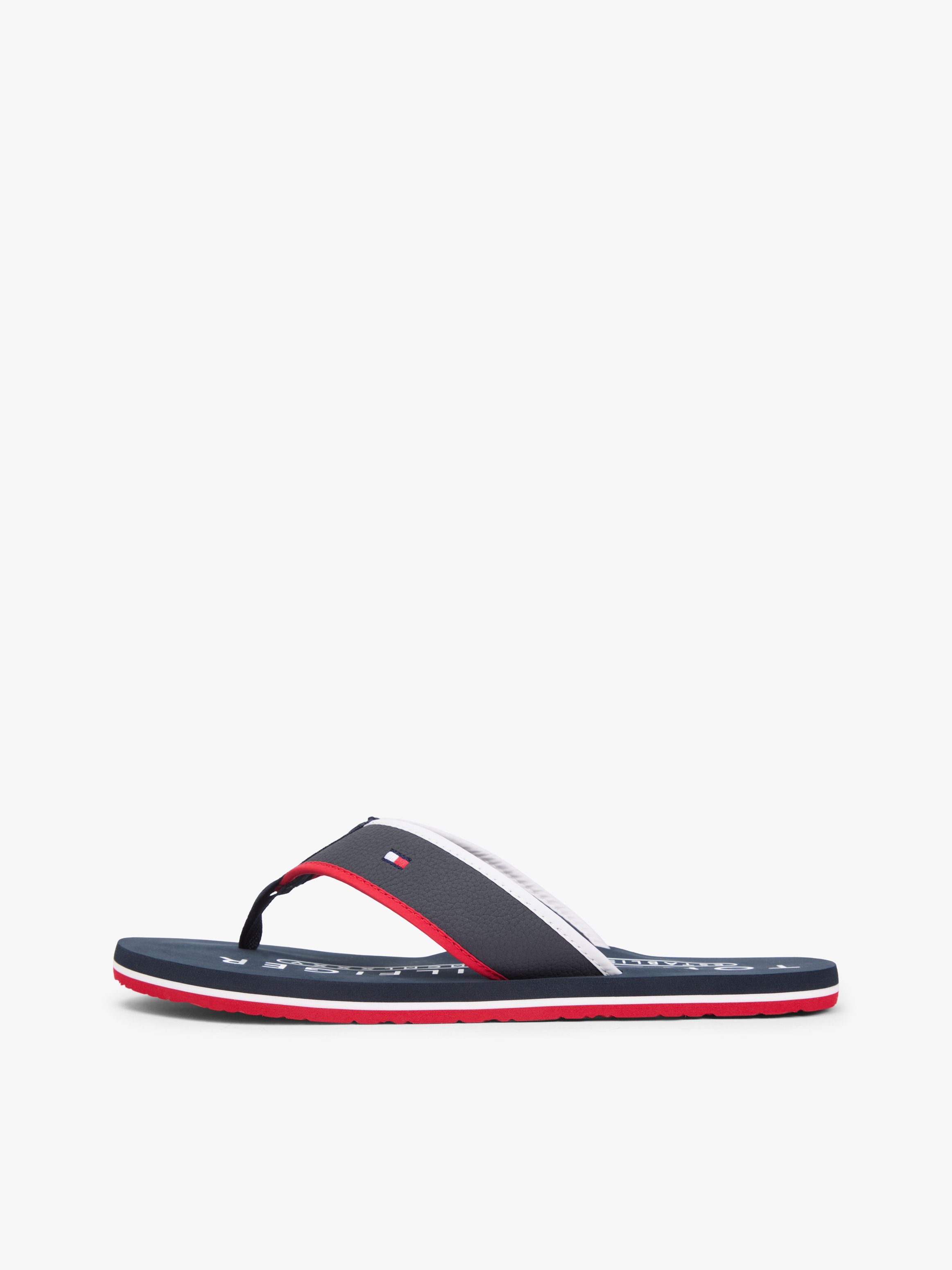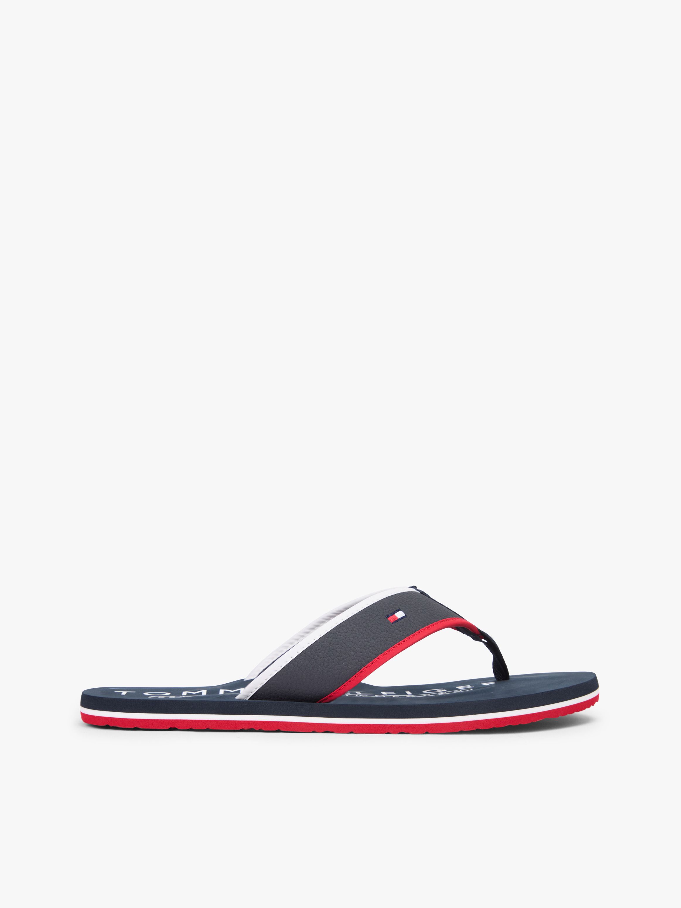 • Mixed upper: polyurethane, polyester • Nylon footbed • EVA outsole • Stripe detail on midsole • Webbing toe post • Tommy Hilfiger logo on footbed • Tommy Hilfiger branding • Tommy Hilfiger flag embroidery on strap