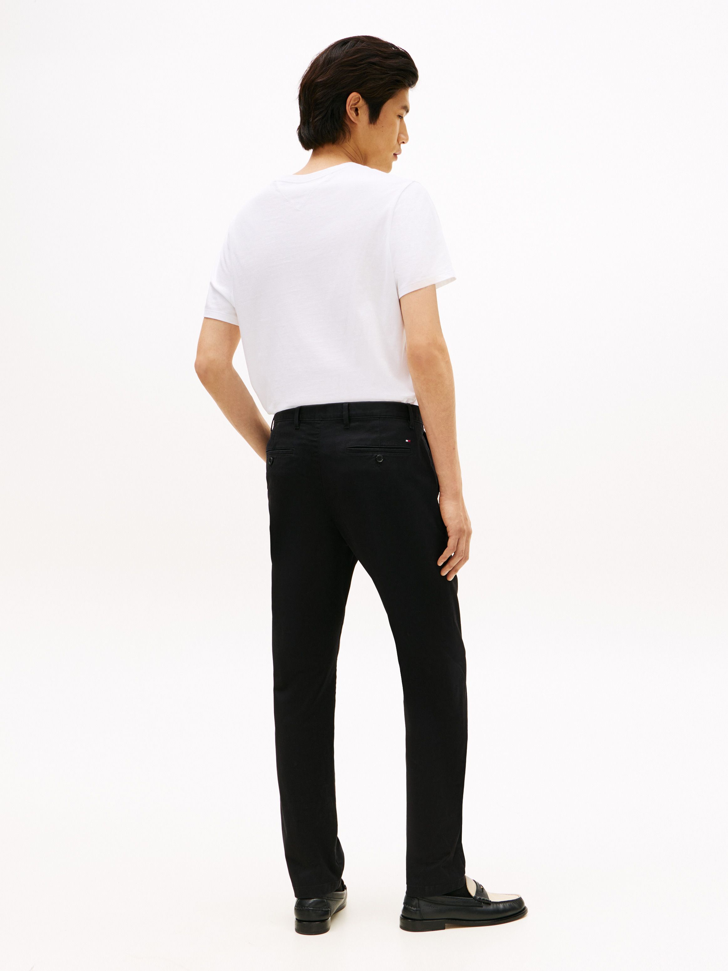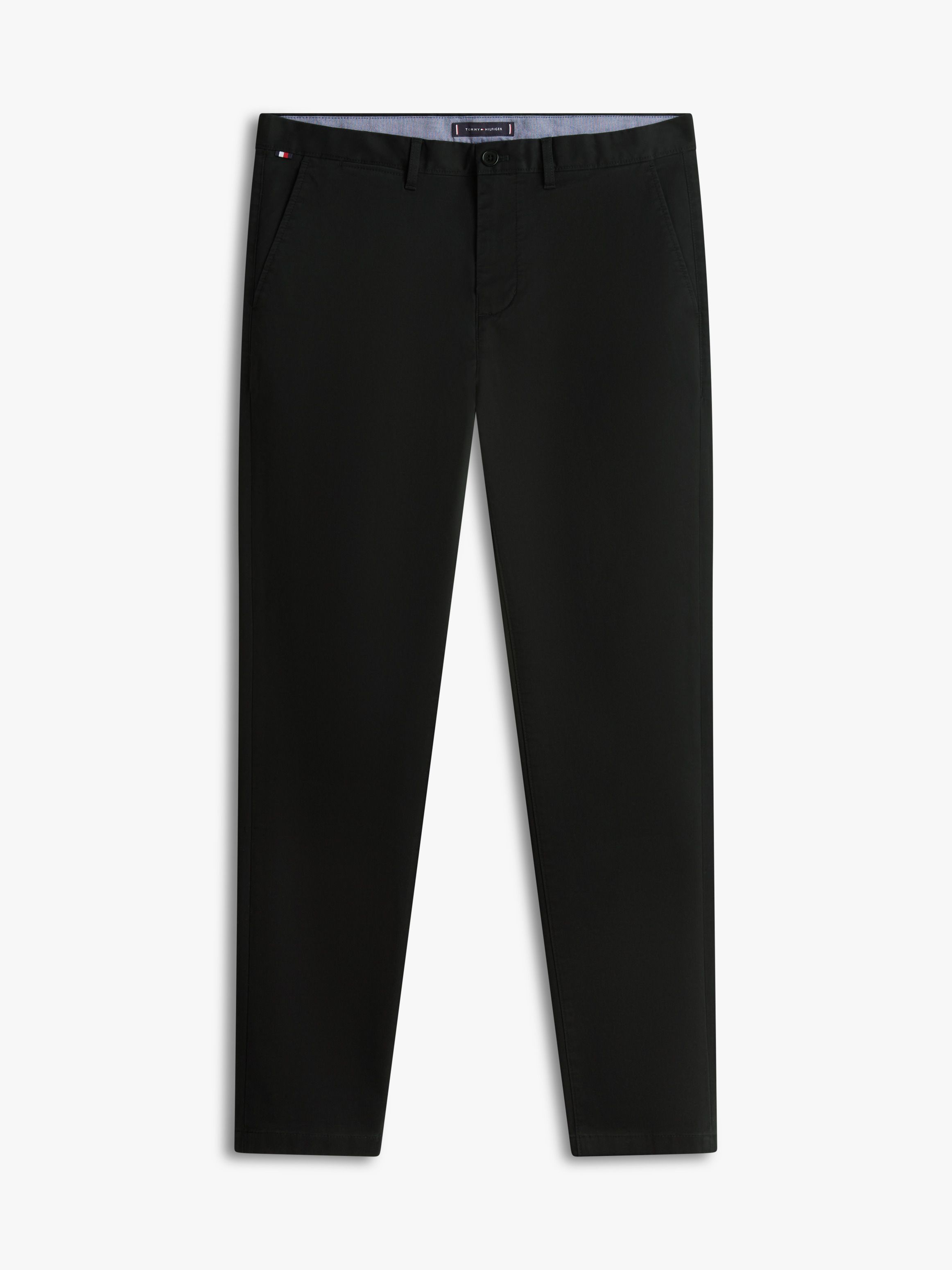 • Stretch cotton twill • Zip with button closure • Two waist angled slip pockets • Two back buttoned welt pockets • Signature tape on hip • Tommy Hilfiger branding • Tommy Hilfiger flag embroidery on back