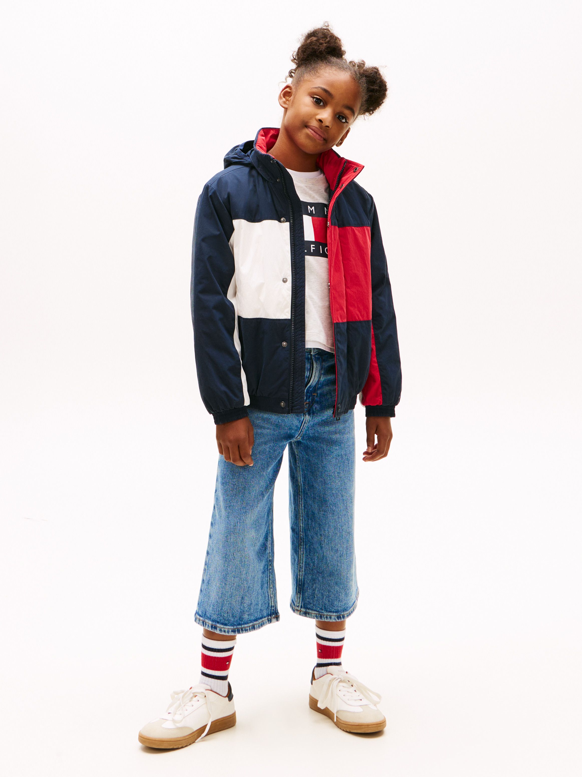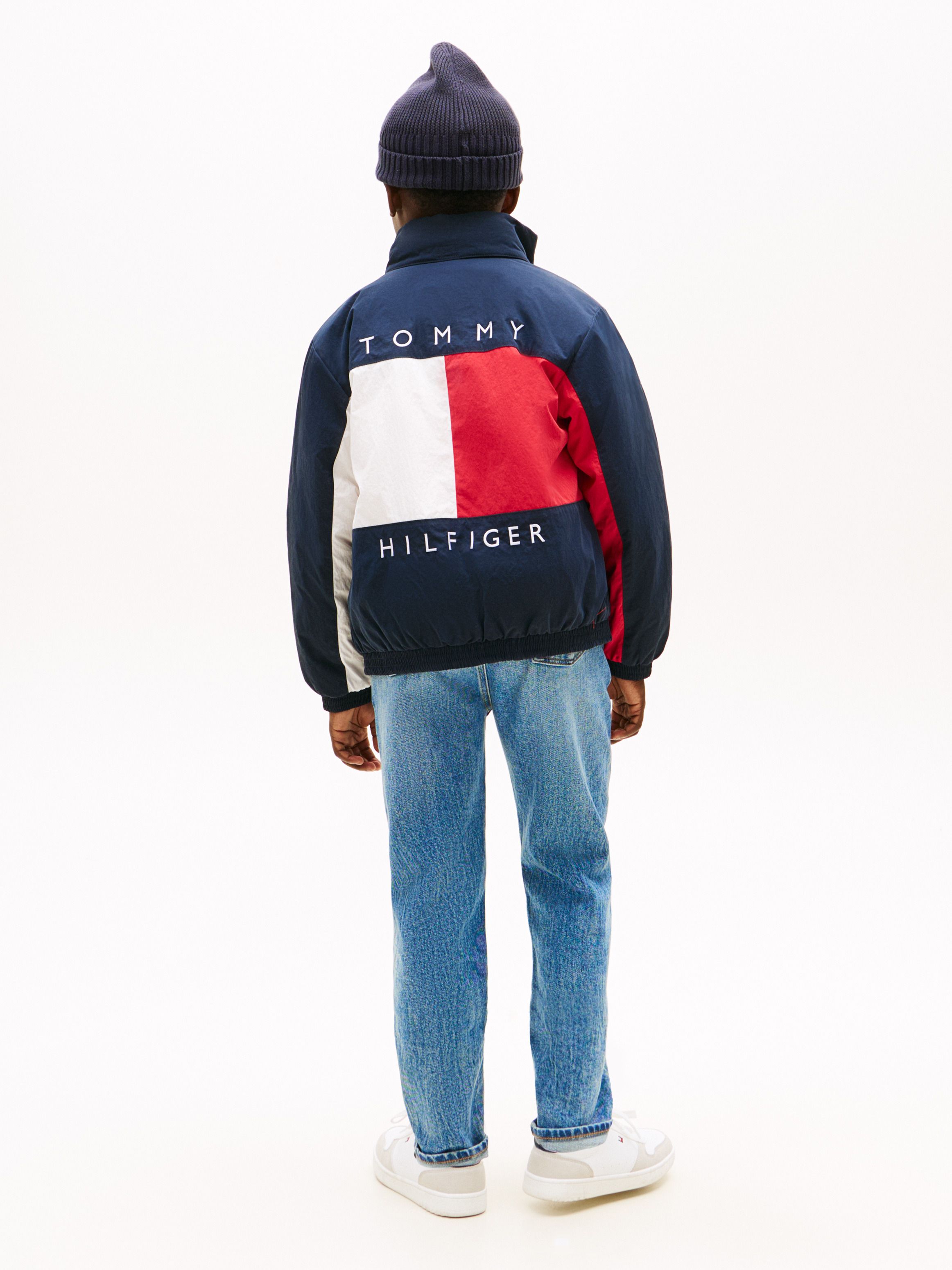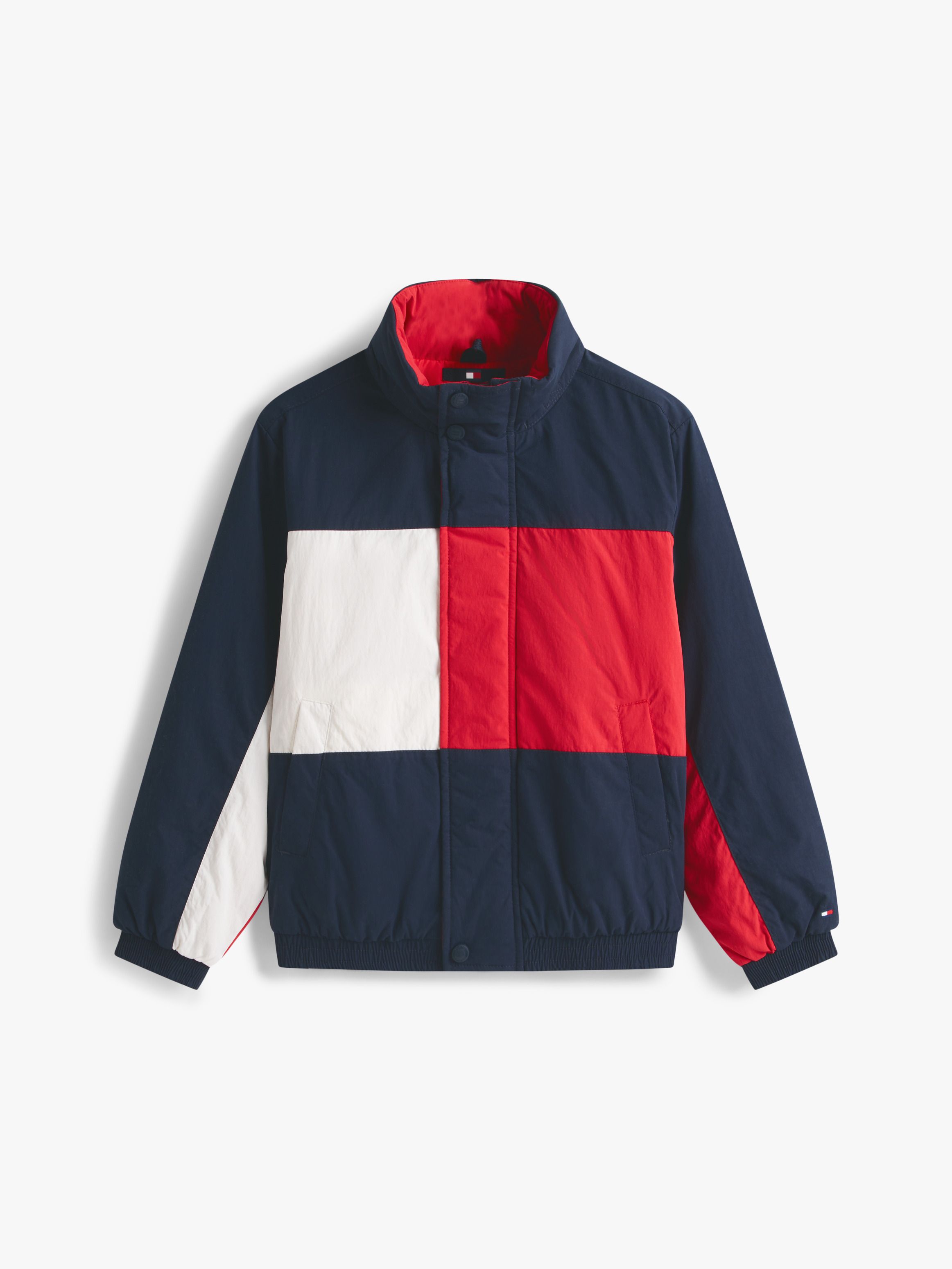 • Nylon • All-over colour-blocked flag design • Packable hood • Stand-up collar • Concealed zip with snap-button closure • Two waist angled welt pockets • One interior welt pocket • Elasticated cuffs and hem • Tommy Hilfiger logo embroidery on back • Tommy Hilfiger branding • Tommy Hilfiger flag embroidery on cuff