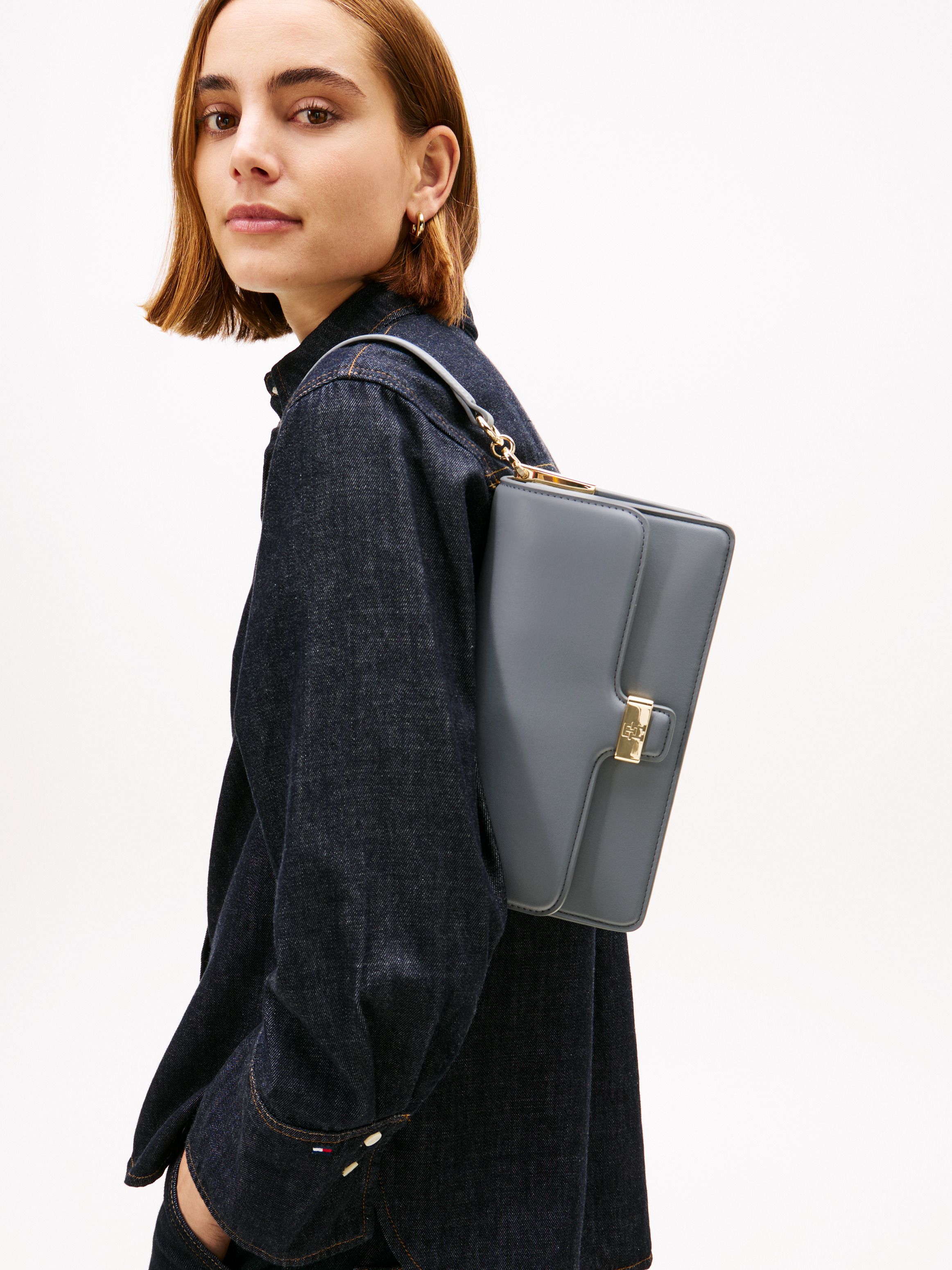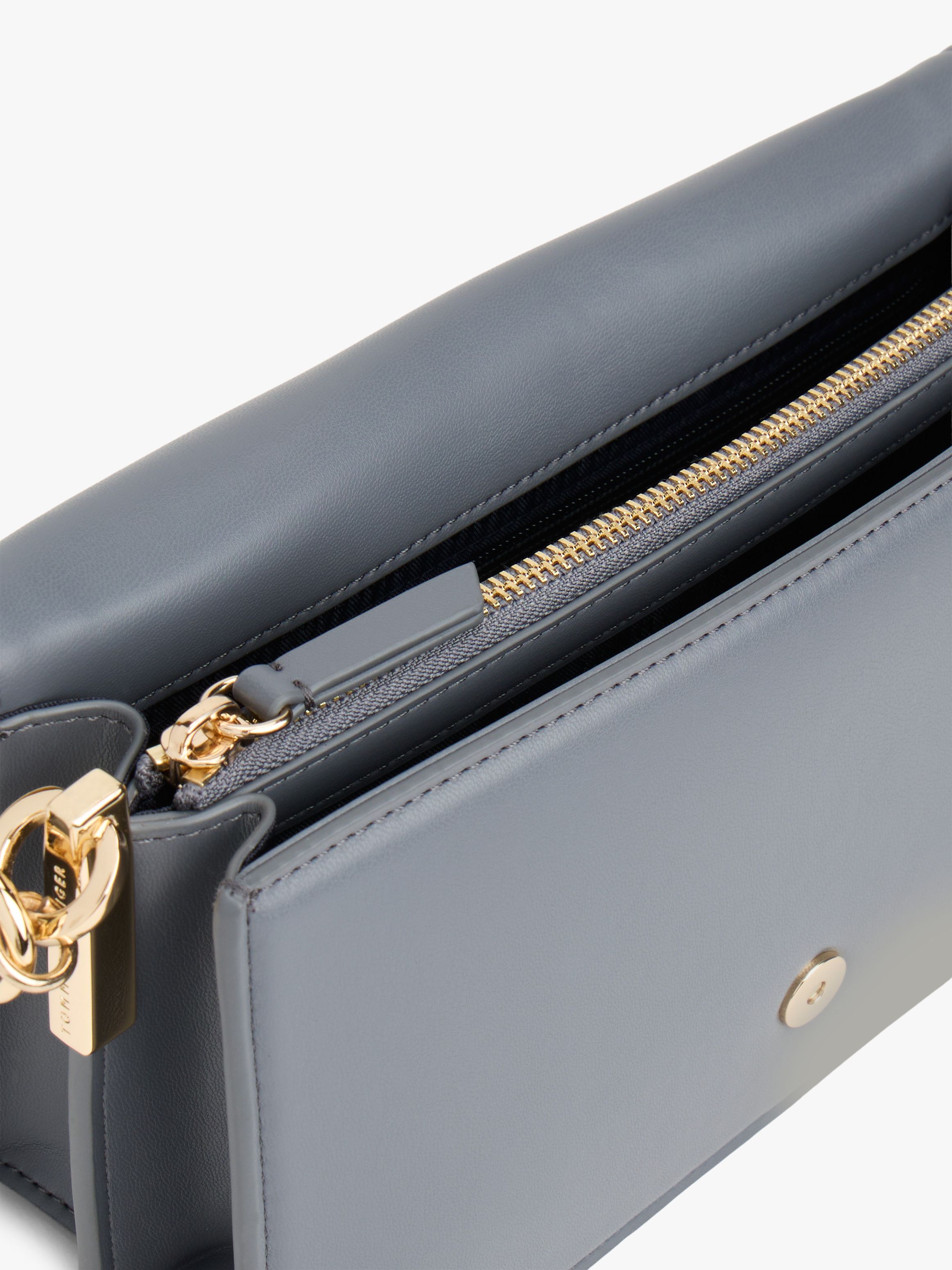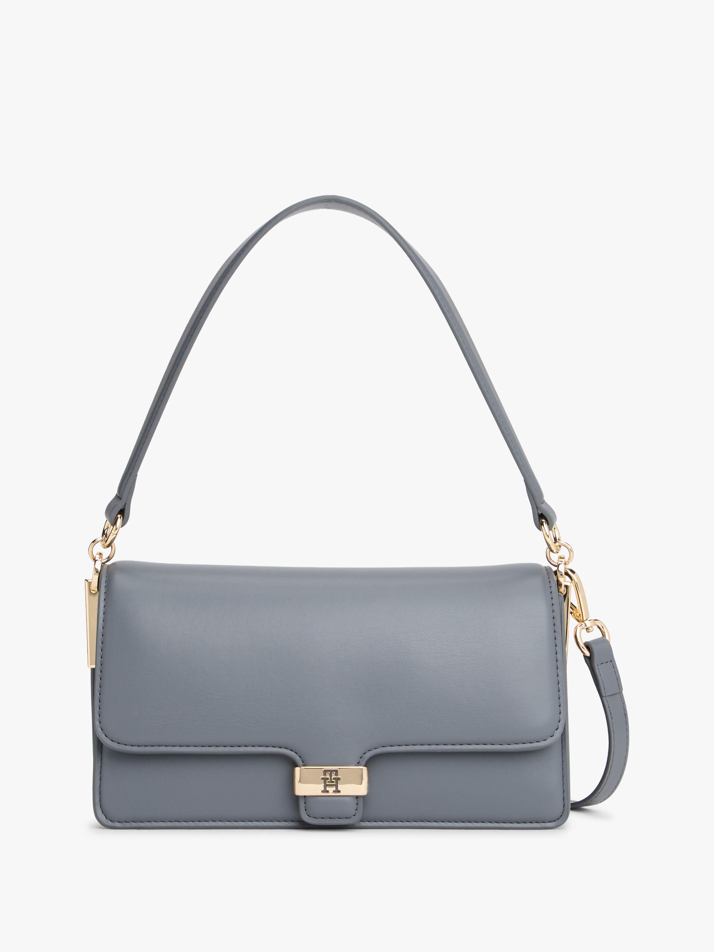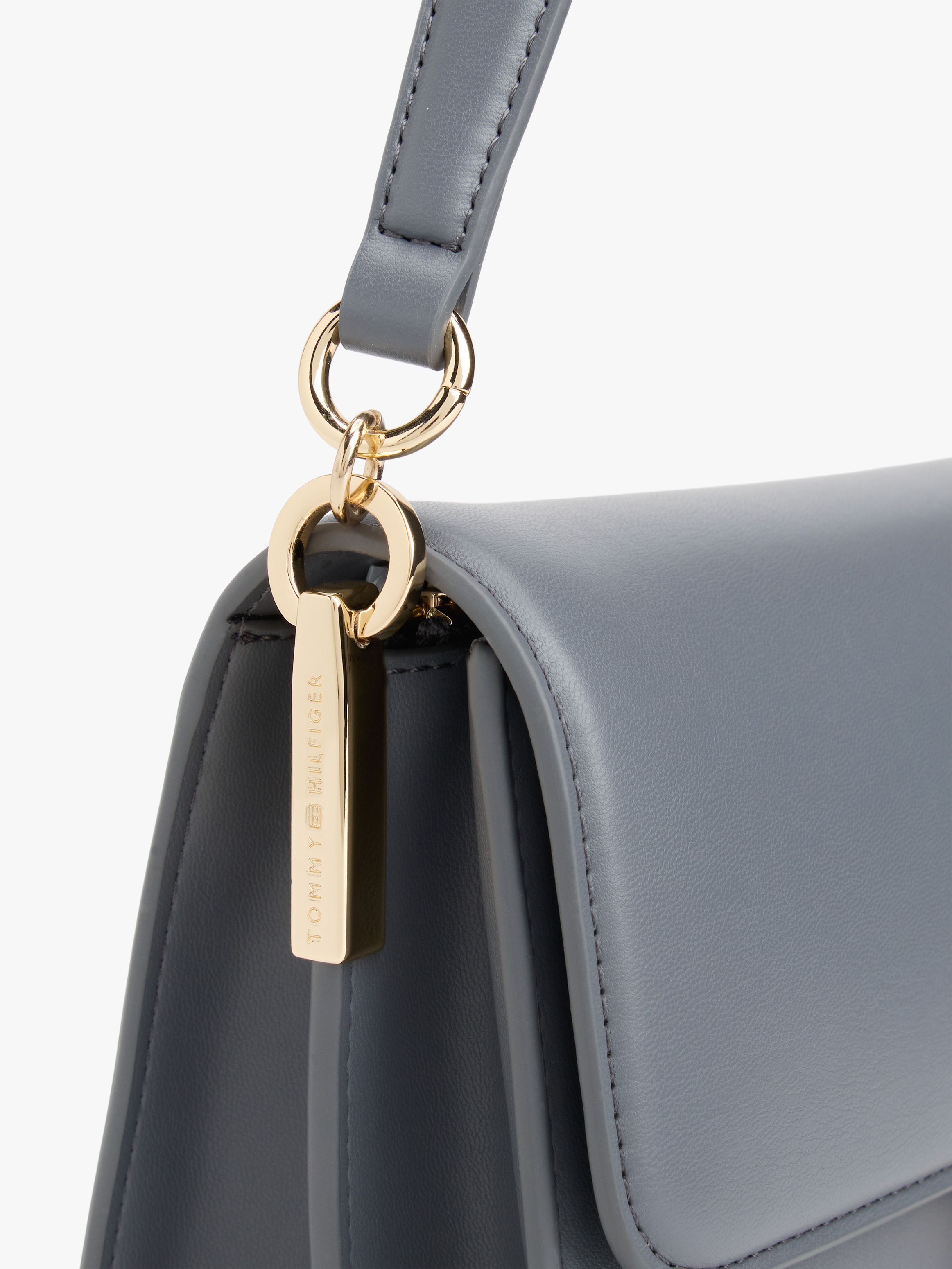 • Smooth finish • Metal hardware on closure and sides • Magnetic flap closure • Shoulder strap • Removable crossbody strap • Two interior compartments • Two interior zipped pockets • Tommy Hilfiger logo debossed on hardware • TH monogram debossed on closure • Tommy Hilfiger branding