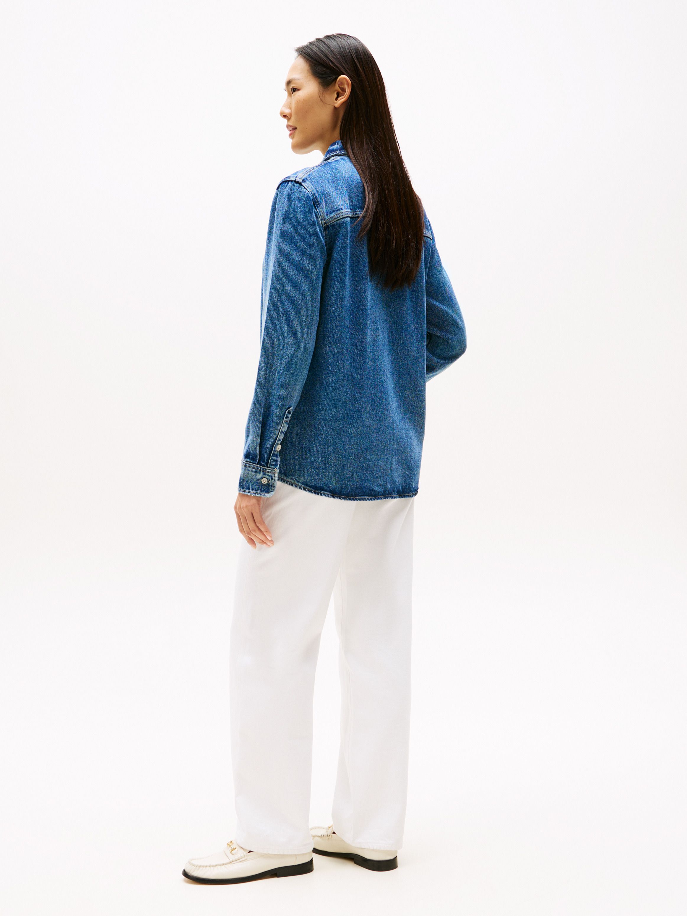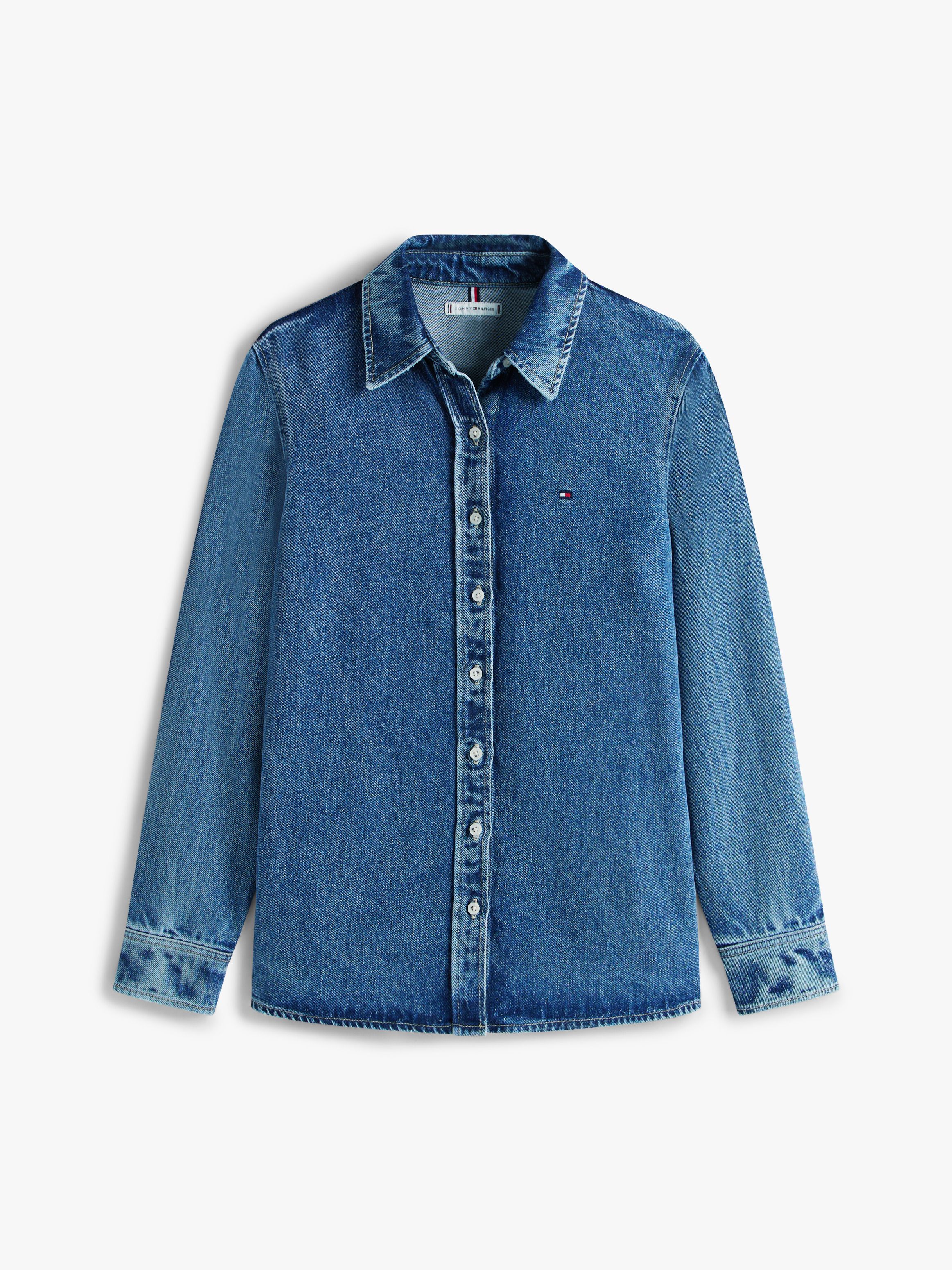• Lyocell denim • Fading on seams and cuffs • Semi-spread collar • One-button cuffs • Tommy Hilfiger branding • Tommy Hilfiger flag embroidery on chest