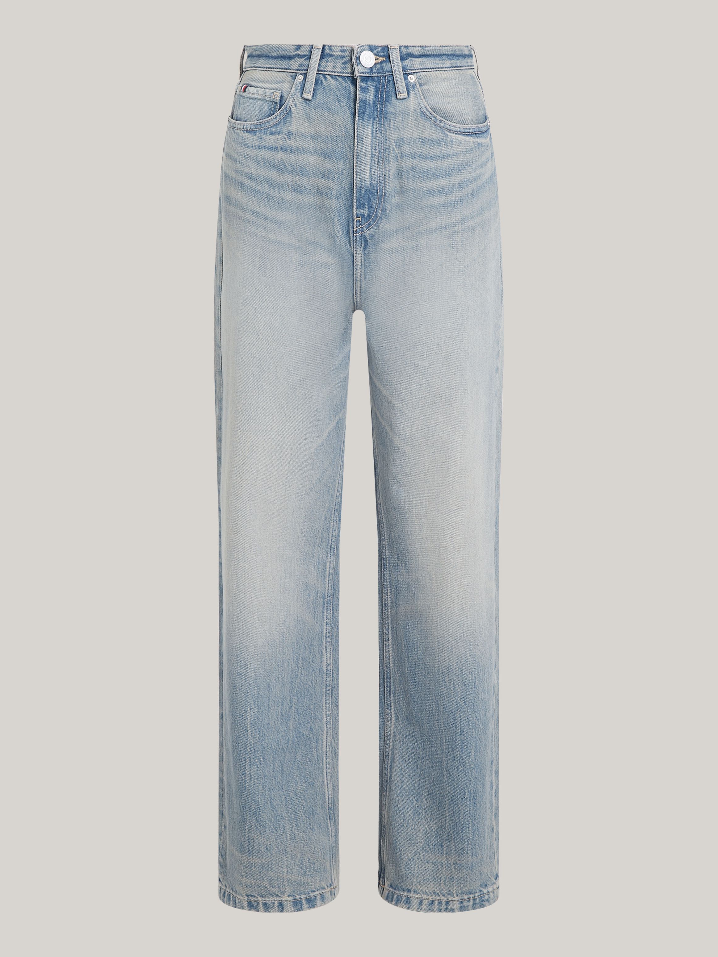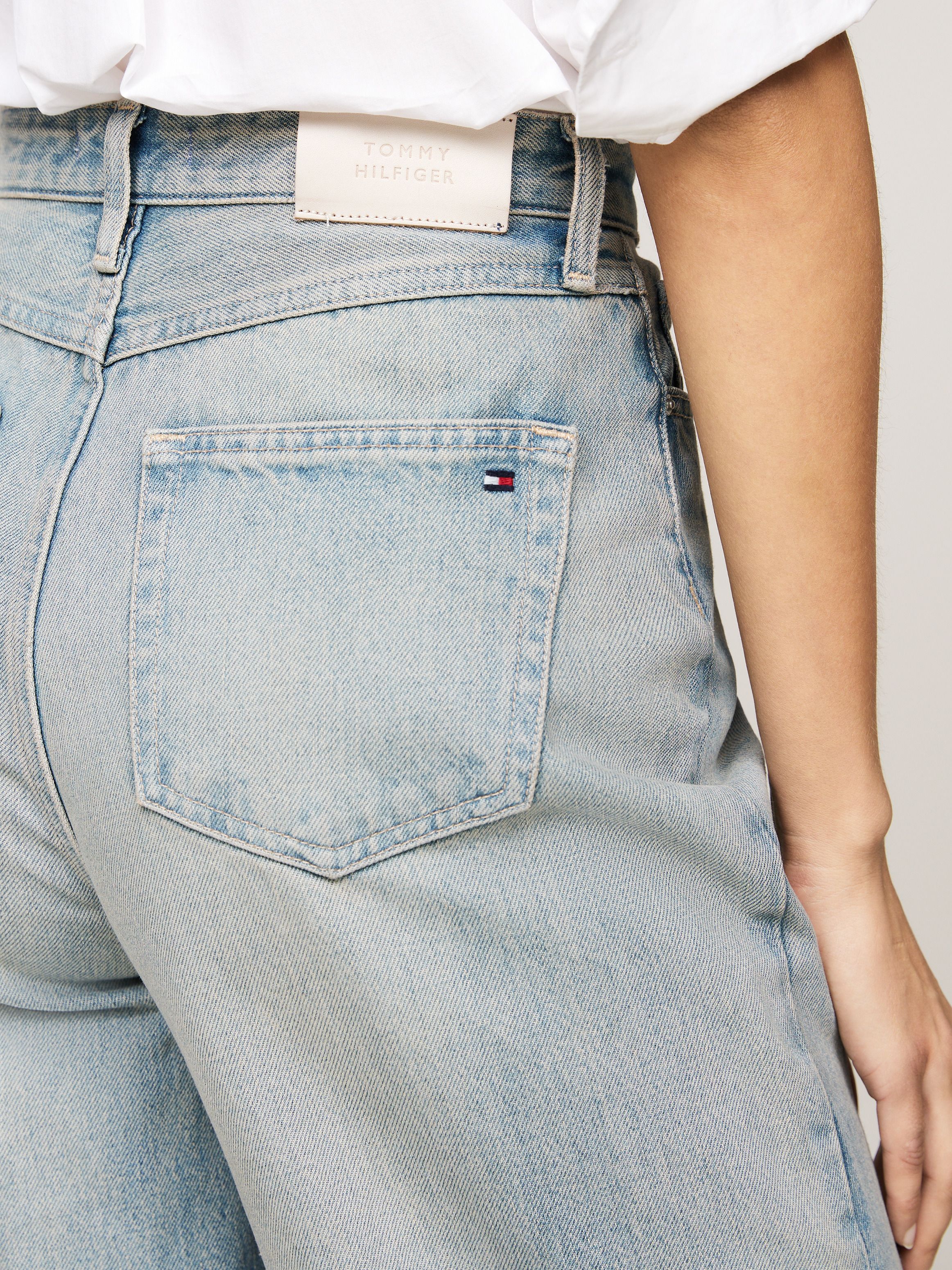 • Rigid denim • Fading on front and back • Whiskering on thighs • Zip with button closure • Five-pocket styling • Tommy Hilfiger branding • Tommy Hilfiger flag embroidery on back