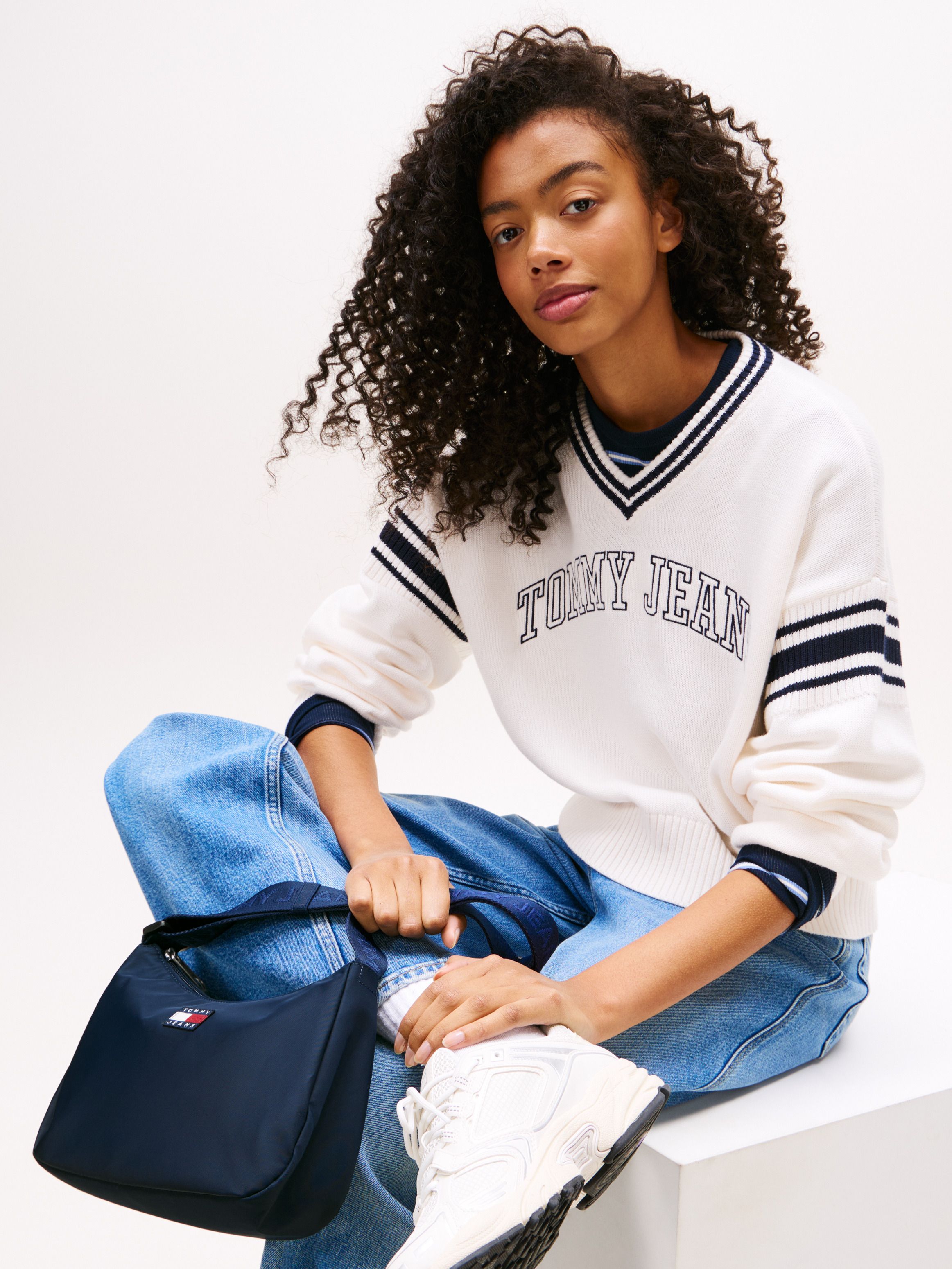 • Smooth finish • Zip closure • Adjustable webbing shoulder strap • One main compartment • One interior zipped pocket • Tommy Jeans repeat logo on strap • Tommy badge debossed on zip pull • Tommy badge on front • Tommy Jeans branding