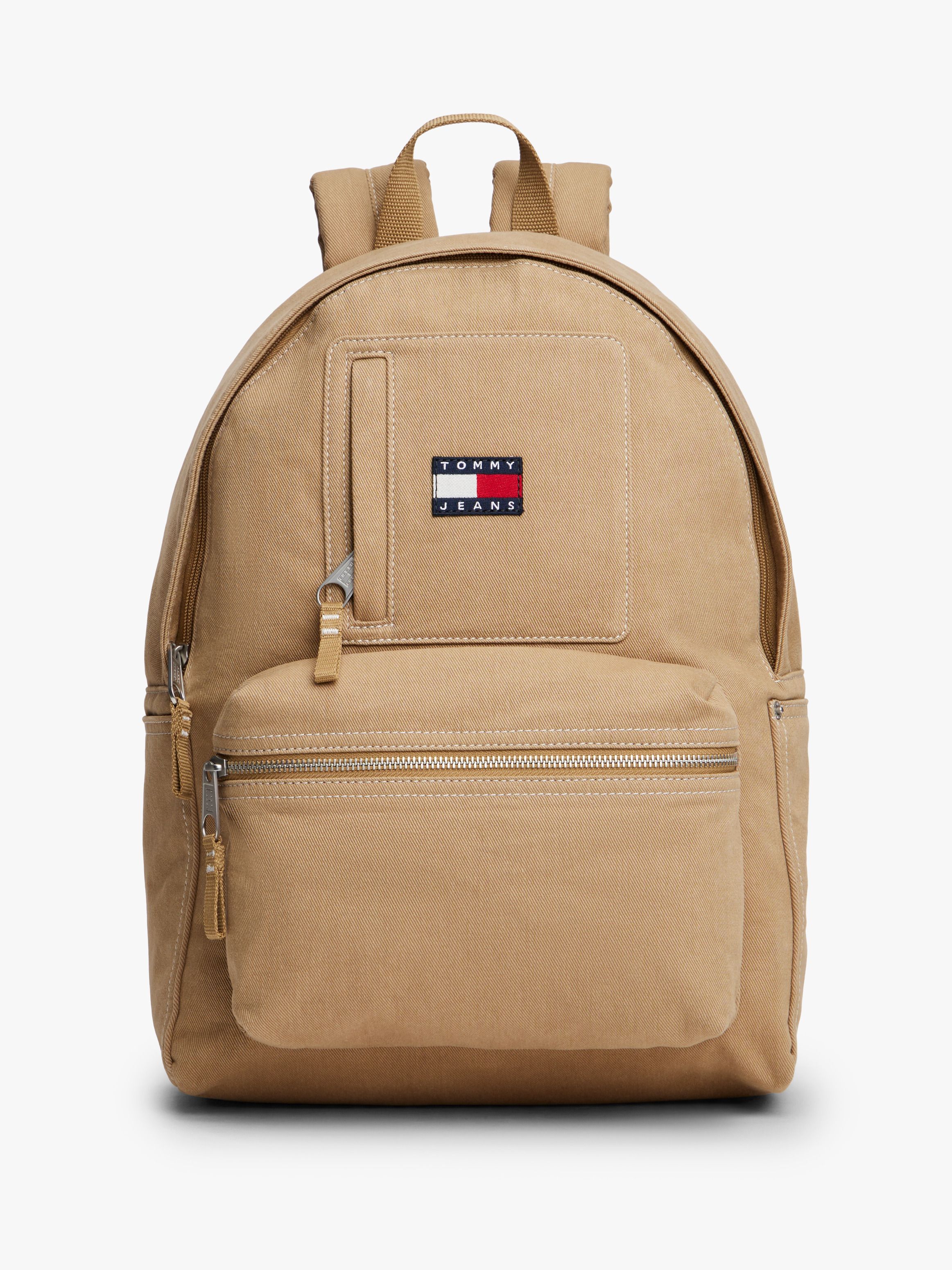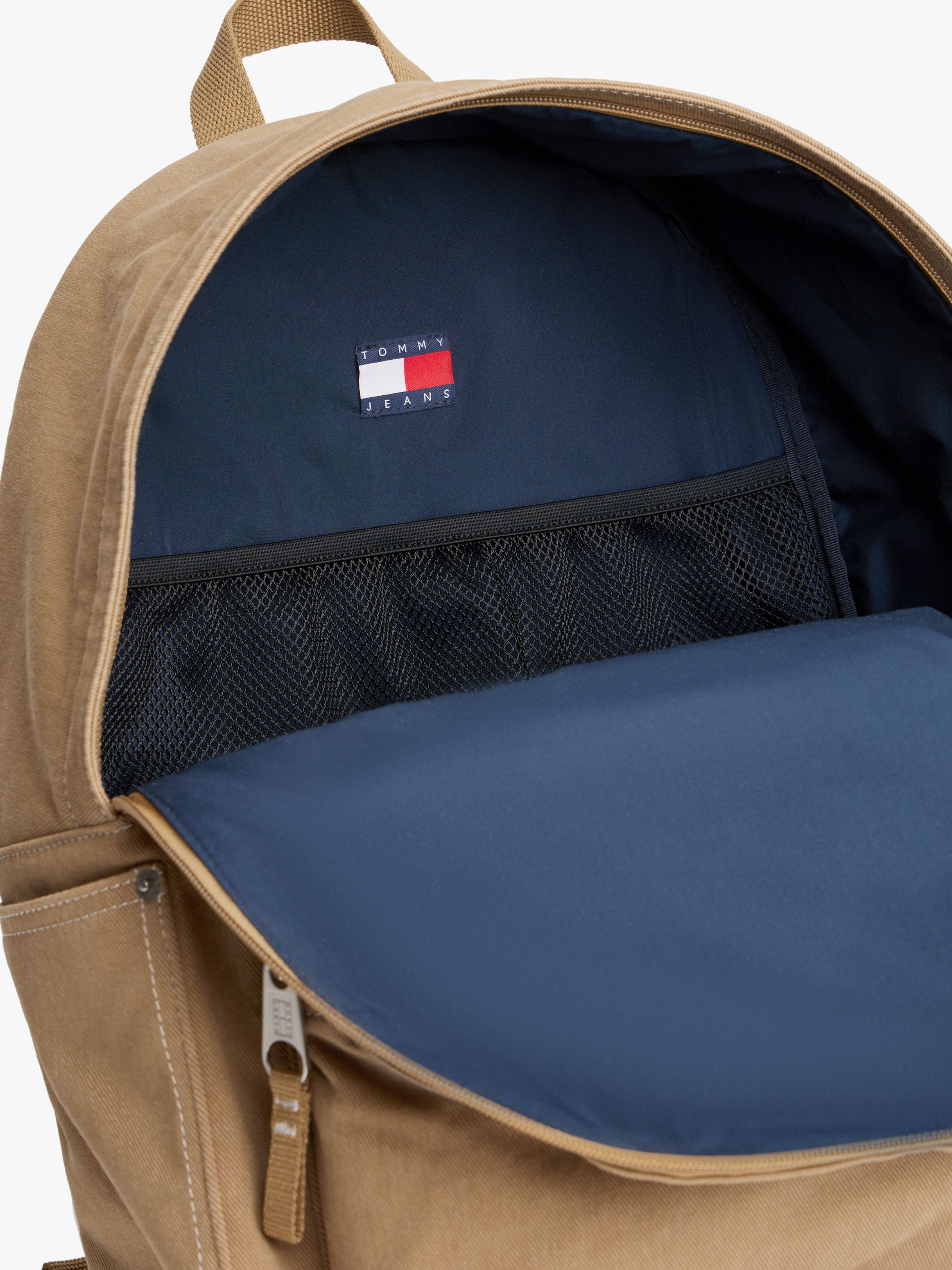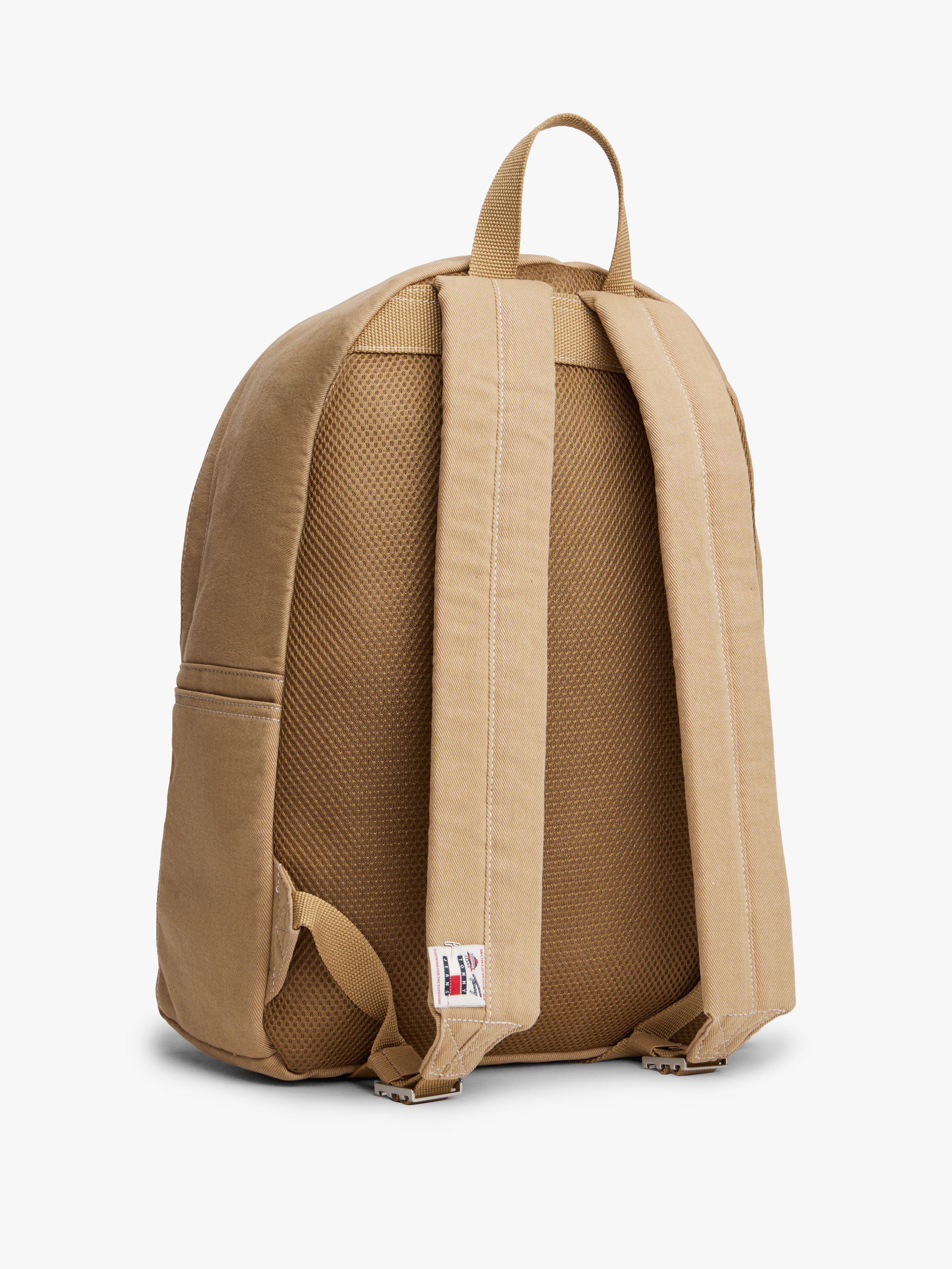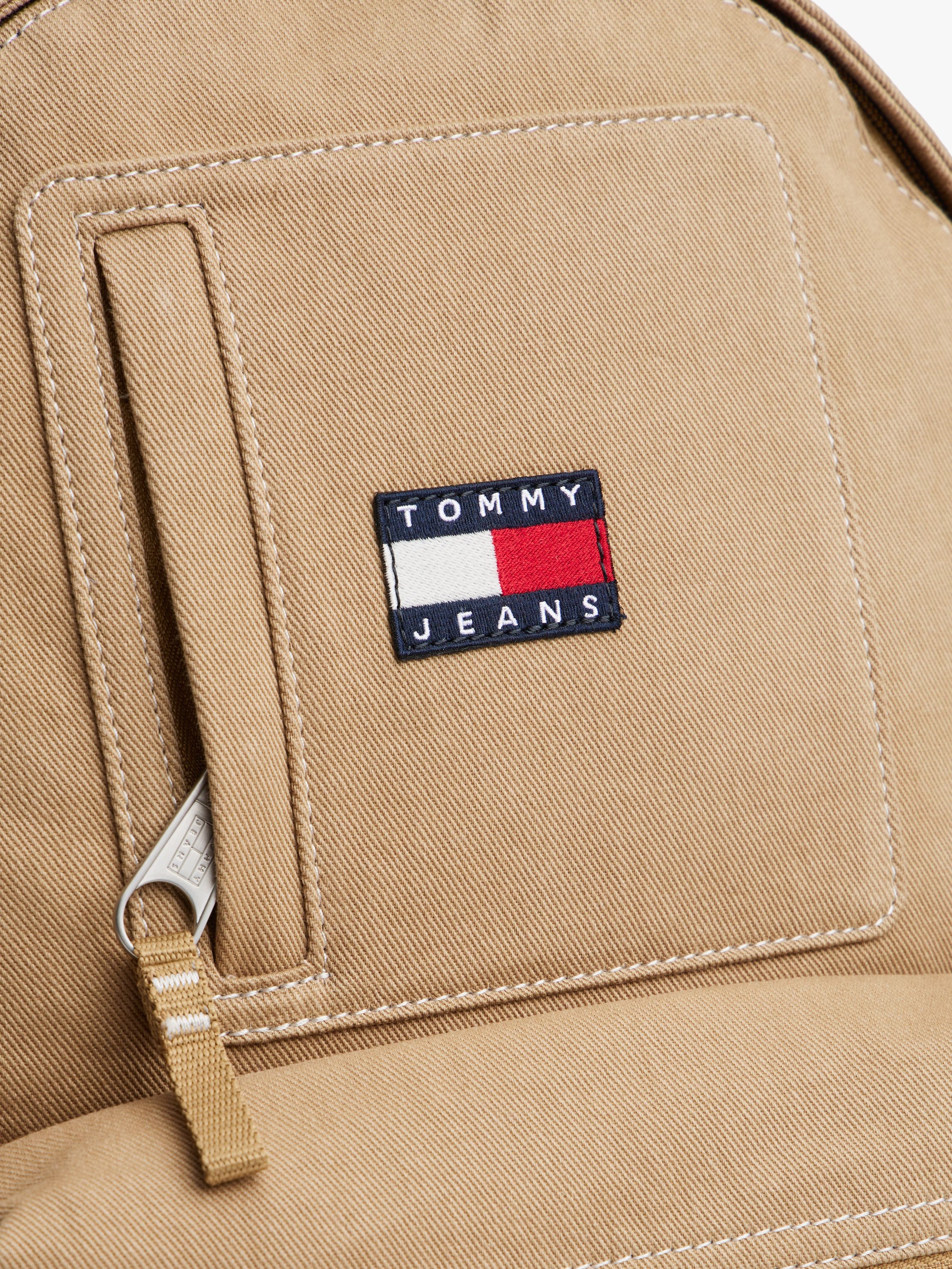 • Pure cotton twill • Dome design • Zip closure • One top handle • Adjustable padded shoulder straps • One main compartment • One interior mesh slip pocket • One exterior welt pocket • One exterior zipped pocket • Padded mesh back • Tommy Jeans outdoors logo patch on shoulder strap • Tommy badge on front • Tommy Jeans branding