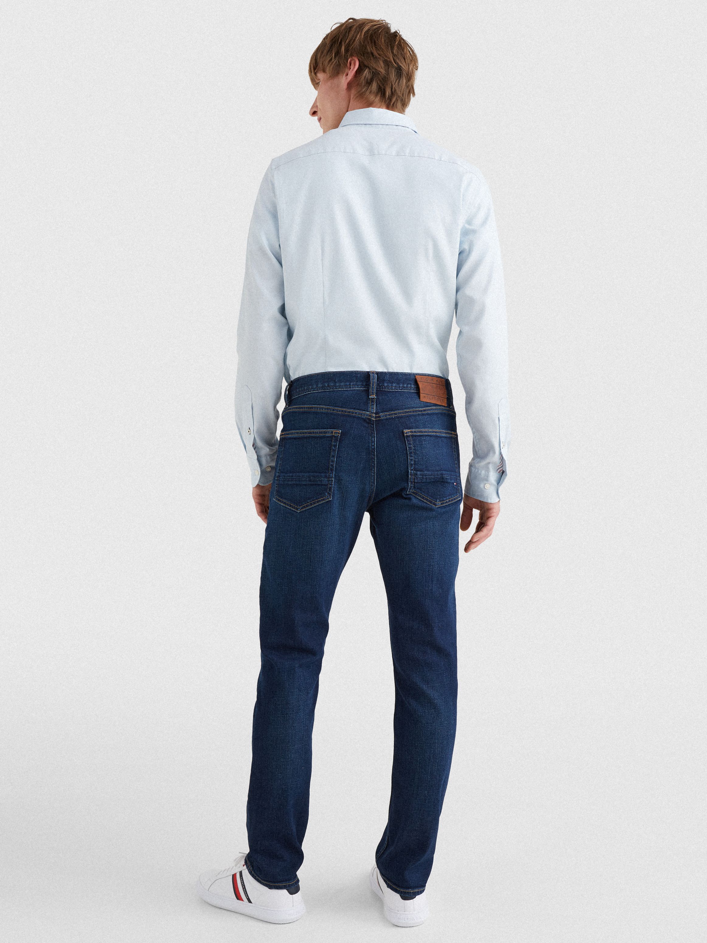 • Stretch cotton blend denim • Fading on legs and seams • Zip with button closure • Five-pocket styling • Tommy Hilfiger branding • Tommy Hilfiger flag embroidery on back