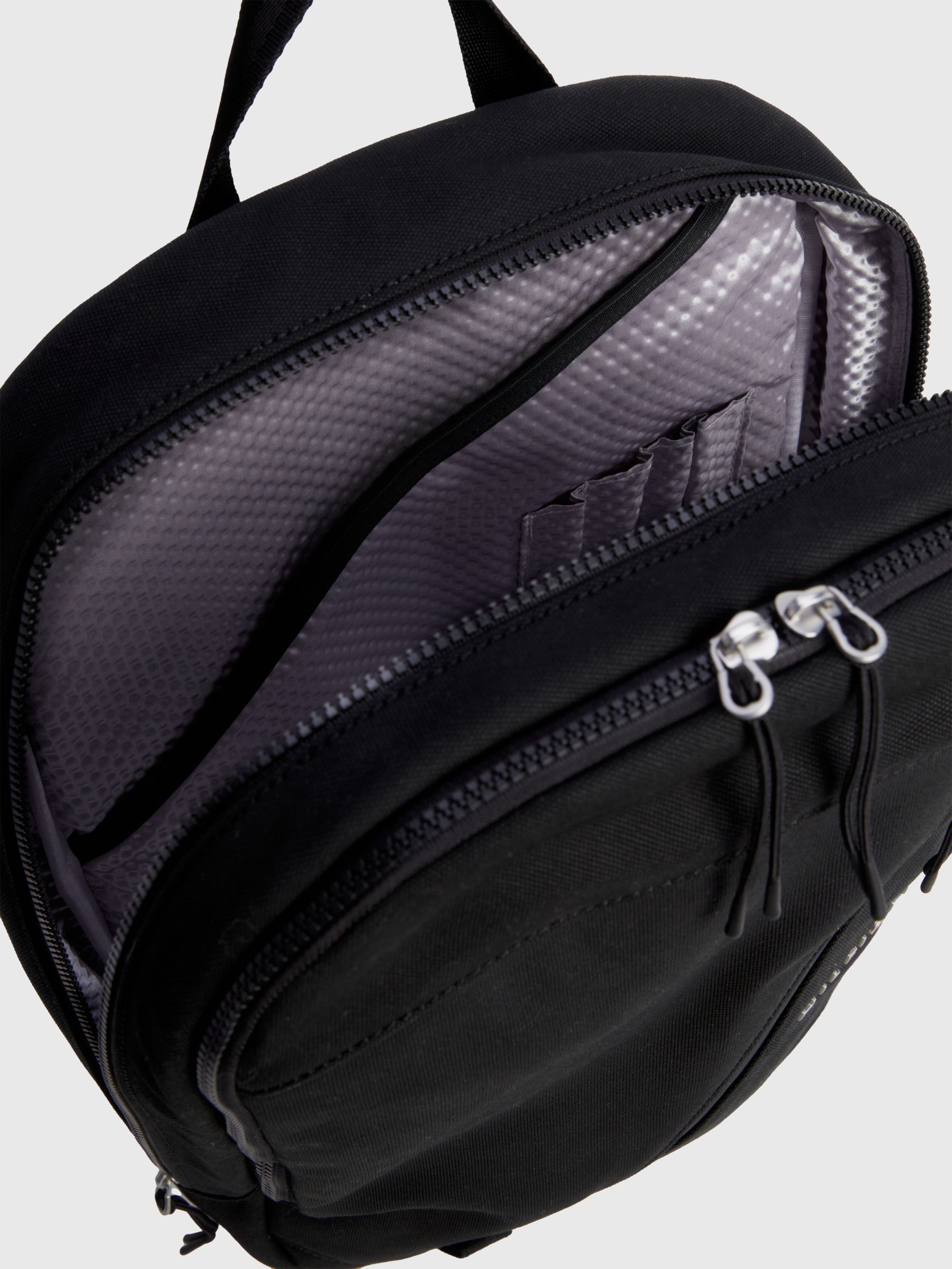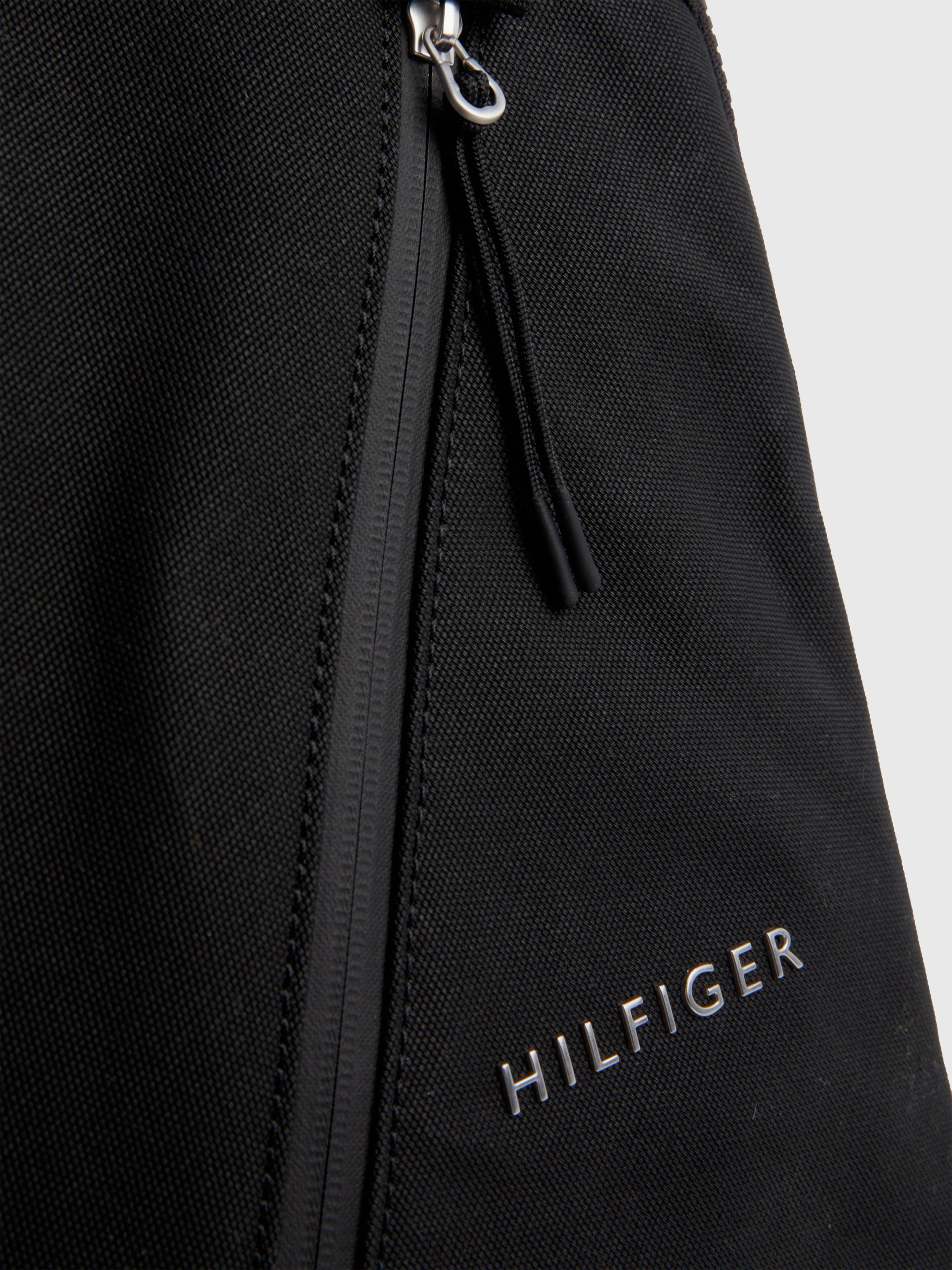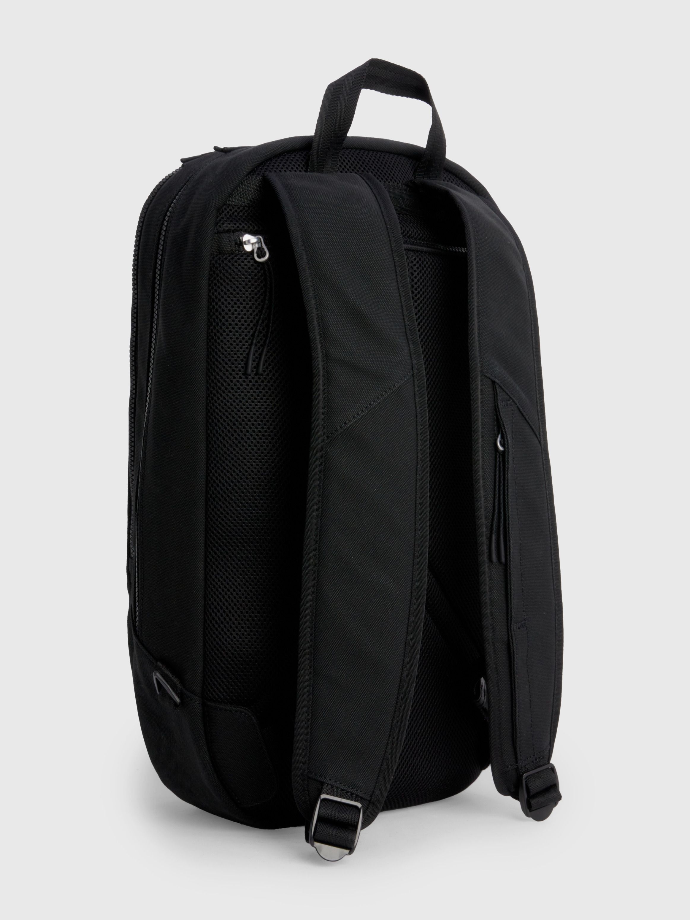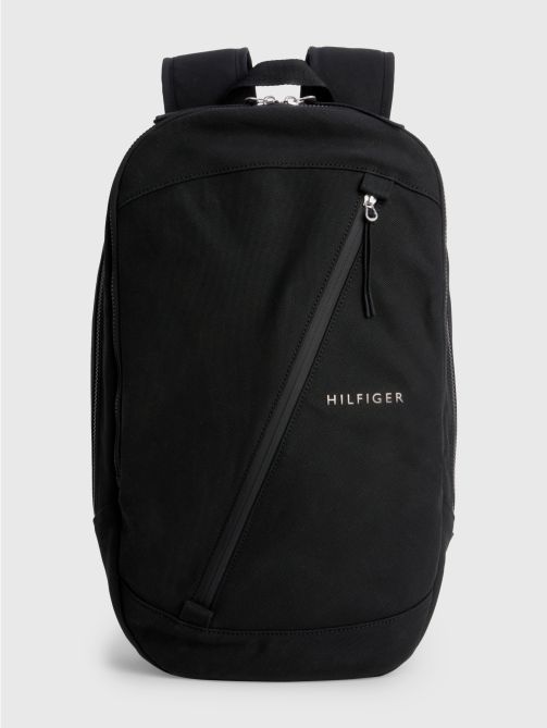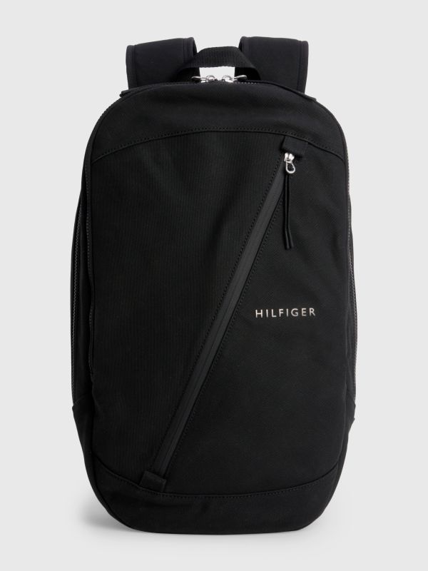 • Bananatex • Padded mesh back panel • Zip closure • One top handle • Adjustable padded shoulder straps • One main compartment • Three exterior zipped pockets • Two interior mesh slip pockets • Multiple interior pen slots • Tommy Hilfiger logo on front • Tommy Hilfiger branding