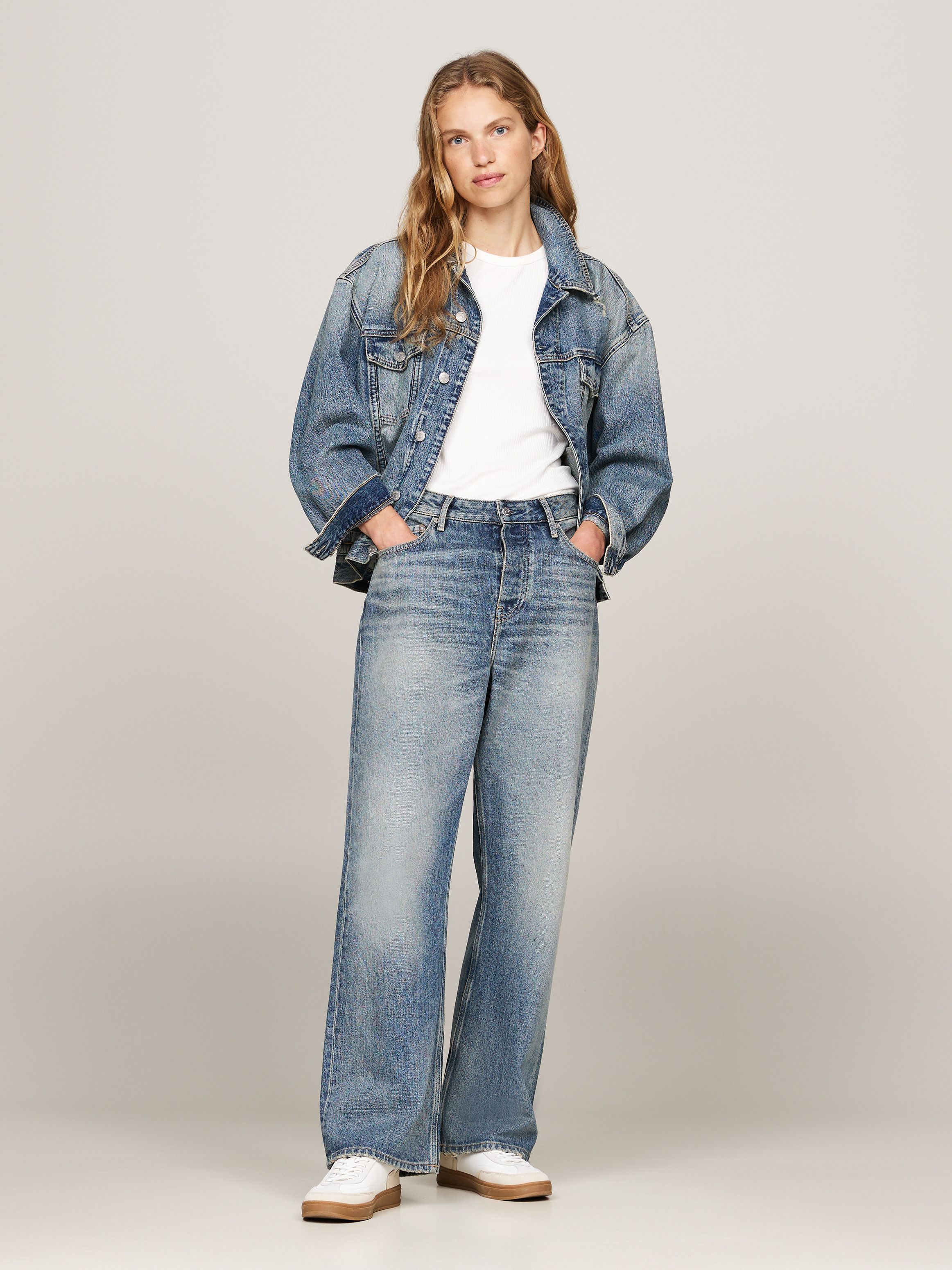 • Rigid denim • Whiskering on front • All-over fading • Zip with button closure • Five-pocket styling • Tommy Hilfiger branding • Tommy Hilfiger flag embroidery on back