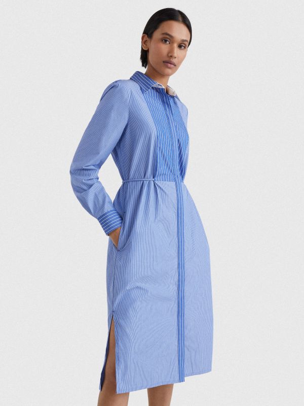 Contrast stripe panels bring a fresh touch to this shirt dress, which has a neatly concealed placket and a waist-enhancing self-tie belt.
