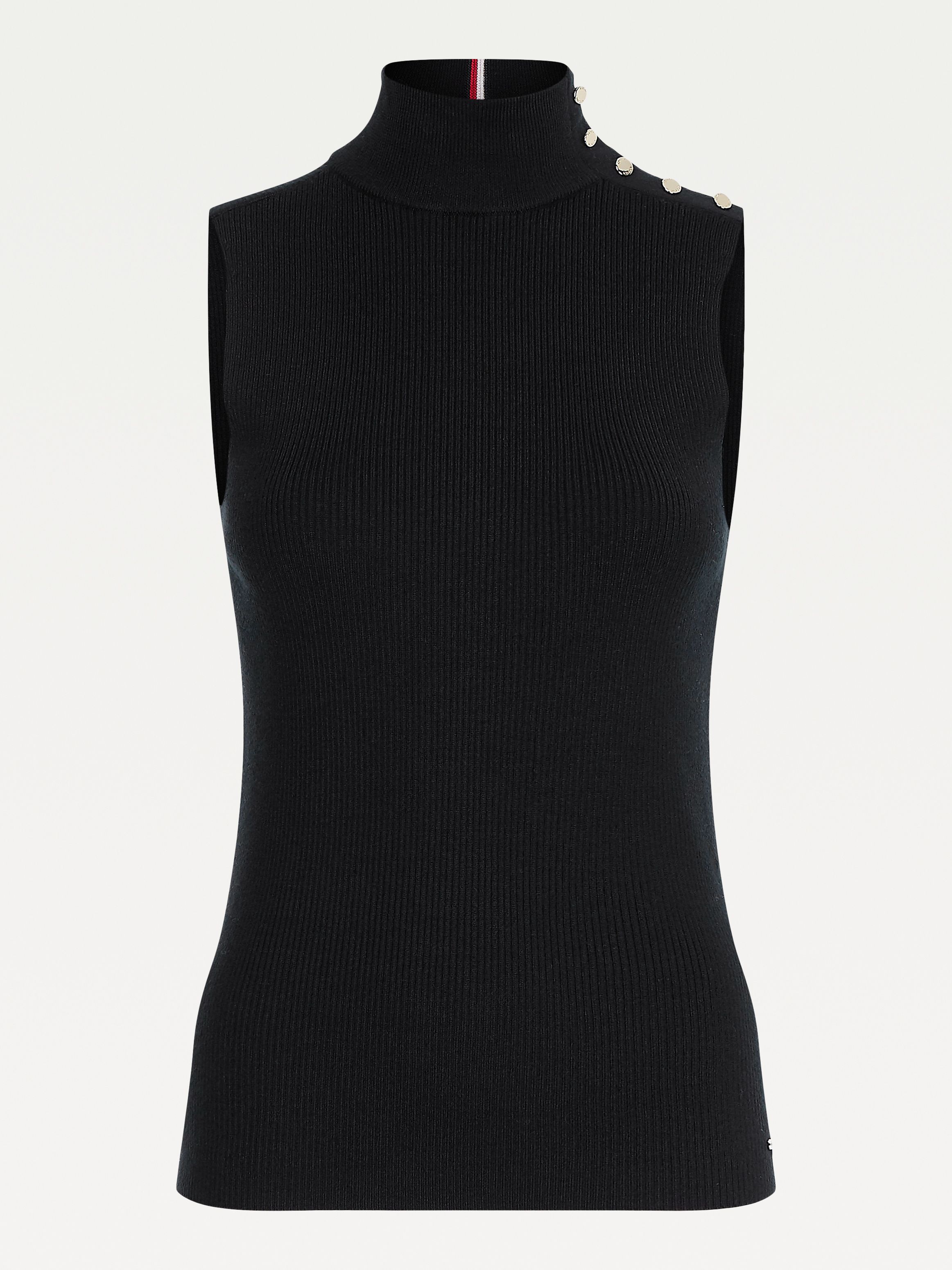 This sleeveless jumper is woven from a ribbed wool blend for ultimate comfort and finished with buttons at the mock neck.