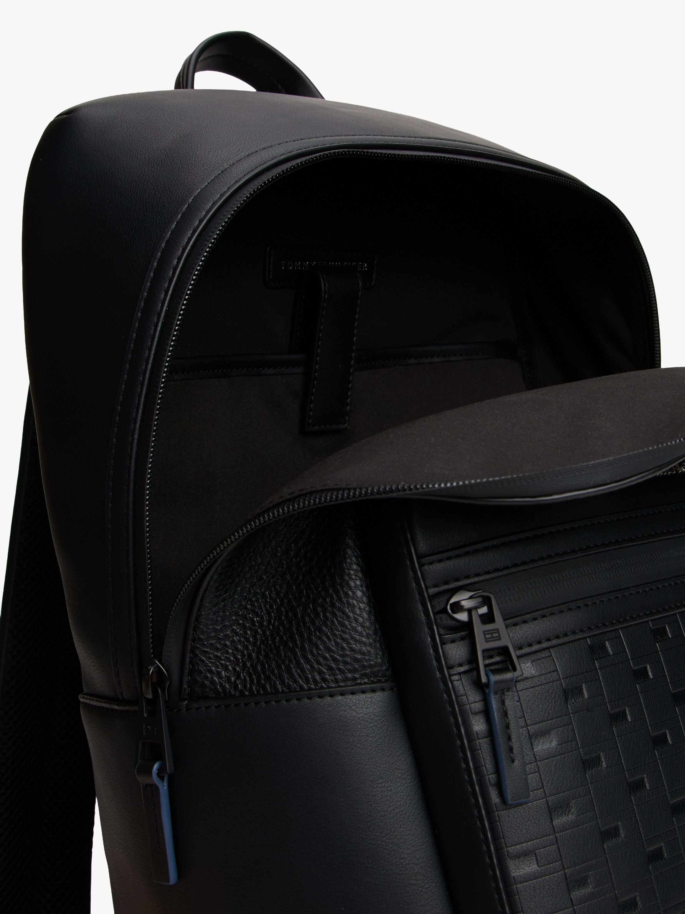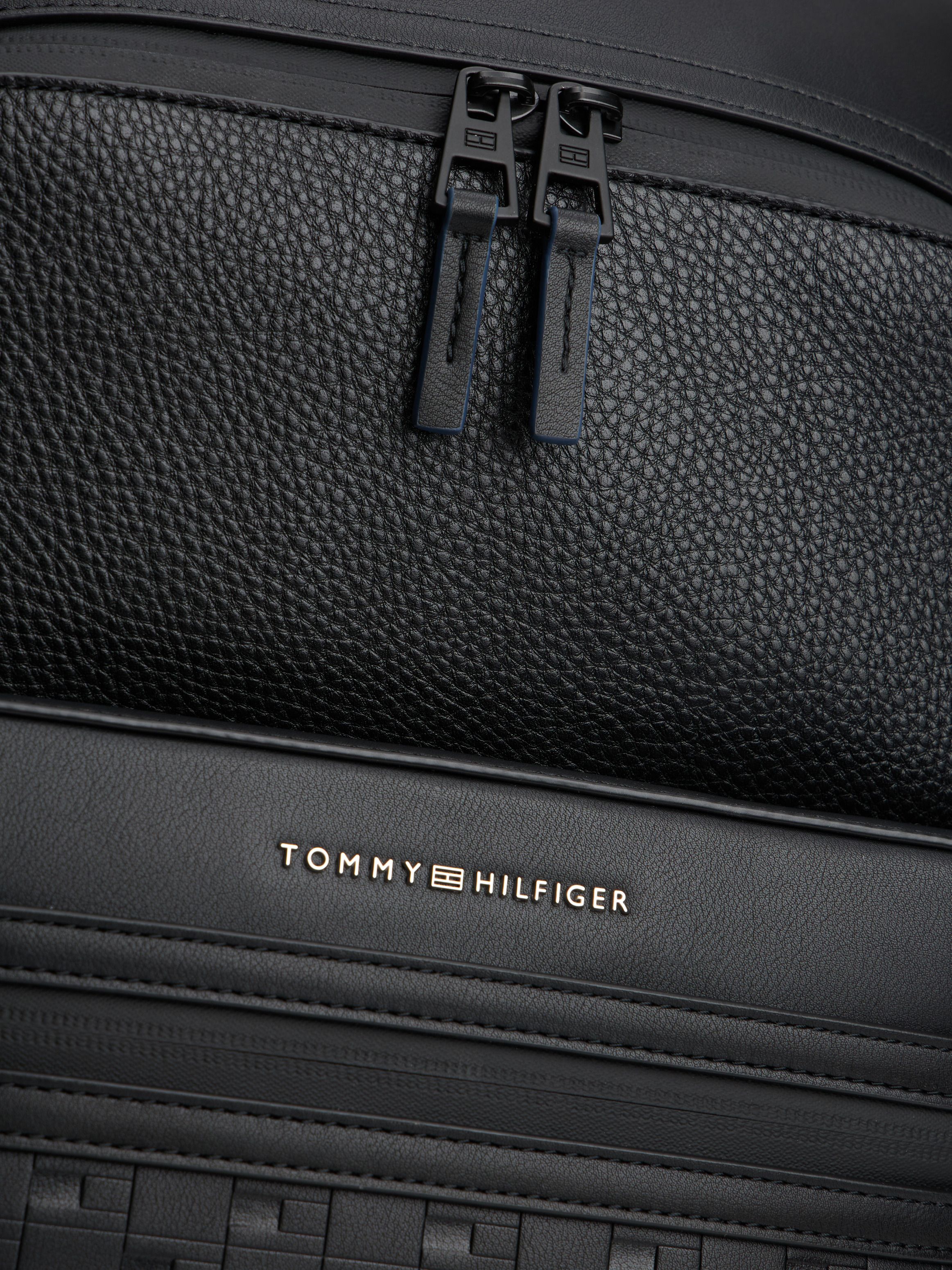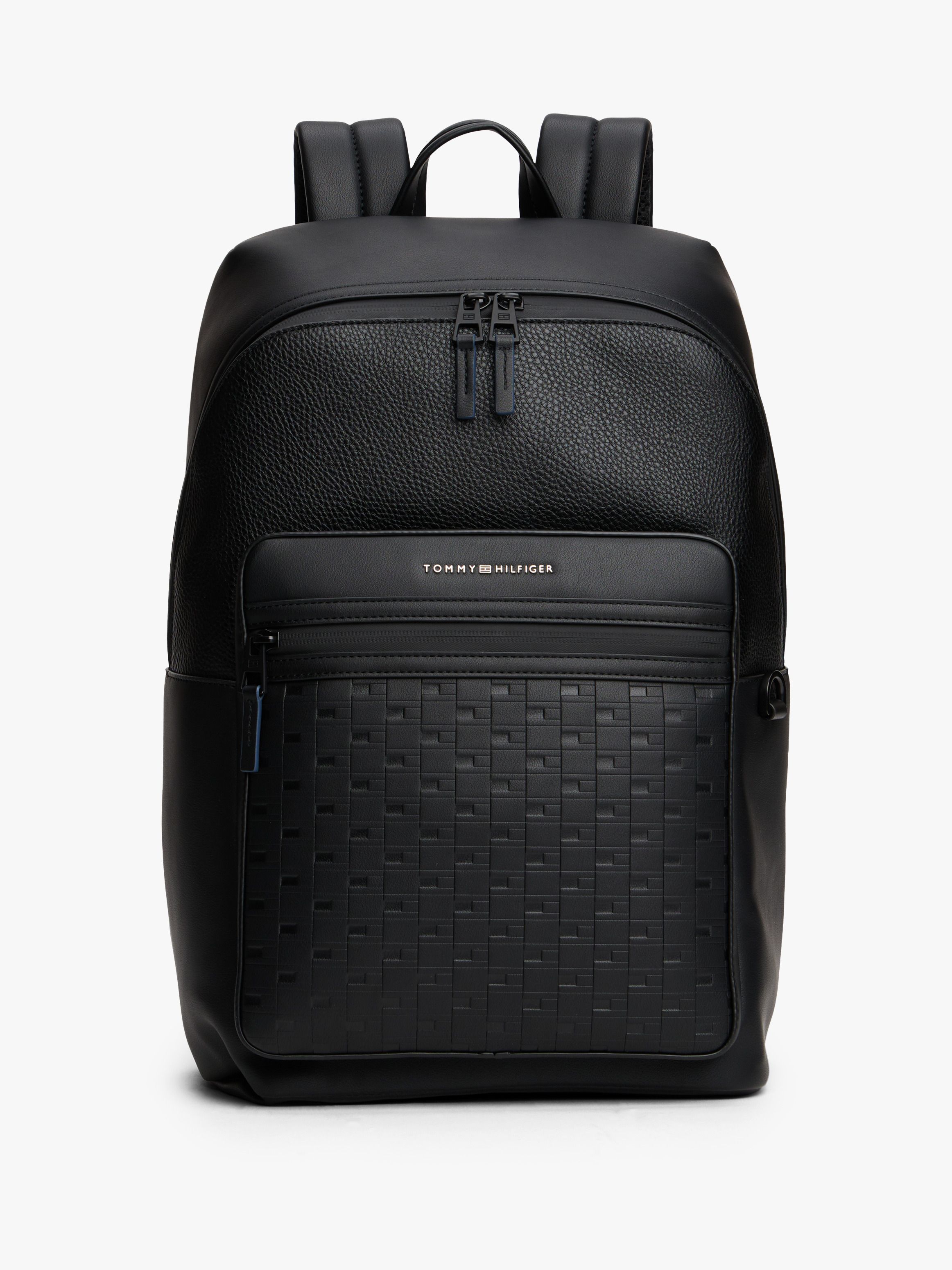 • Mixed texture panels • Padded mesh back • Double zip closure • One top handle • Adjustable padded shoulder straps • One main compartment • One exterior zipped pocket • D-ring hook on side • Tommy Hilfiger repeat flag design debossed on pocket • Tommy Hilfiger metal logo on pocket • Tommy Hilfiger branding