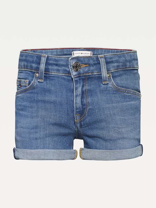• Stretch cotton denim • Fading on seams • Zip with button closure • Five-pocket styling • Turn-up hem • Tommy Hilfiger branding • Tommy Hilfiger flag embroidery on coin and back pockets