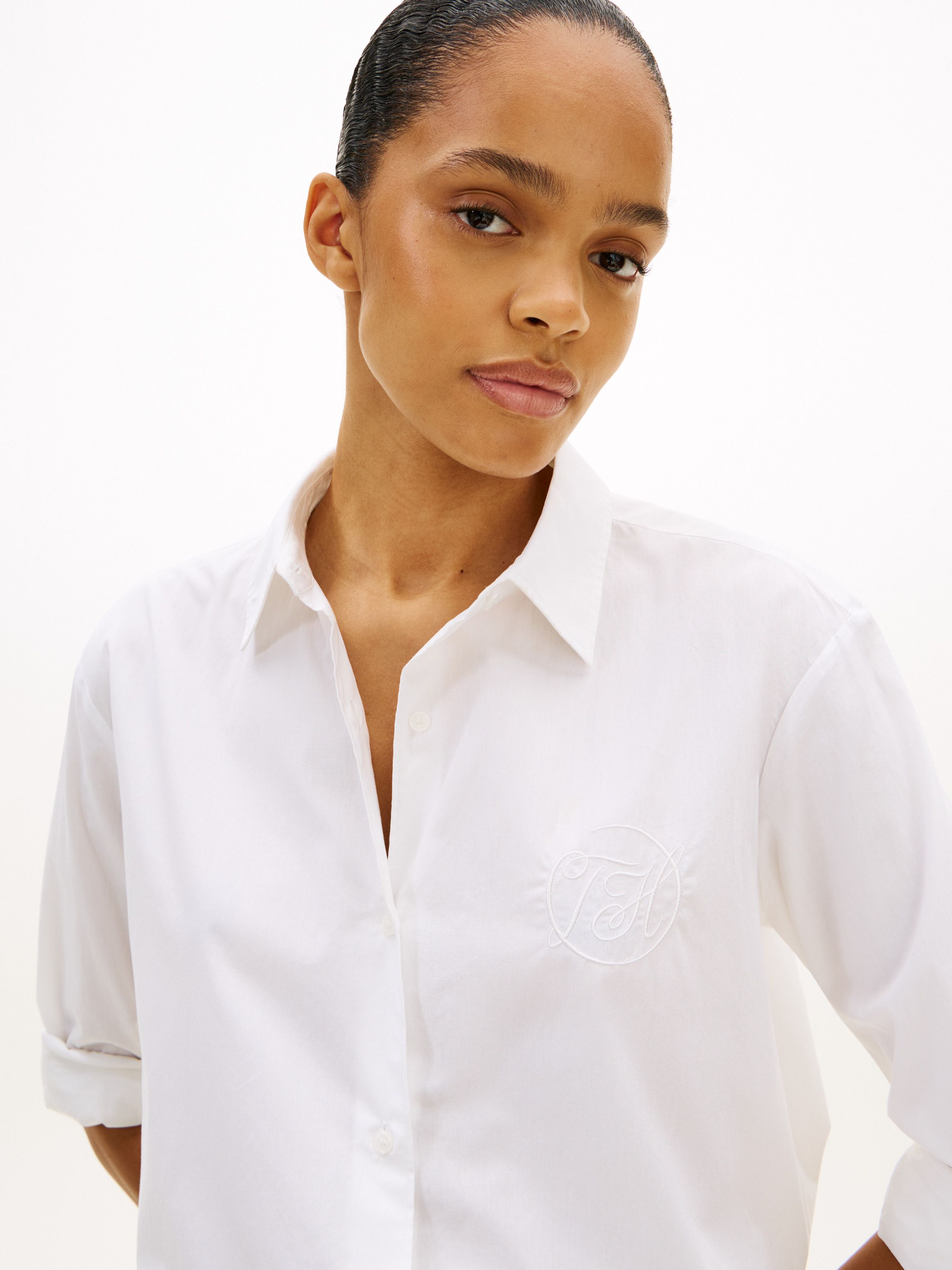 Whether you're at the office or catching up with friends, this oversized shirt with sleek signature embroidery is a stylish layer.