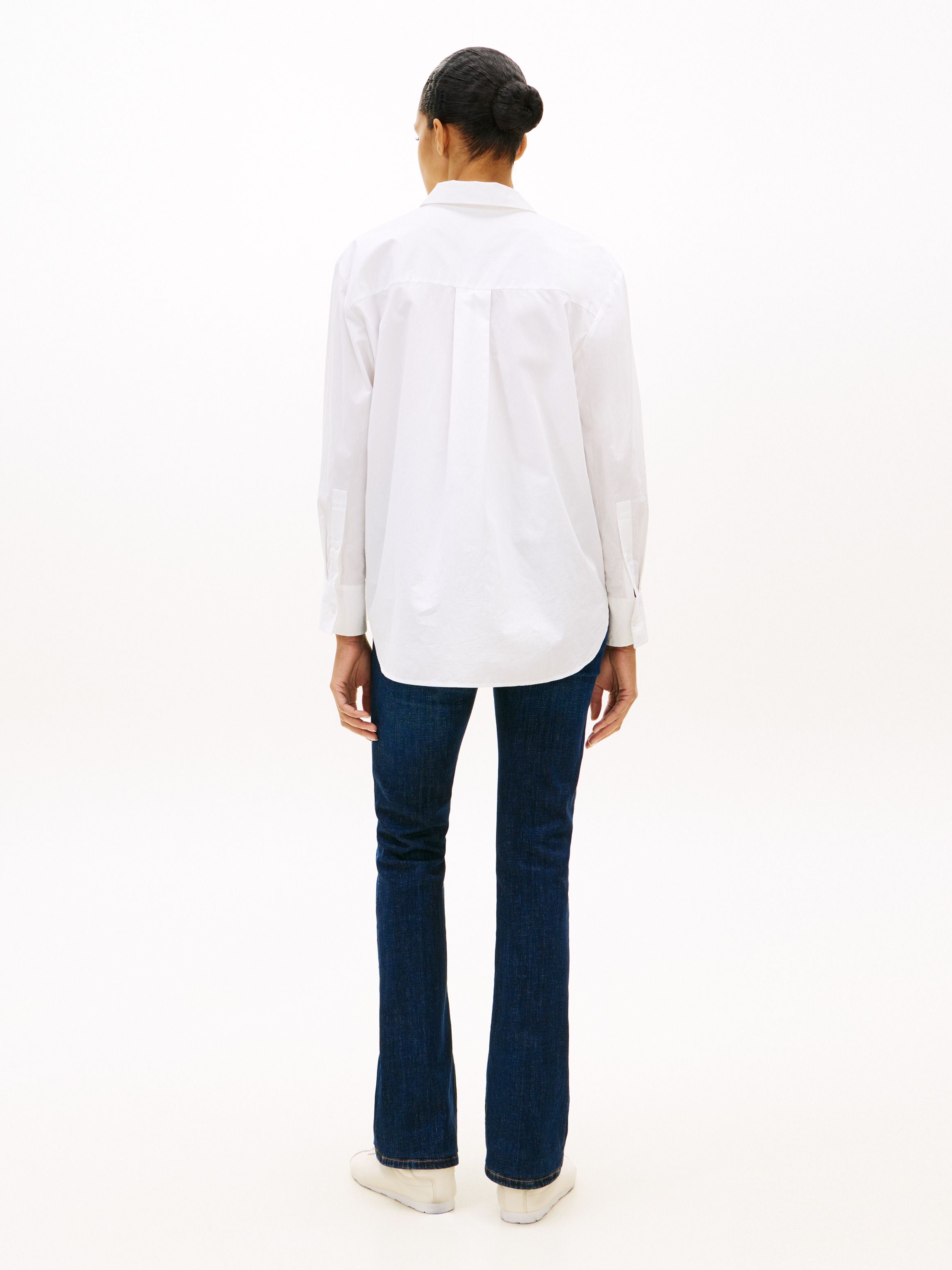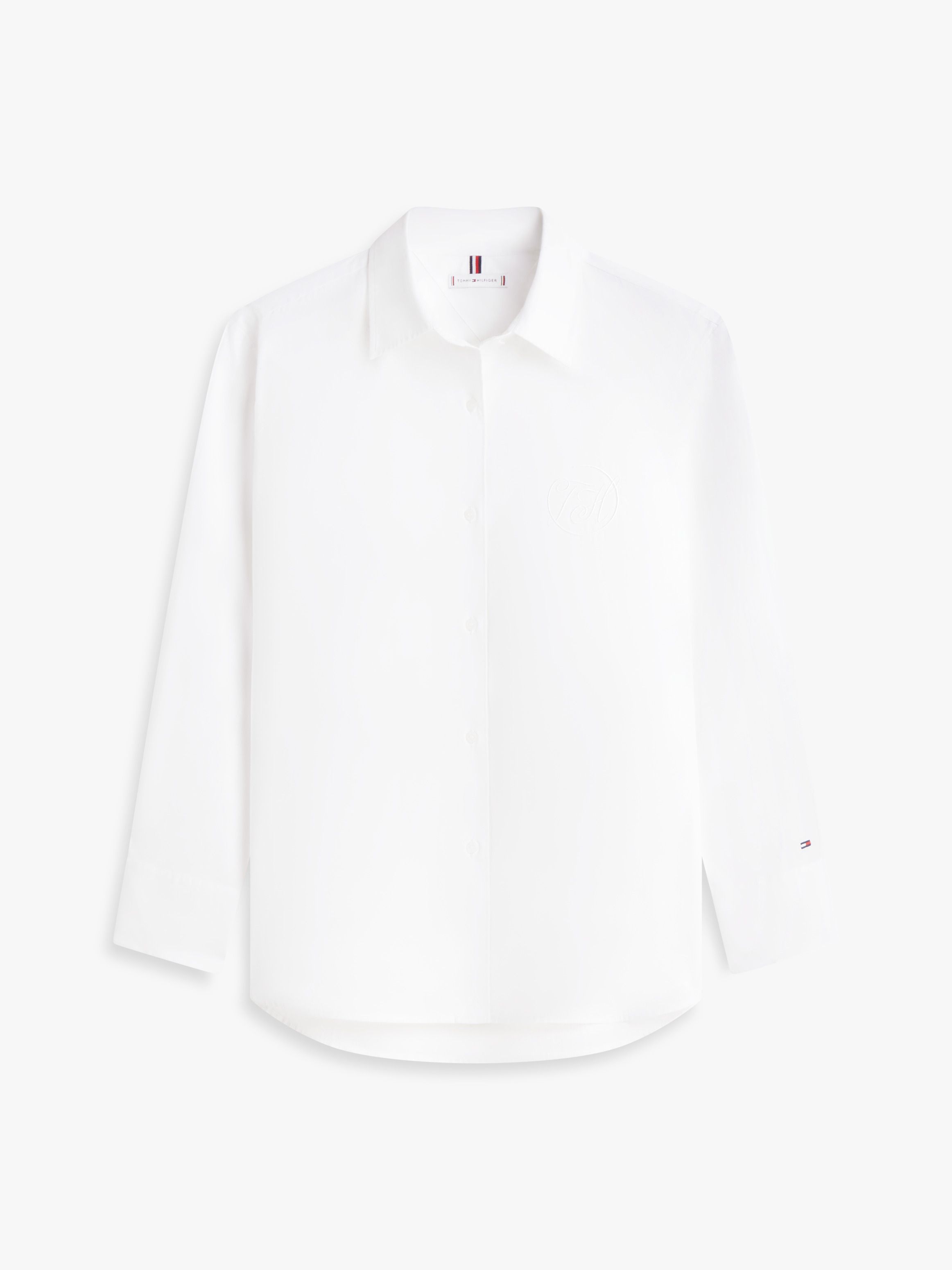 • Pure cotton shirting fabric • Semi-spread collar • One-button cuffs • Box pleat on back • Tommy Hilfiger script logo embroidery on chest • Tommy Hilfiger branding • Tommy Hilfiger flag embroidery on sleeve