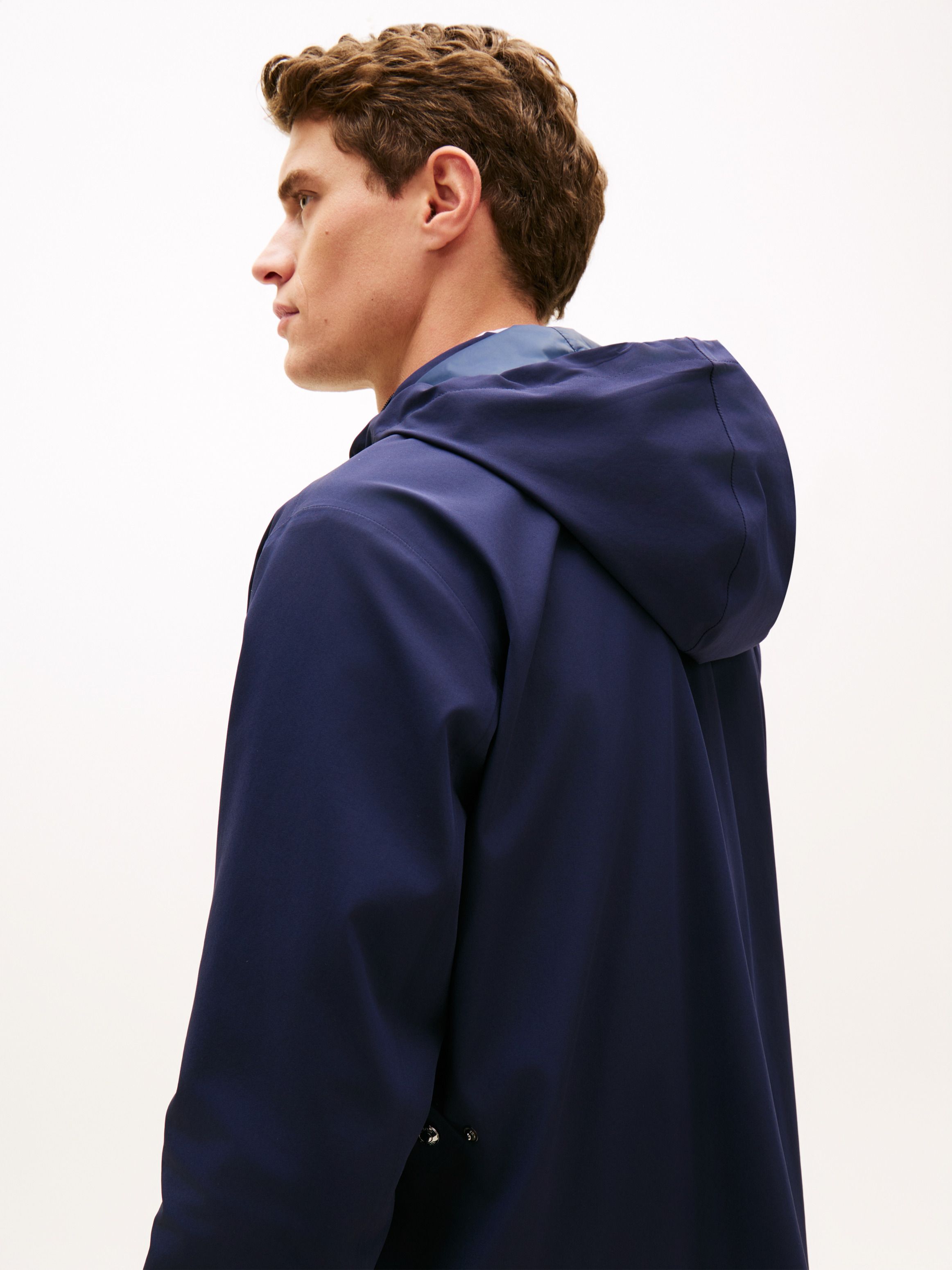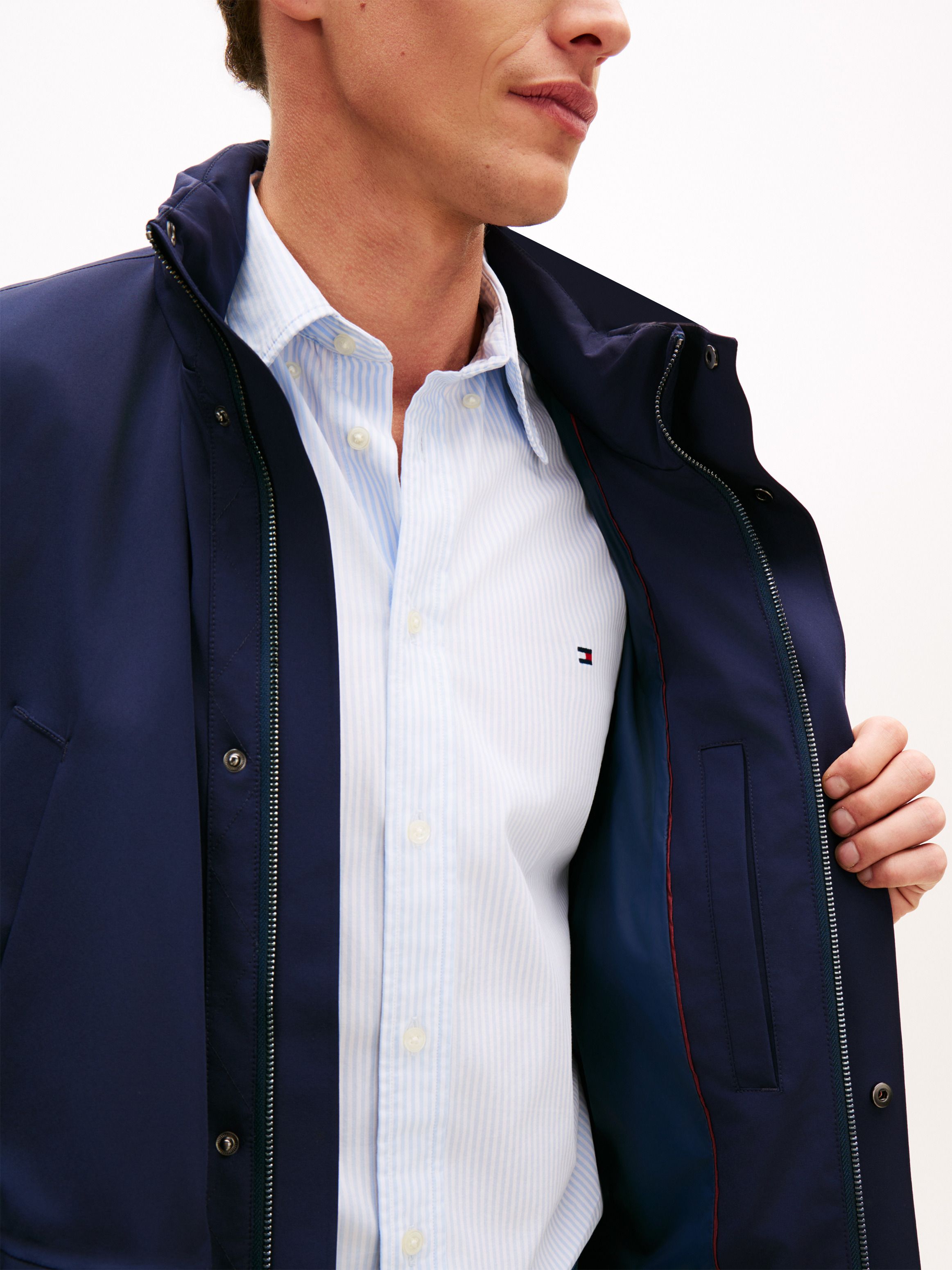 This sleek field jacket combines traditional styling with modern innovation, featuring a water-repellent finish and a packable hood.