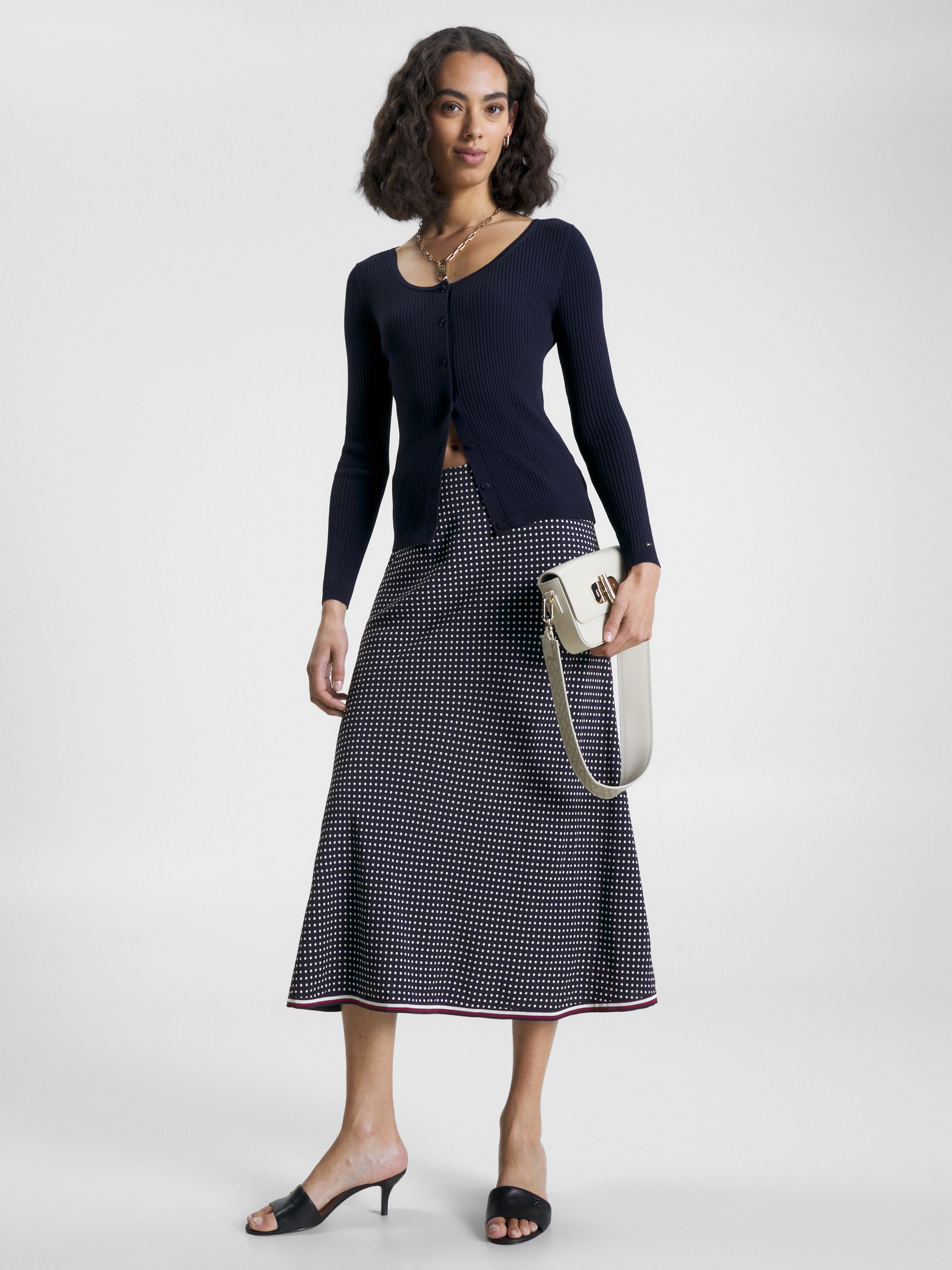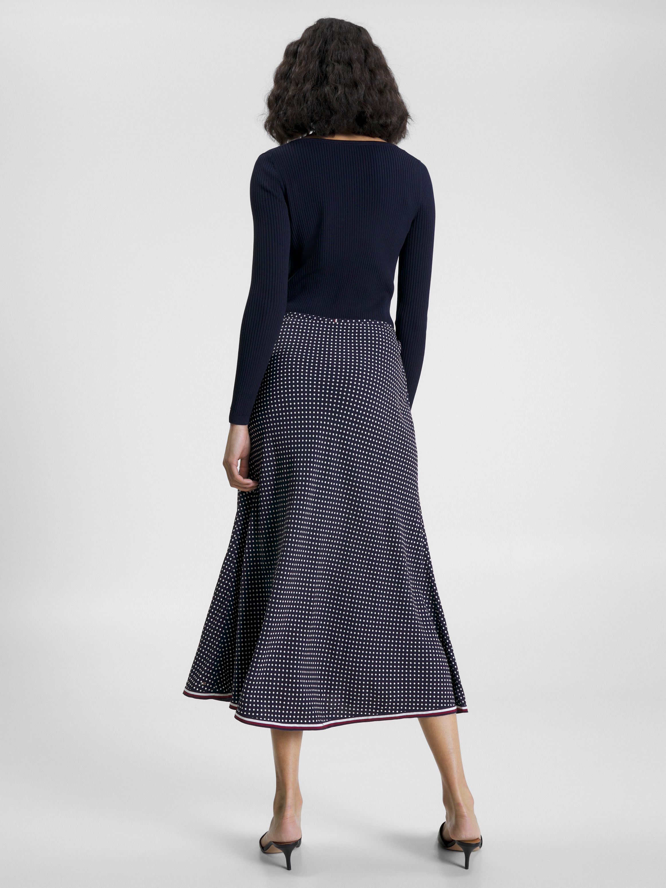 This classic polka-dot midi skirt is finished with bold signature detailing on the hem for a contemporary edge.