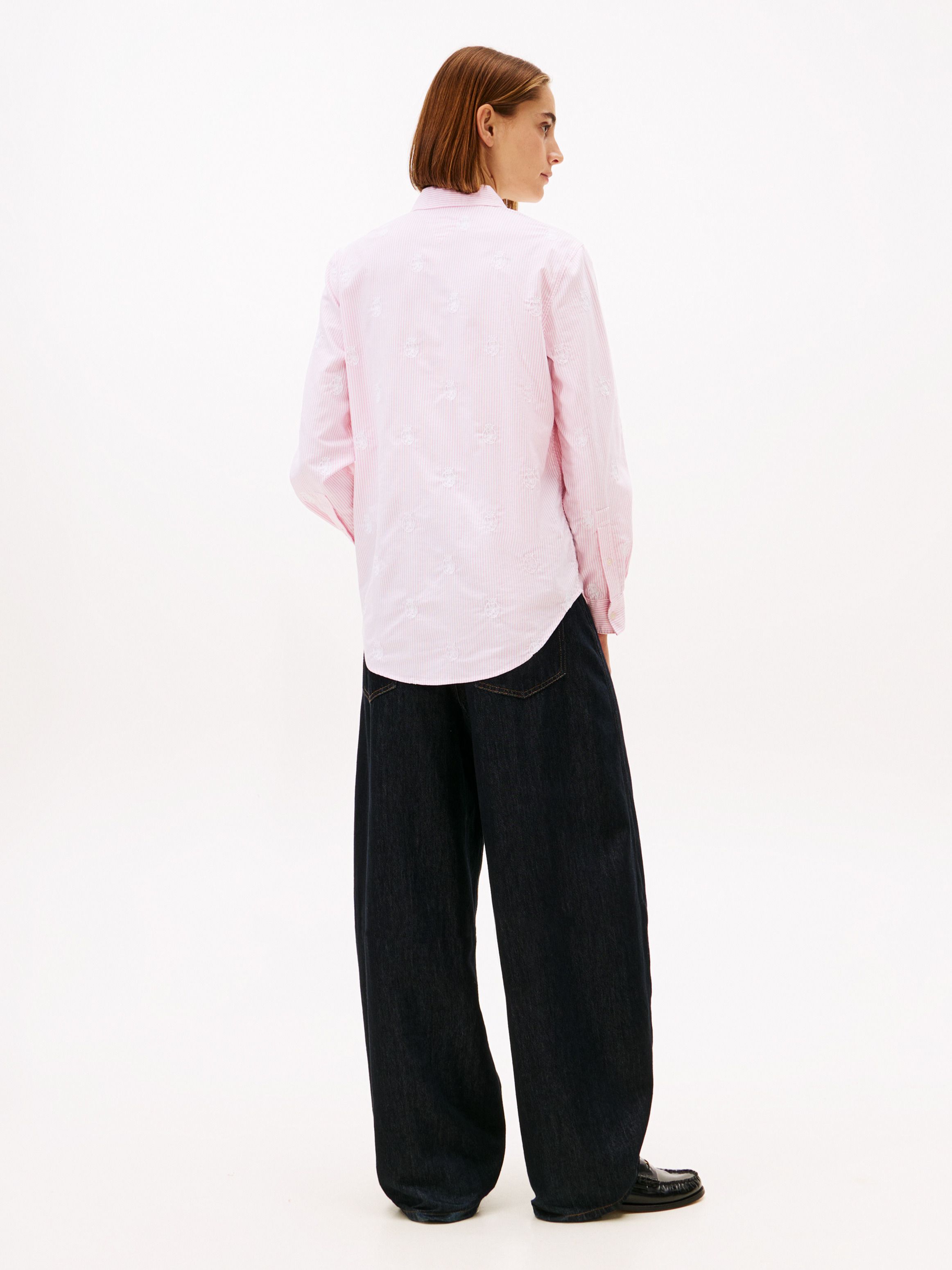 • Pure Oxford cotton • Yarn dyed • All-over TH crest embroidery • All-over print • Semi-spread collar • One-button cuffs • Rounded back hem • Tommy Hilfiger branding • Tommy Hilfiger metal flag on cuff