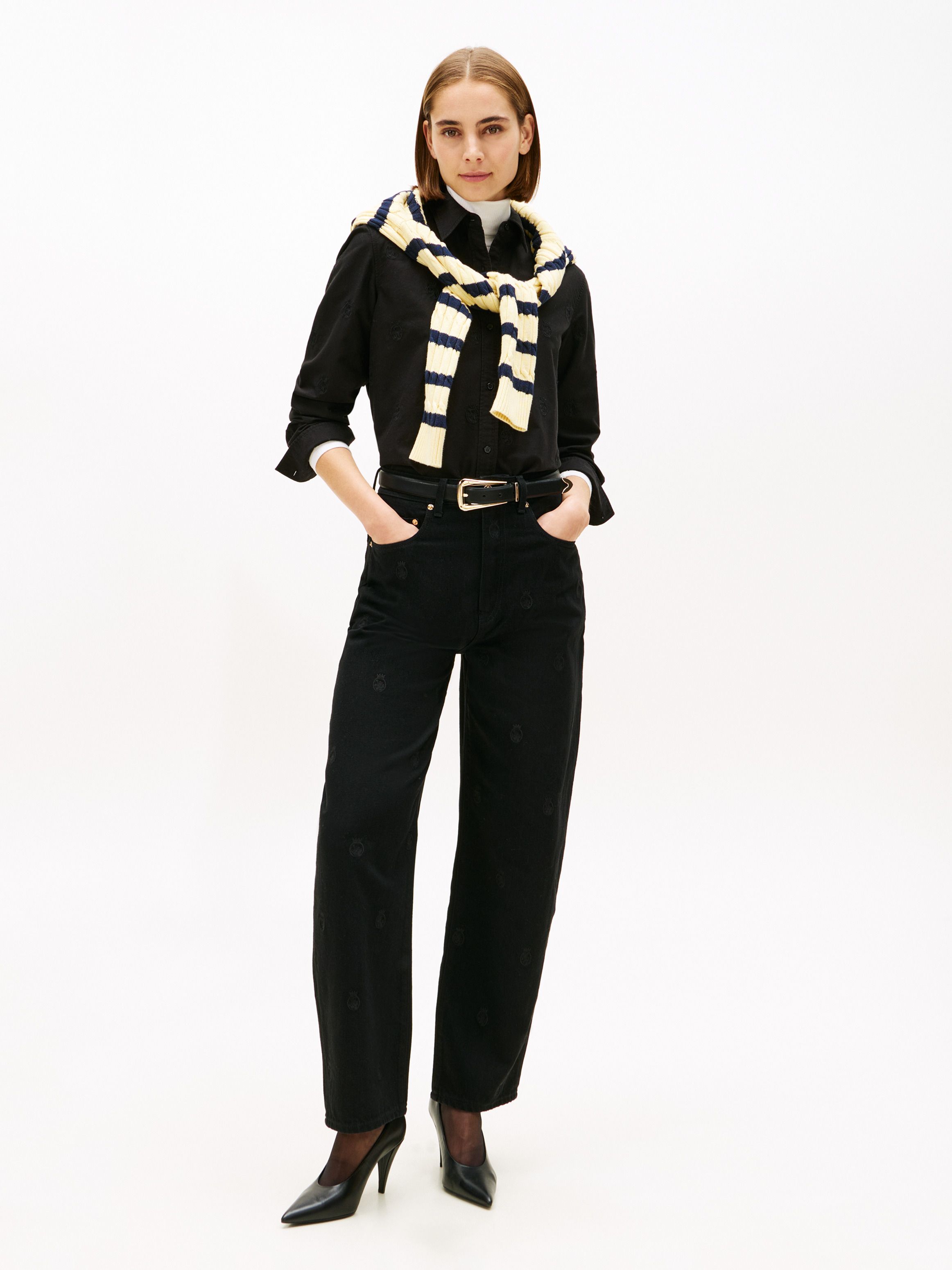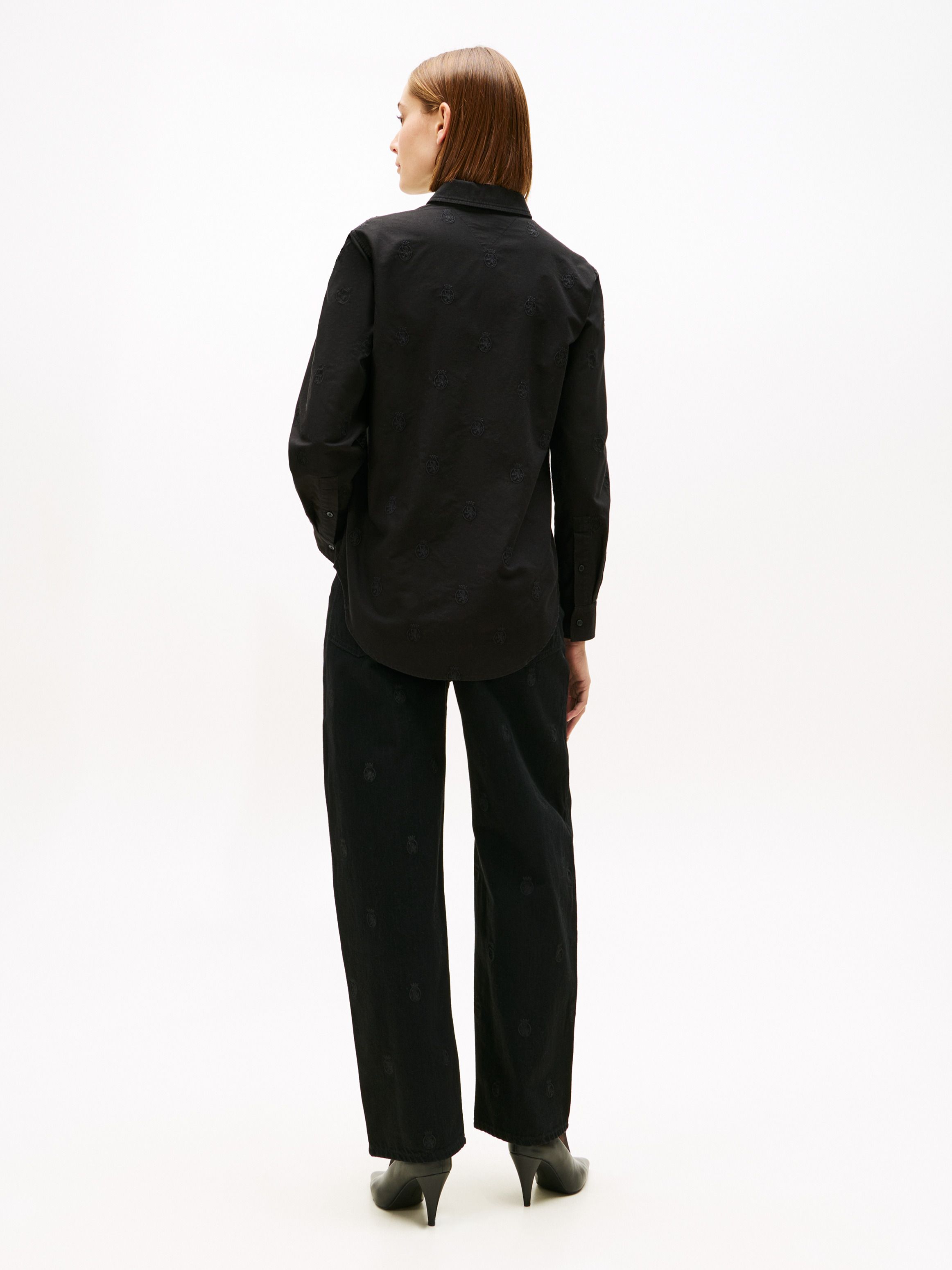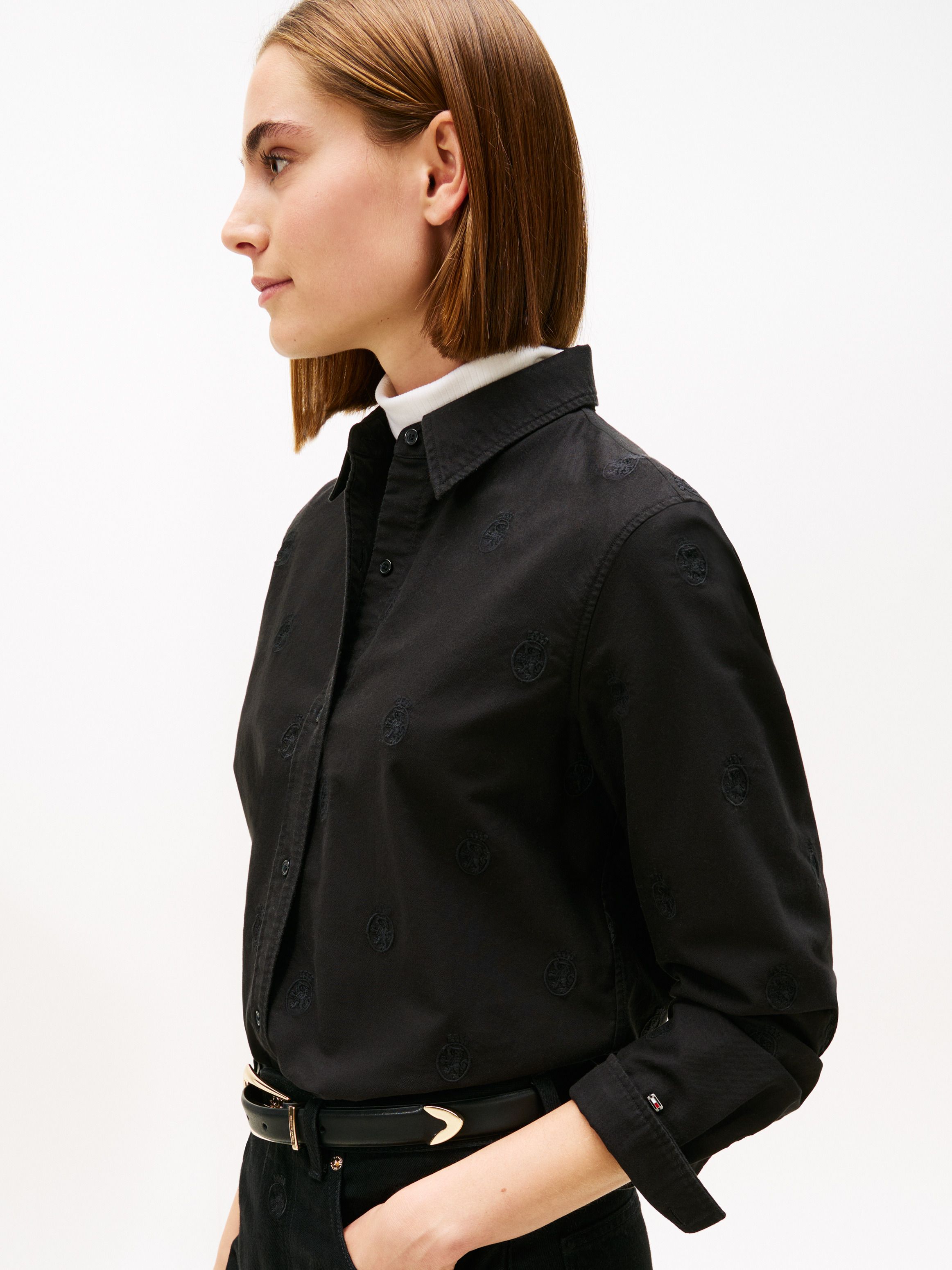 • Pure Oxford cotton • Yarn dyed • All-over TH crest embroidery • All-over print • Semi-spread collar • One-button cuffs • Rounded back hem • Tommy Hilfiger branding • Tommy Hilfiger metal flag on cuff