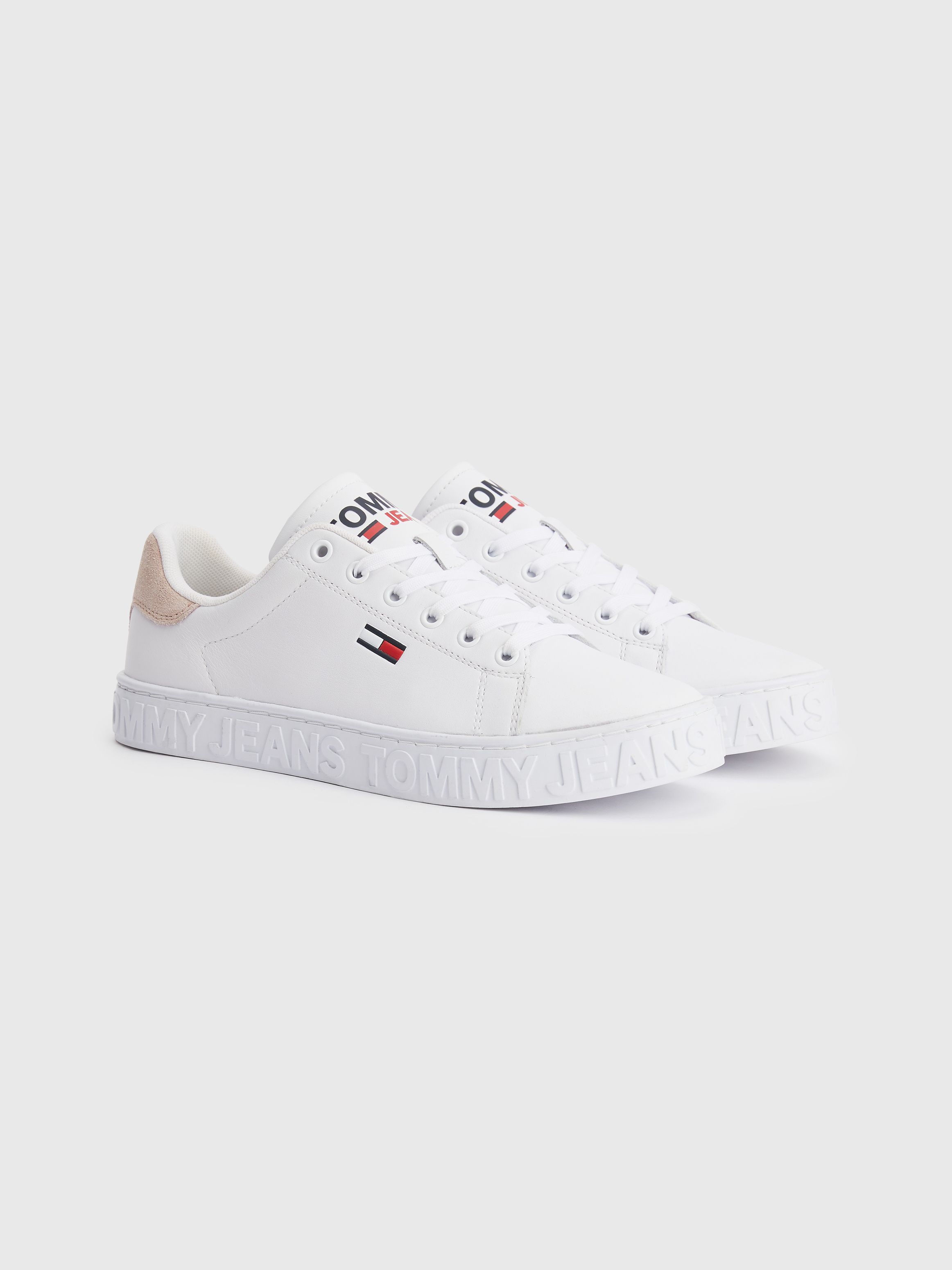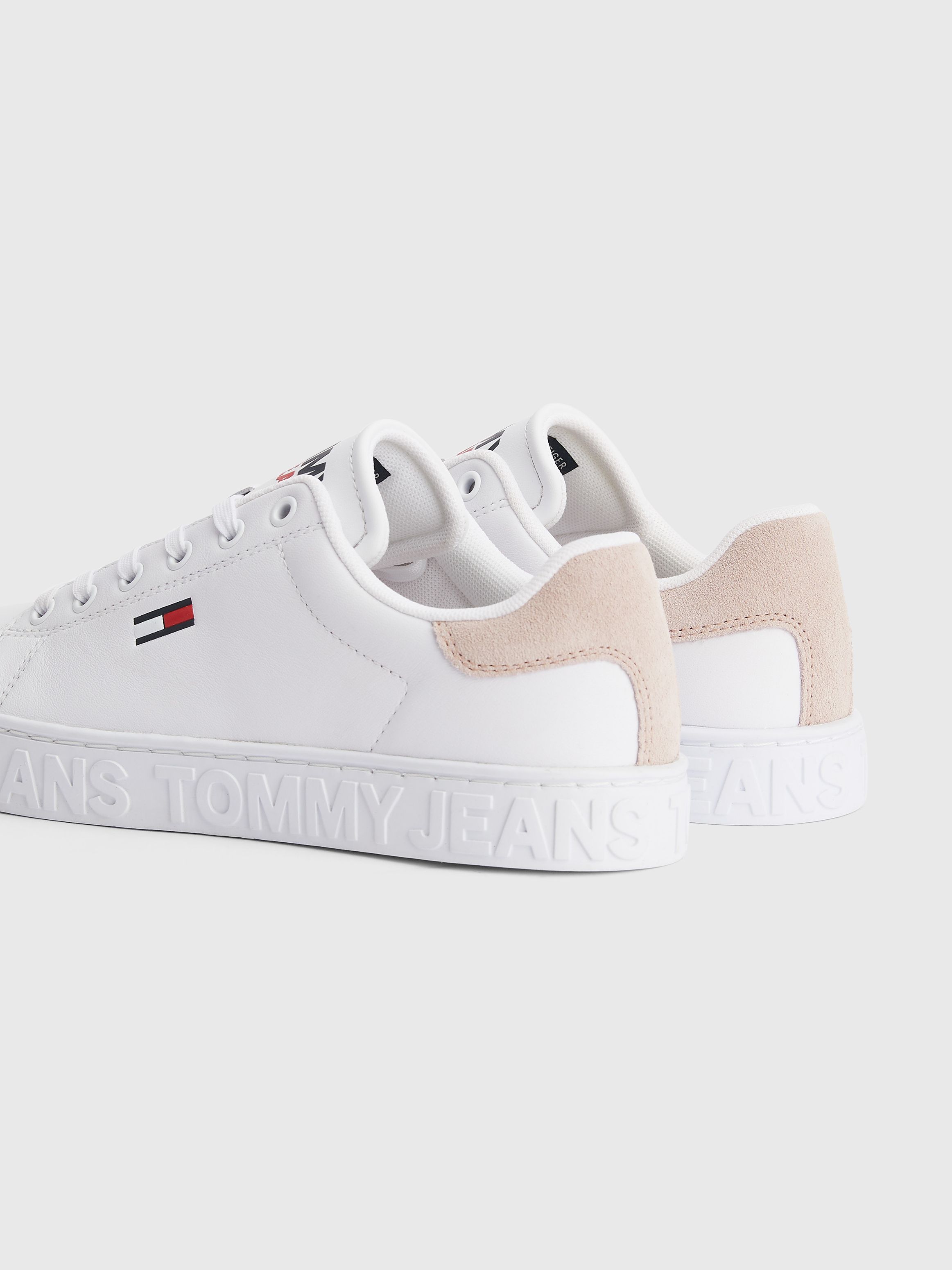 The Tommy Jeans logo is the focal point of these leather trainers, featuring in chunky embossed lettering around the sole.