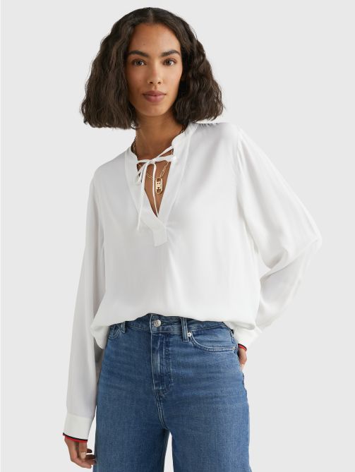 • Pure viscose crepe • V-neck • Tie detail at neck • One-button cuffs • Signature tape tipped cuffs • Tommy Hilfiger branding • Tommy Hilfiger flag at hem