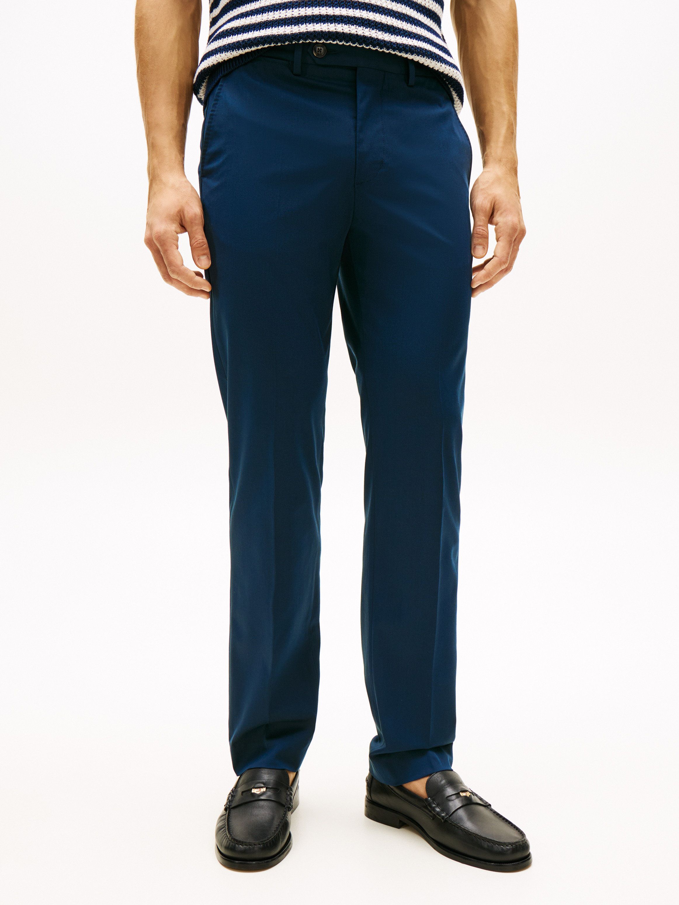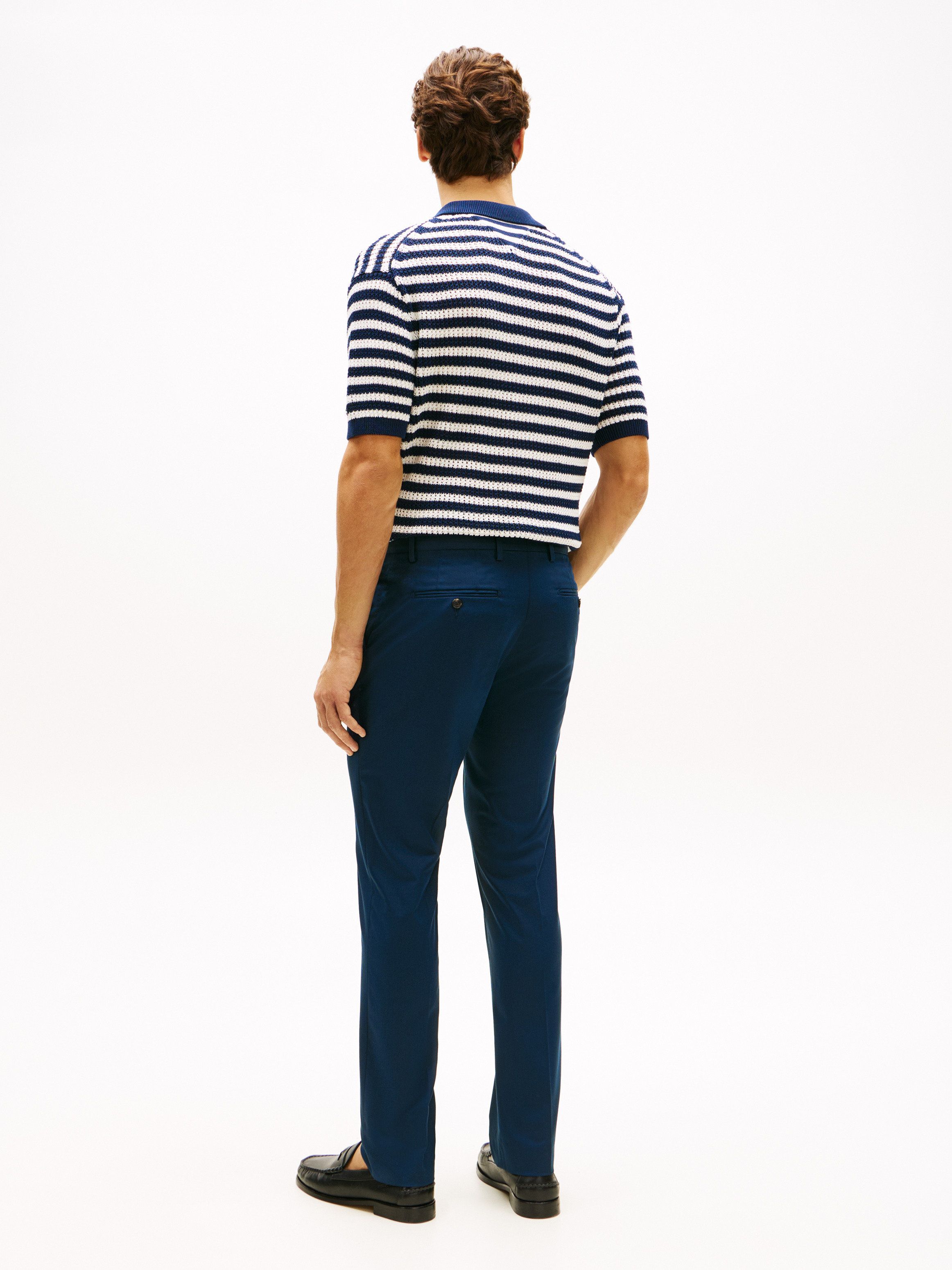 • Stretch cotton blend • Faux tortoiseshell buttons • Zip with button closure • Two waist angled slip pockets • One front coin pocket • Two back buttoned slit pockets • Pressed front and back creases • Signature tape on back pocket • Tommy Hilfiger branding