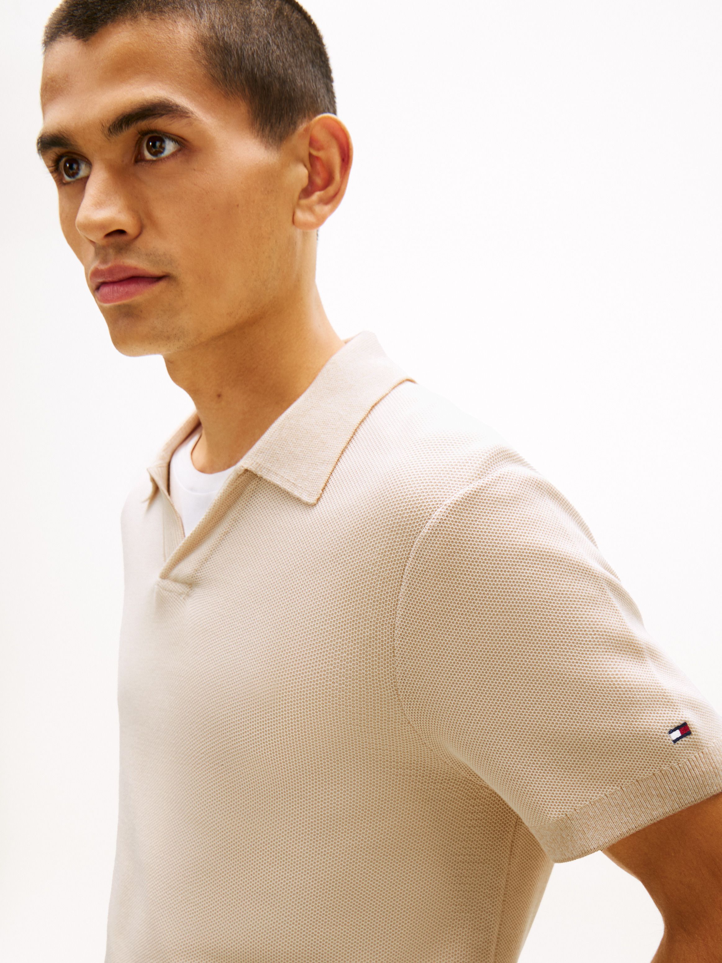 This polo shirt is given a textural twist with a honeycomb finish and features an open placket for a nonchalant vibe.
