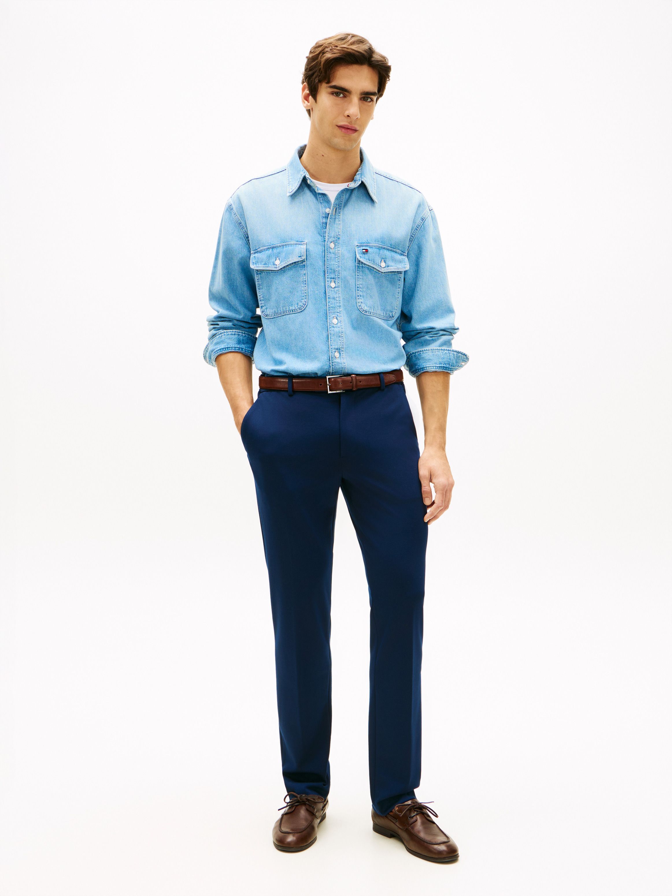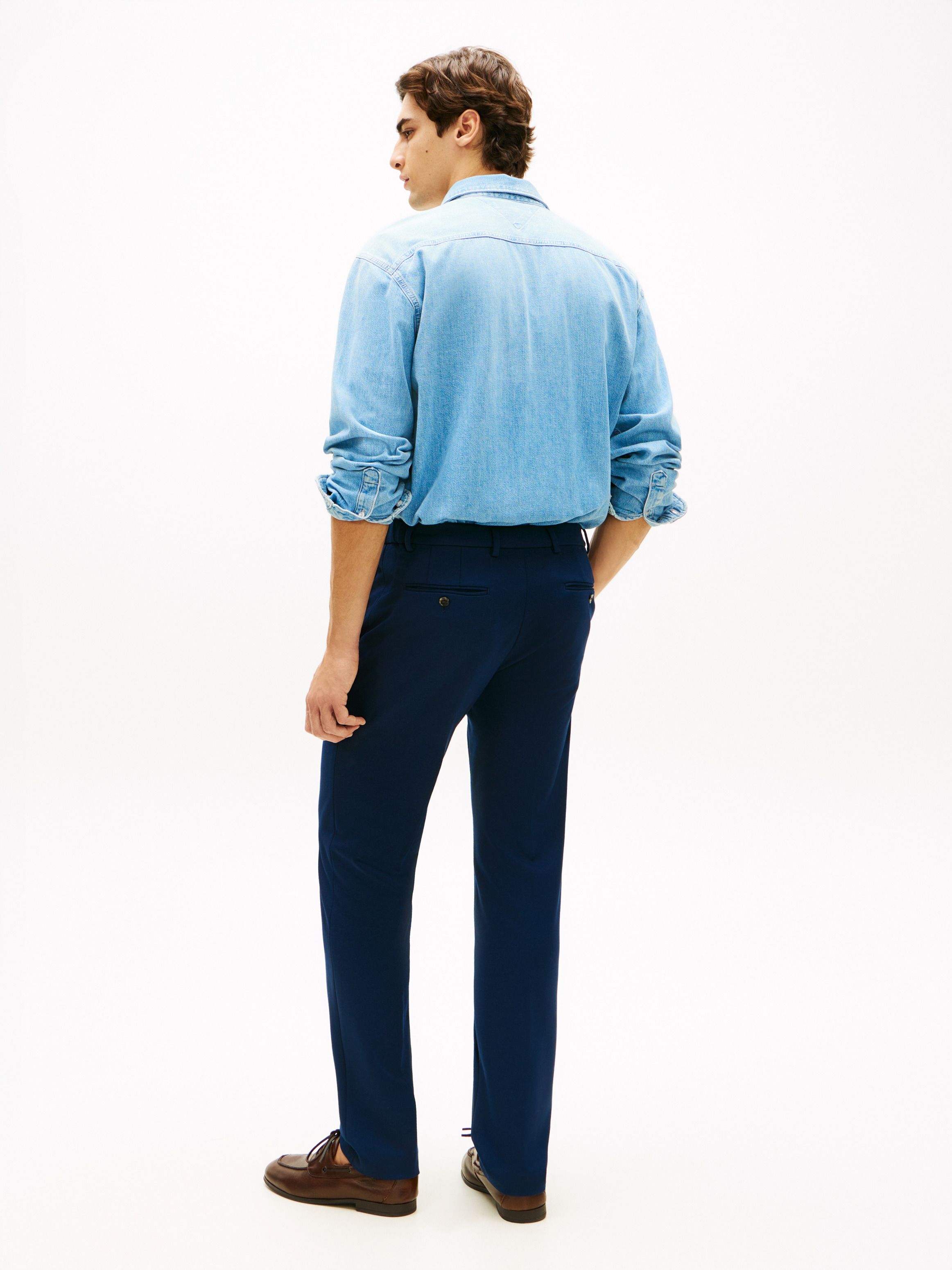 • Comfort stretch fabric • Zip with button closure • Two side angled slip pockets • Two back buttoned slit pockets • Semi-elasticated waistband • Pressed front and back creases • Signature detailing on back pocket • Tommy Hilfiger branding