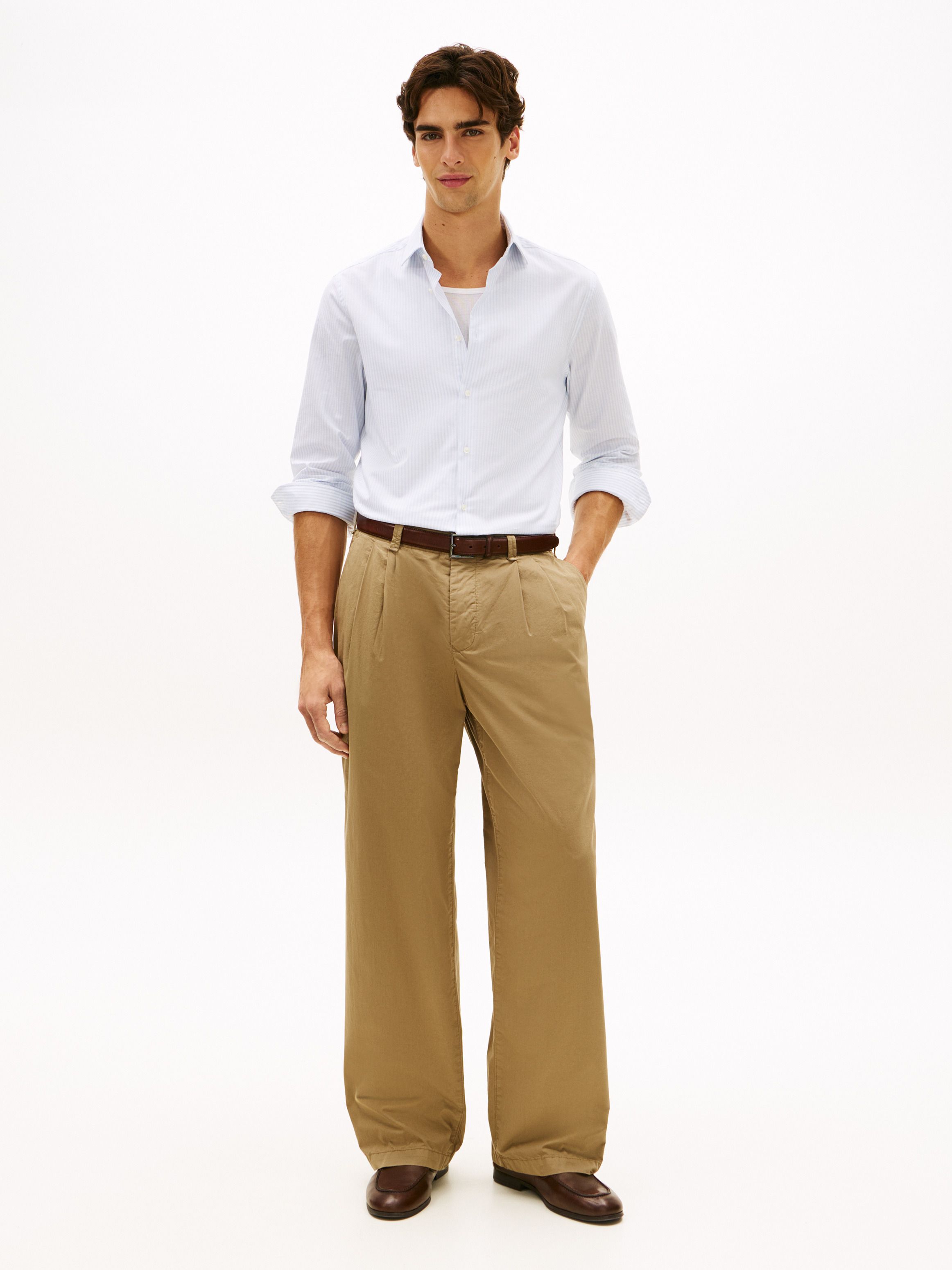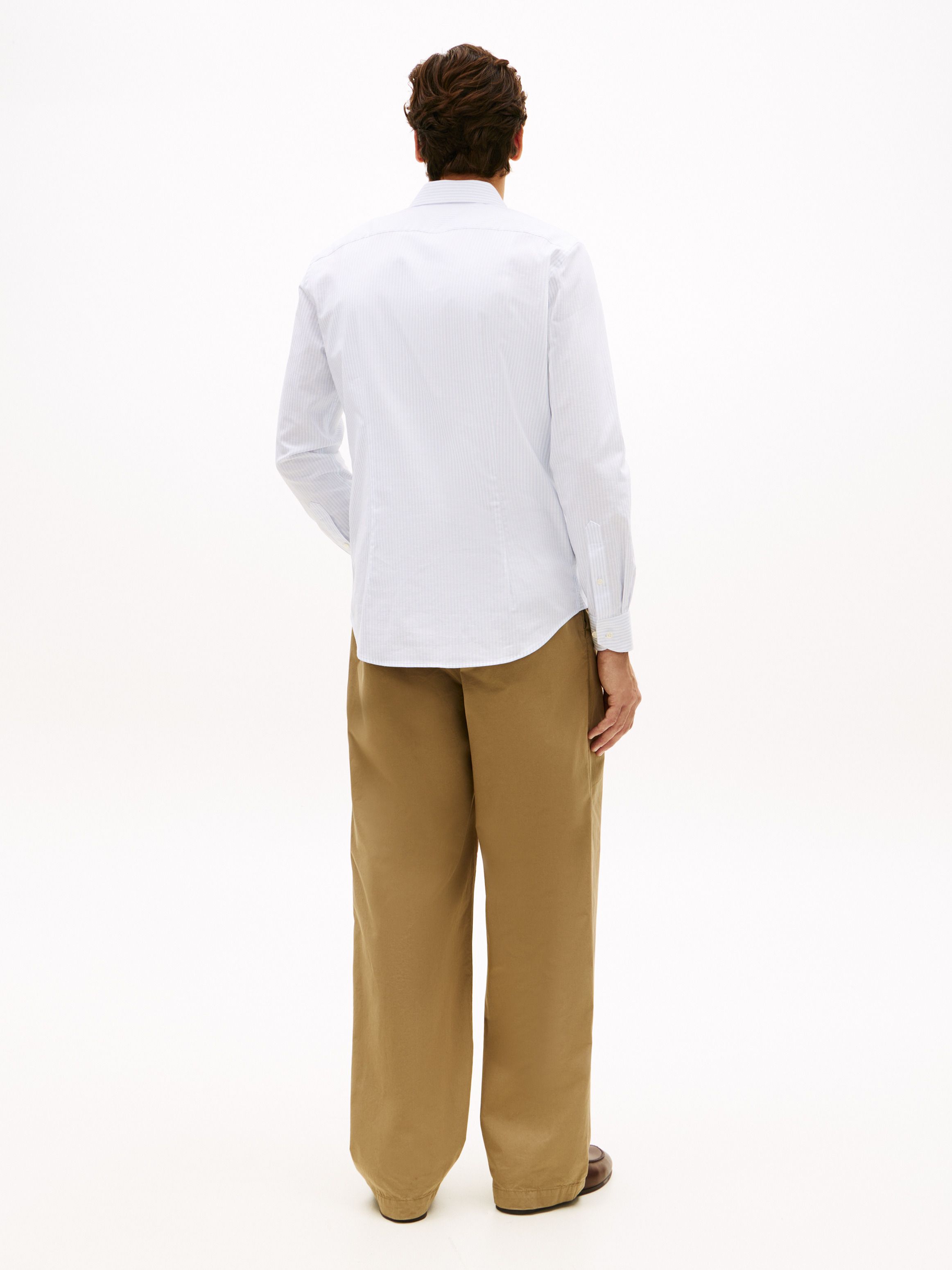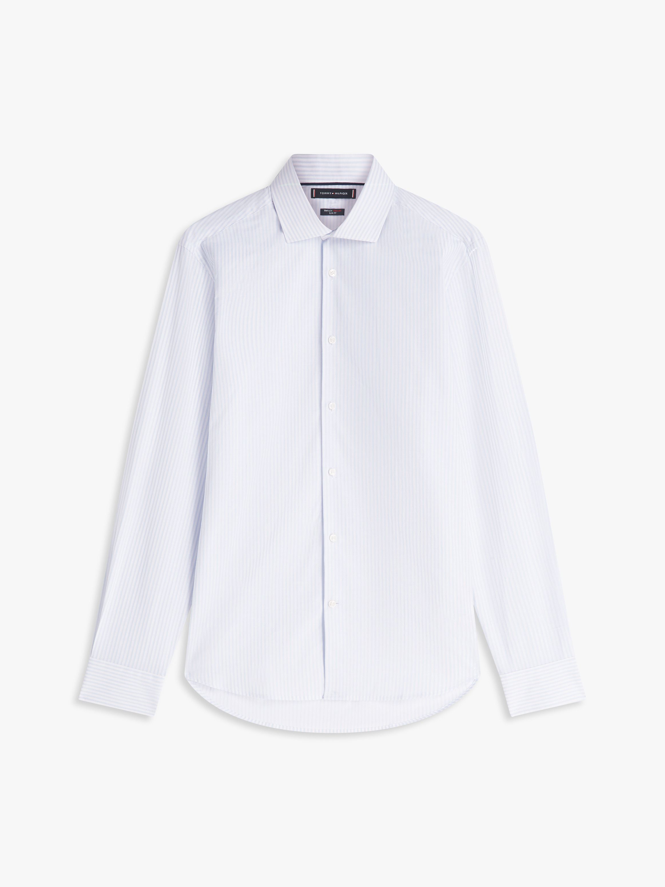 • Stretch cotton linen blend • Flex technology • All-over vertical stripe • Cutaway collar • Mitred two-button cuffs • Shirttail hem • Tommy Hilfiger branding • Tommy Hilfiger flag embroidery on cuff