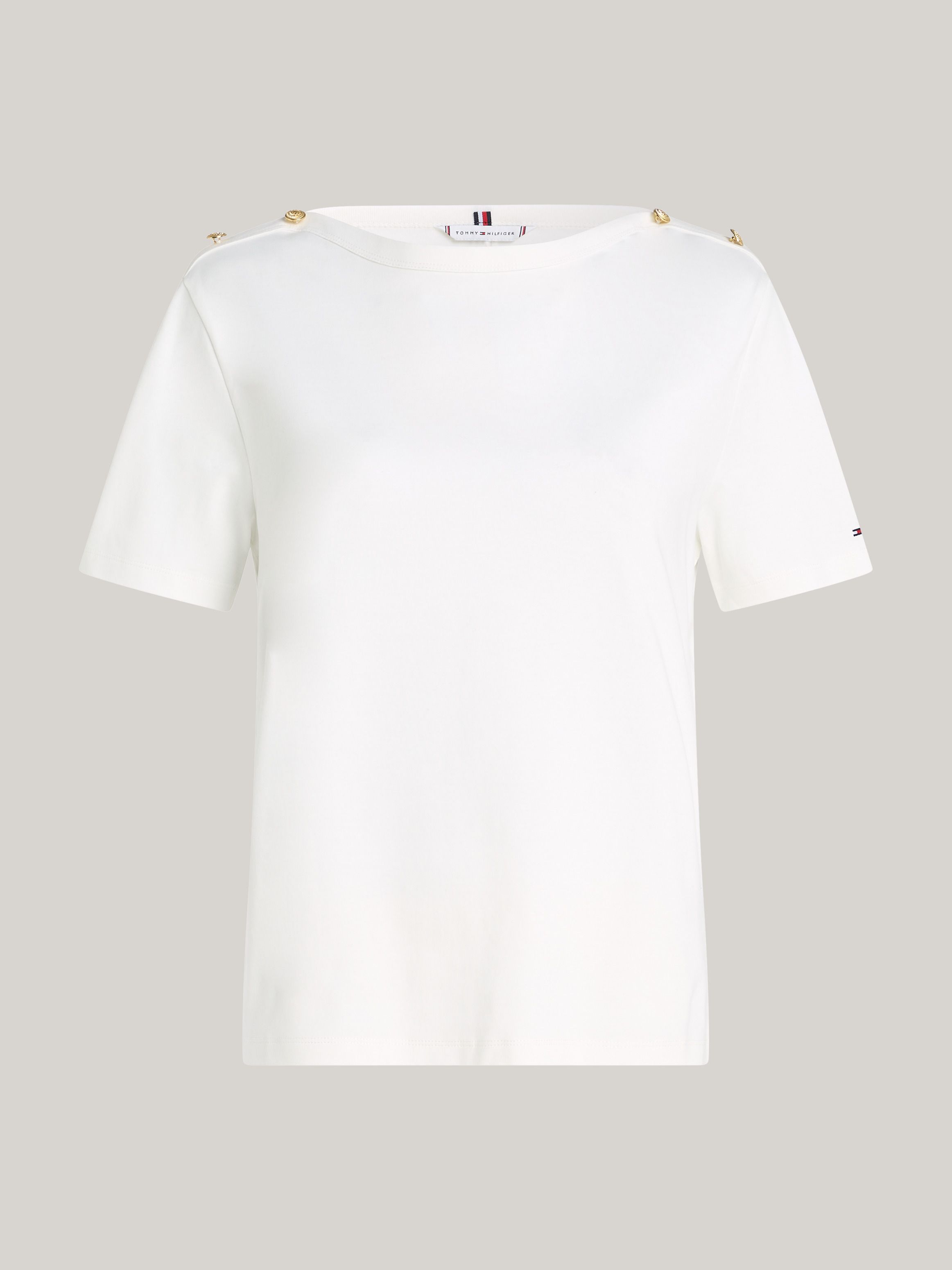 This striped tee goes all in for a nautical-inspired look with its flattering boat neck and gold-tone shoulder button detailing.
