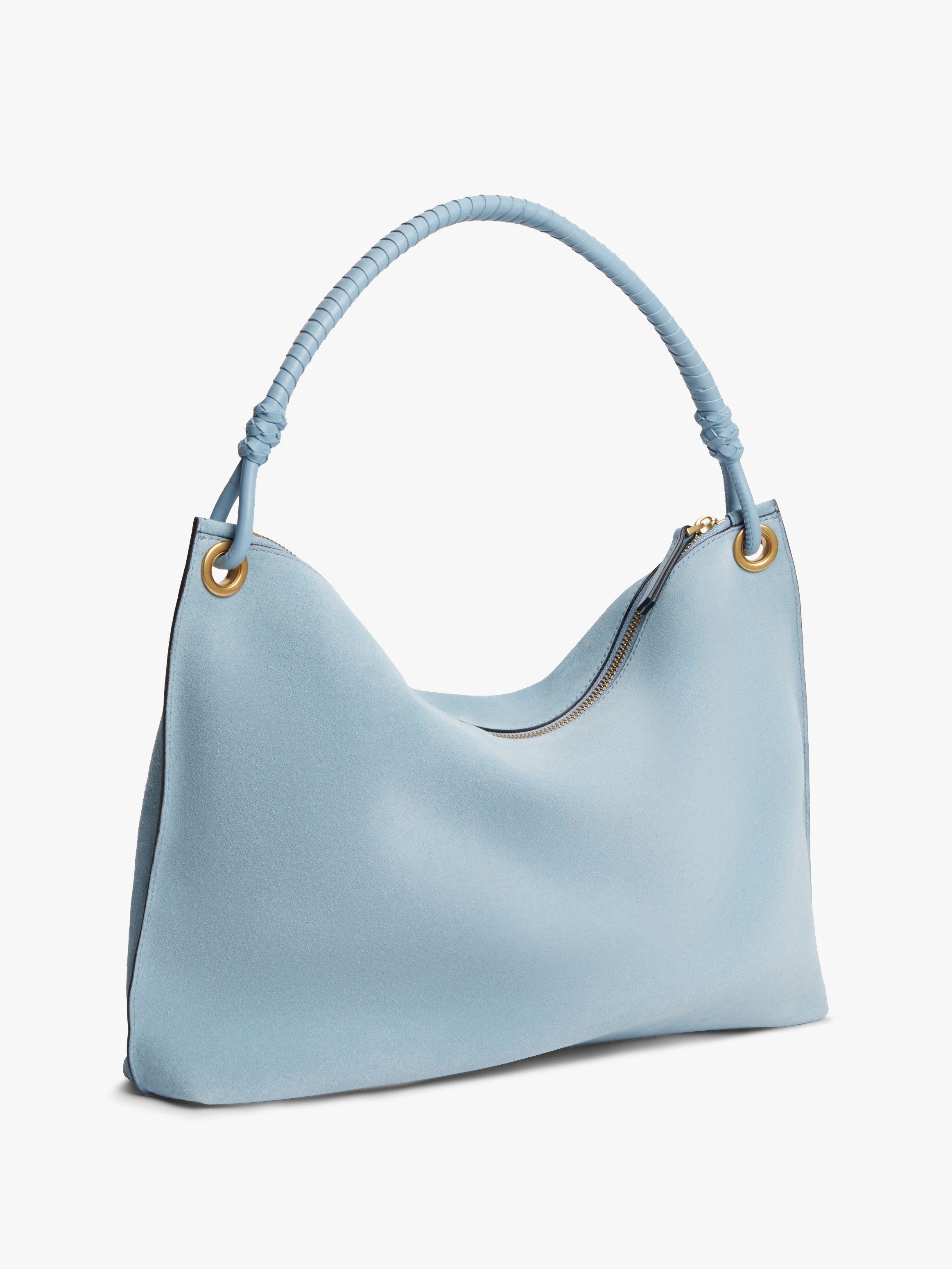 This shoulder bag with a metal logo is made from suede for a slouchy silhouette, suitable for day or evening ensembles.