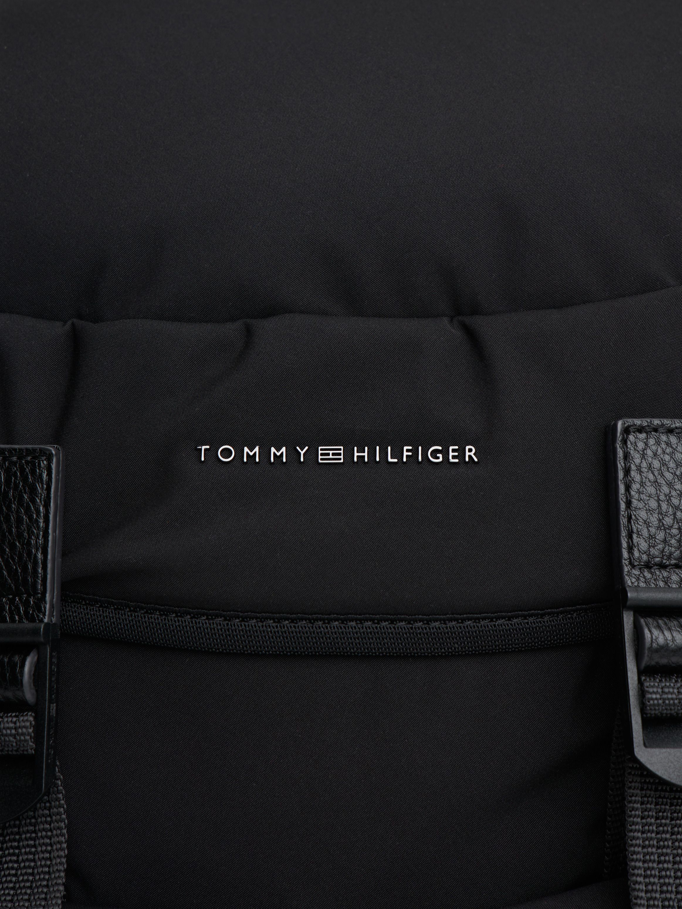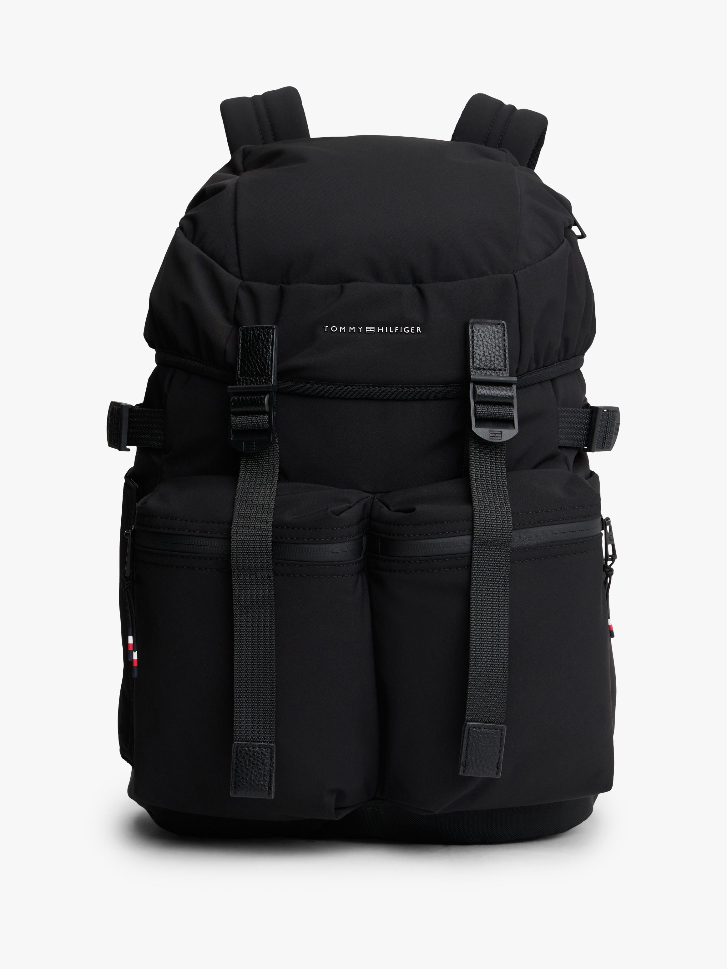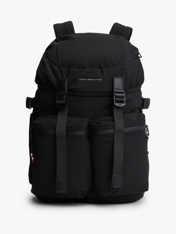 • Textile • Flap with fast-release clips and toggle drawstring closure • One top handle • Adjustable padded shoulder straps • Adjustable side straps • Padded mesh back • One main compartment • Two exterior zipped pockets • Two exterior slip pockets • Tommy Hilfiger metal logo on front • Tommy Hilfiger branding