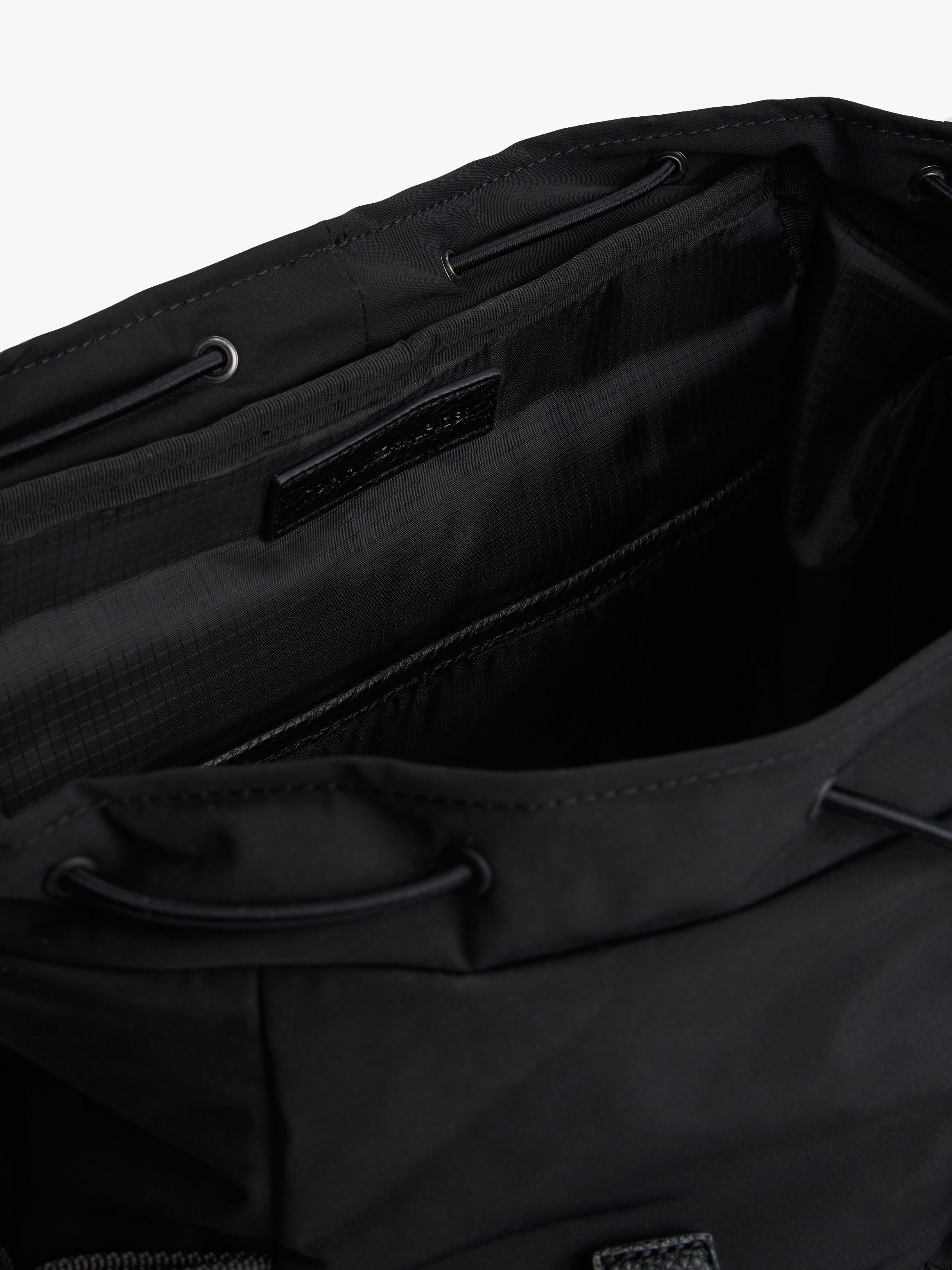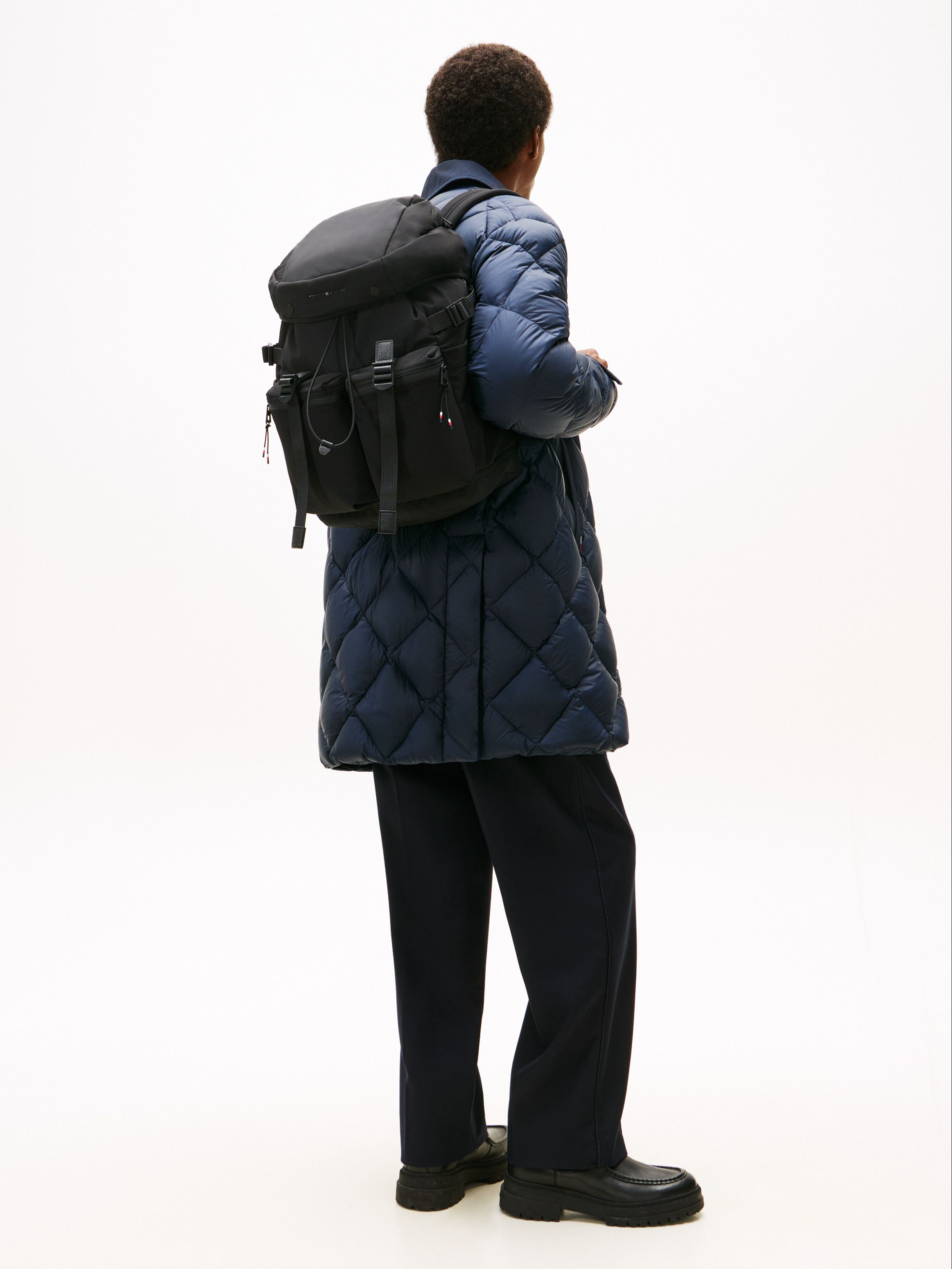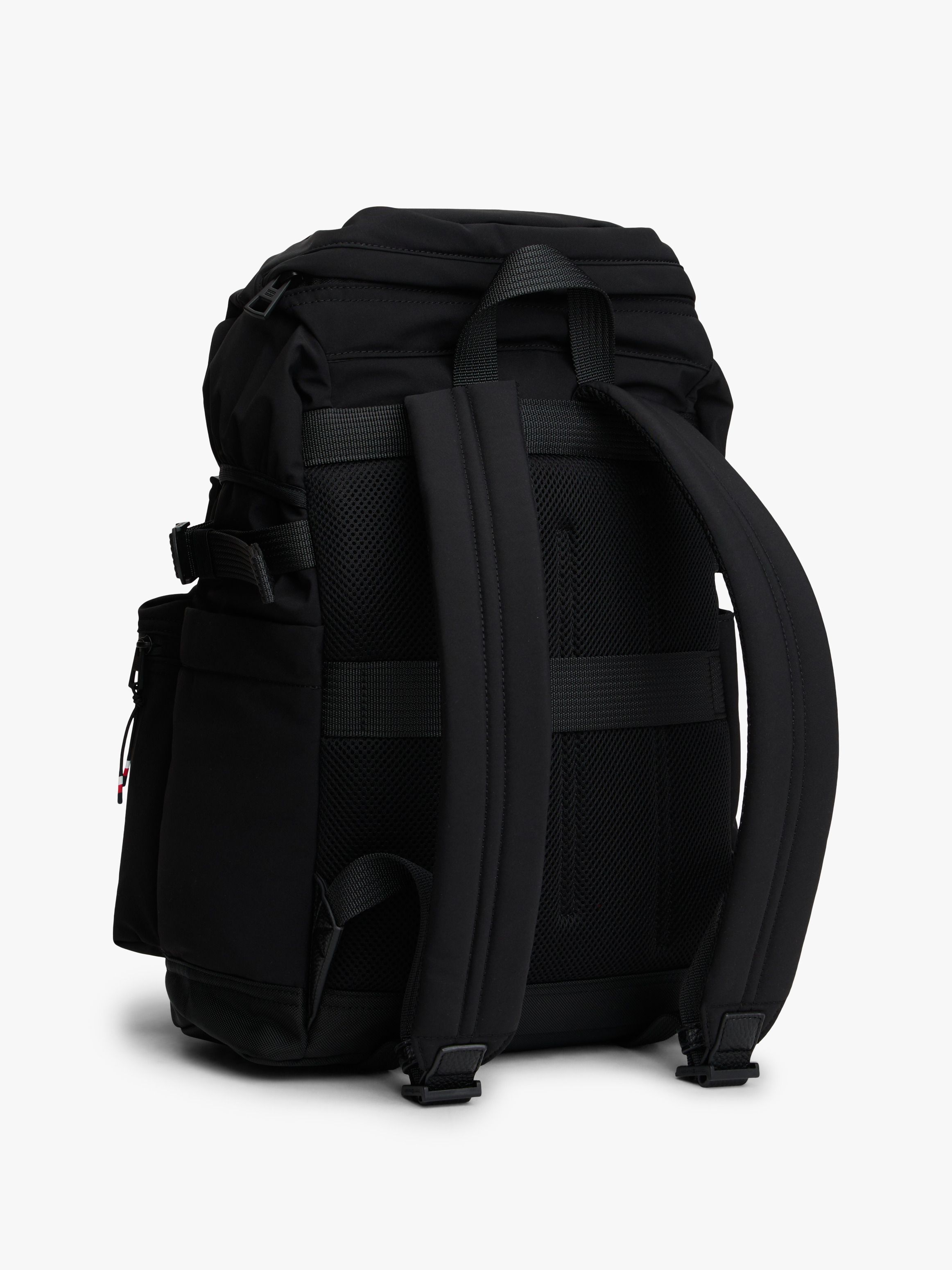 • Textile • Flap with fast-release clips and toggle drawstring closure • One top handle • Adjustable padded shoulder straps • Adjustable side straps • Padded mesh back • One main compartment • Two exterior zipped pockets • Two exterior slip pockets • Tommy Hilfiger metal logo on front • Tommy Hilfiger branding