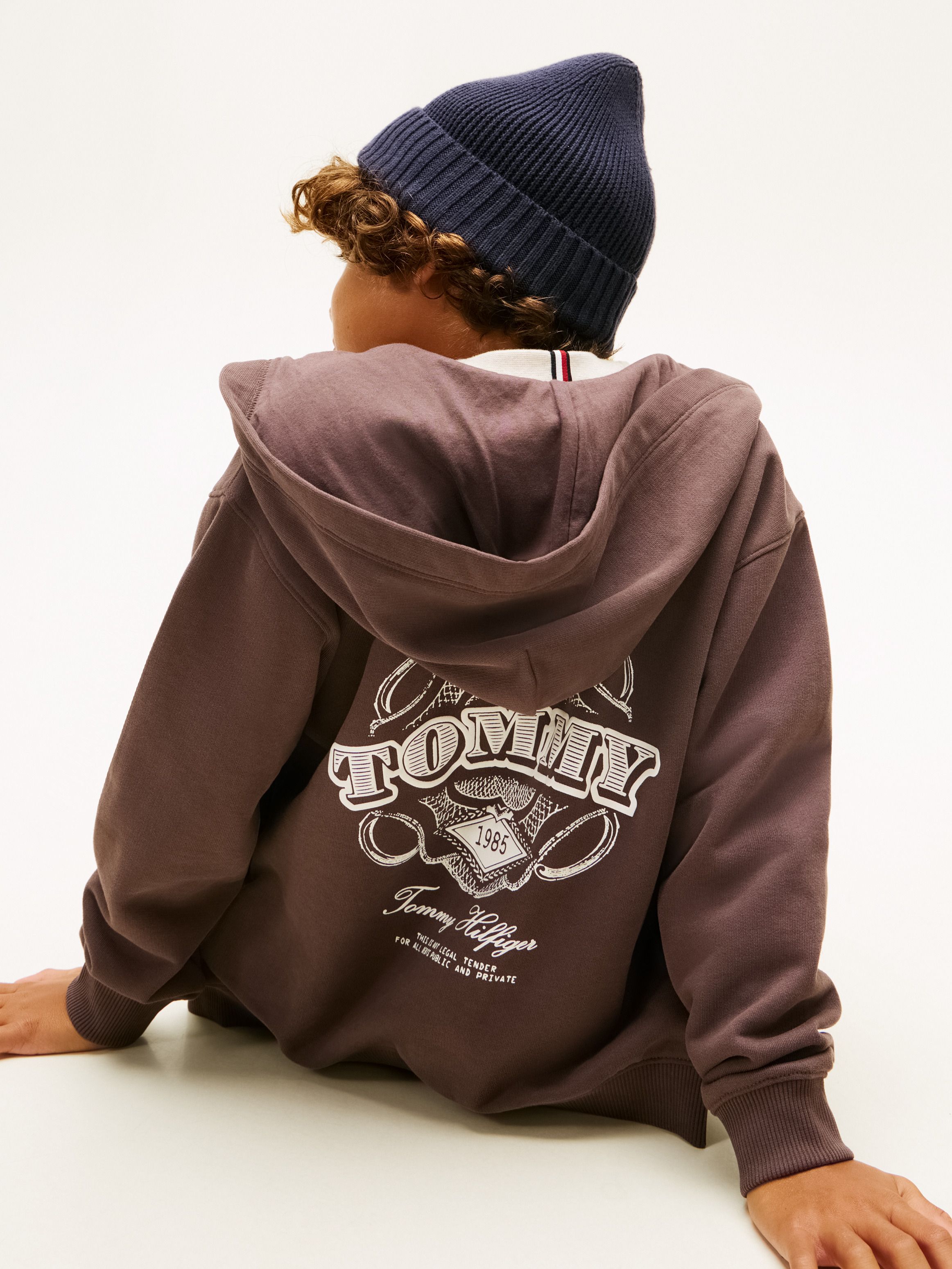 • Pure cotton terry • Hooded neck • Zip-thru • Split kangaroo pocket • Rib-knit cuffs and hem • Tommy Hilfiger textured logo on chest and back • Tommy Hilfiger branding • Tommy Hilfiger flag embroidery on sleeve