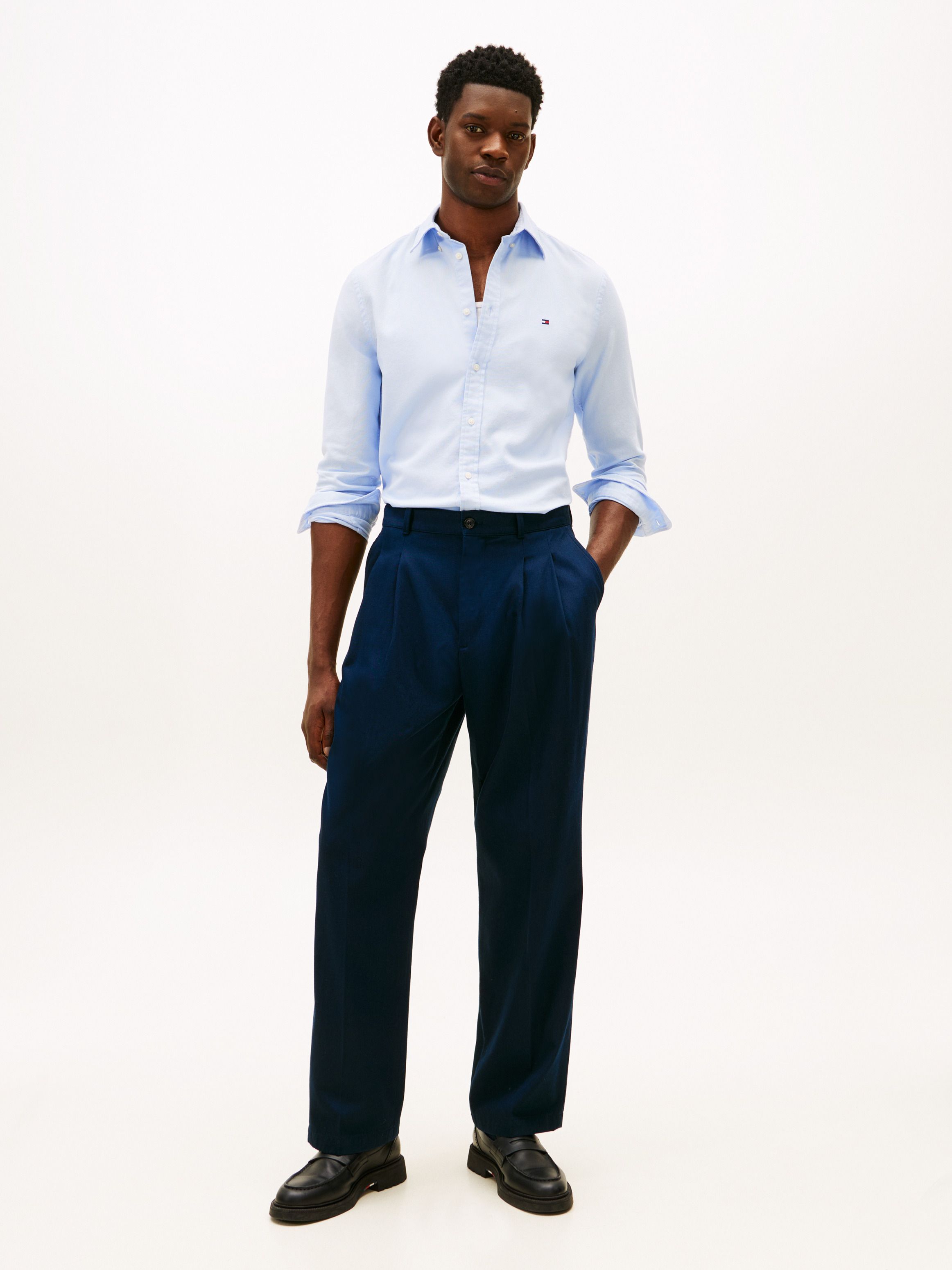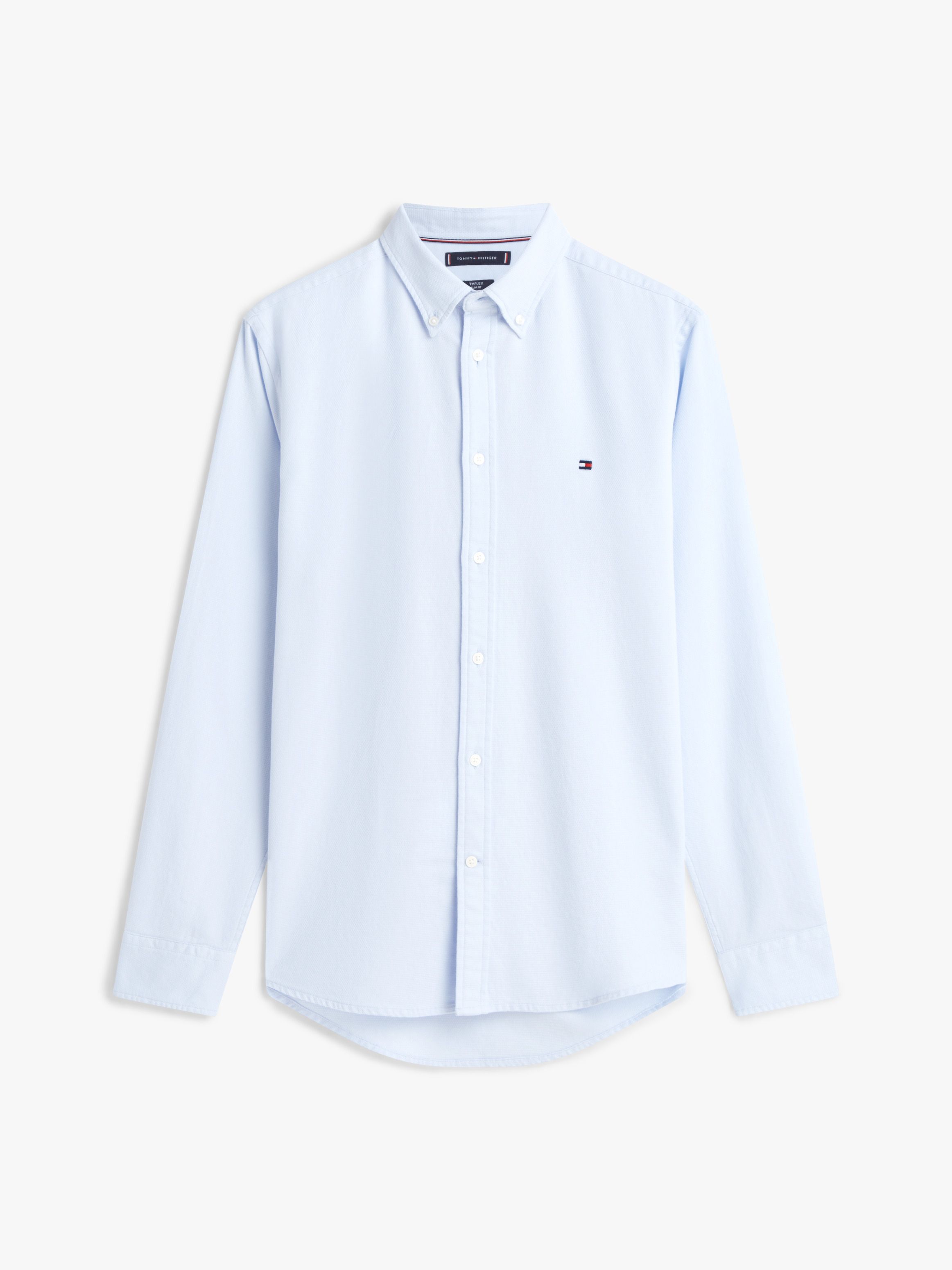 • Pure cotton dobby • Flex technology • Button-down collar • Rounded one-button cuffs • Box pleat on back • Signature tape inside neckline • Tommy Hilfiger branding • Tommy Hilfiger flag embroidery on chest
