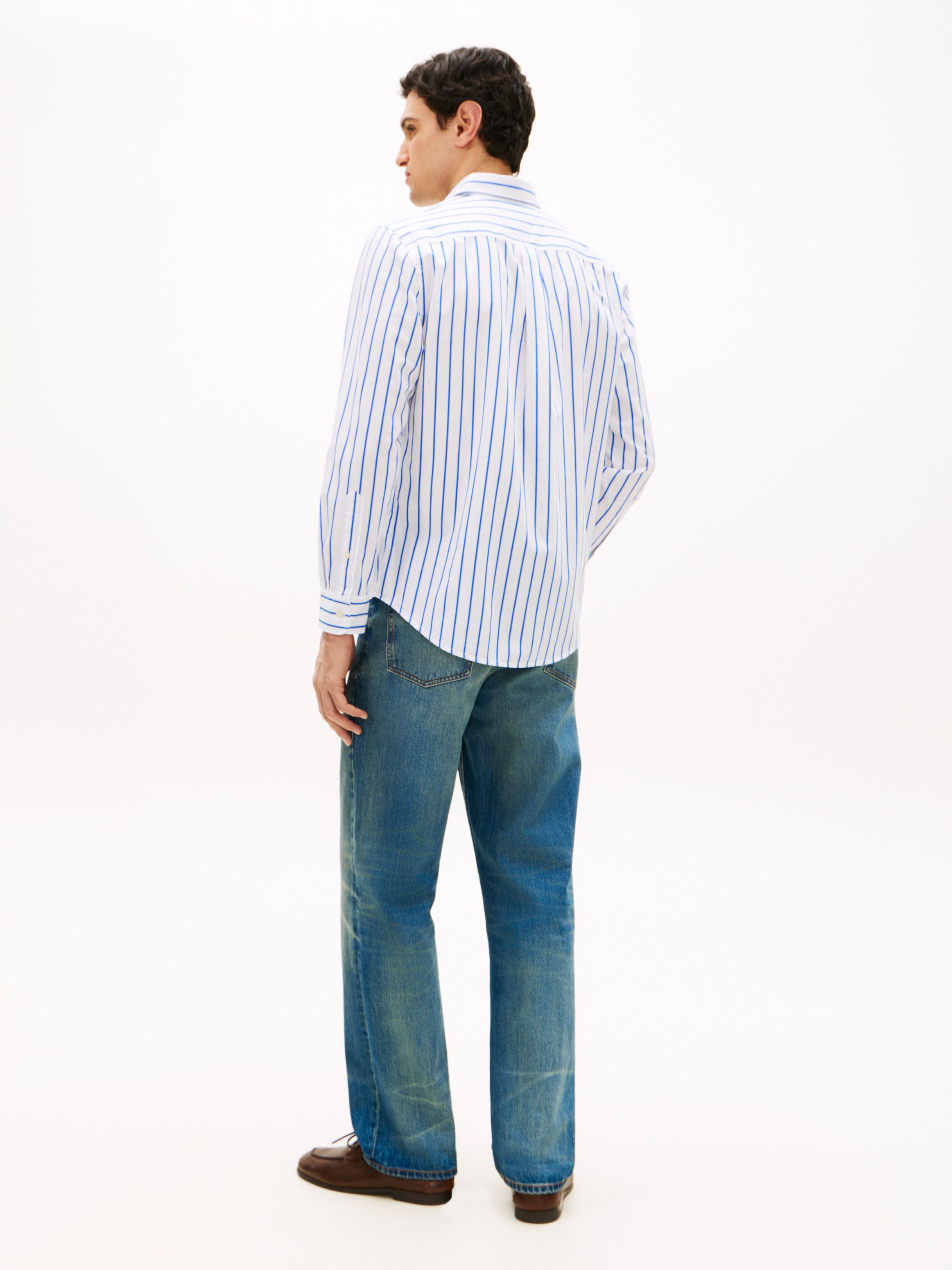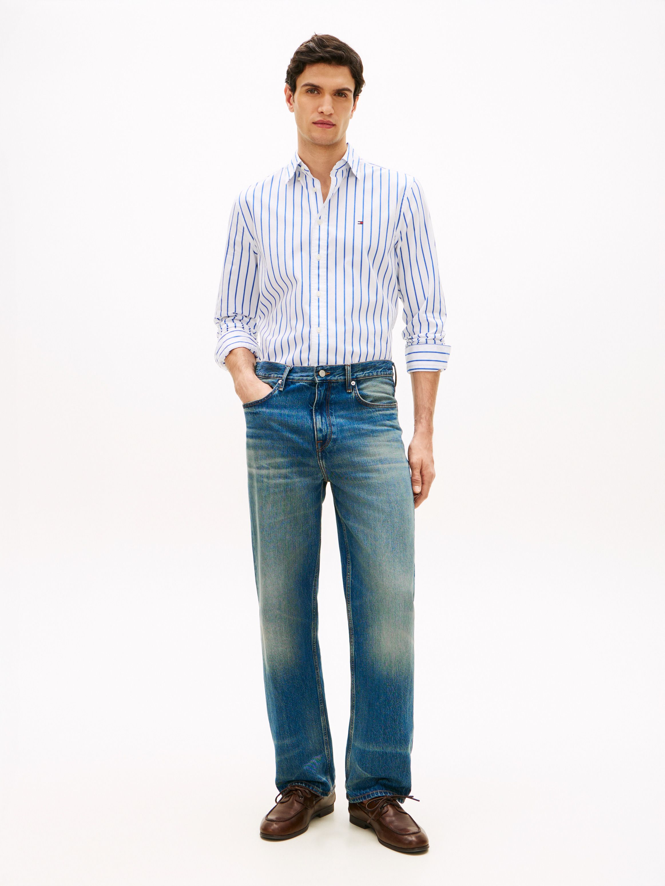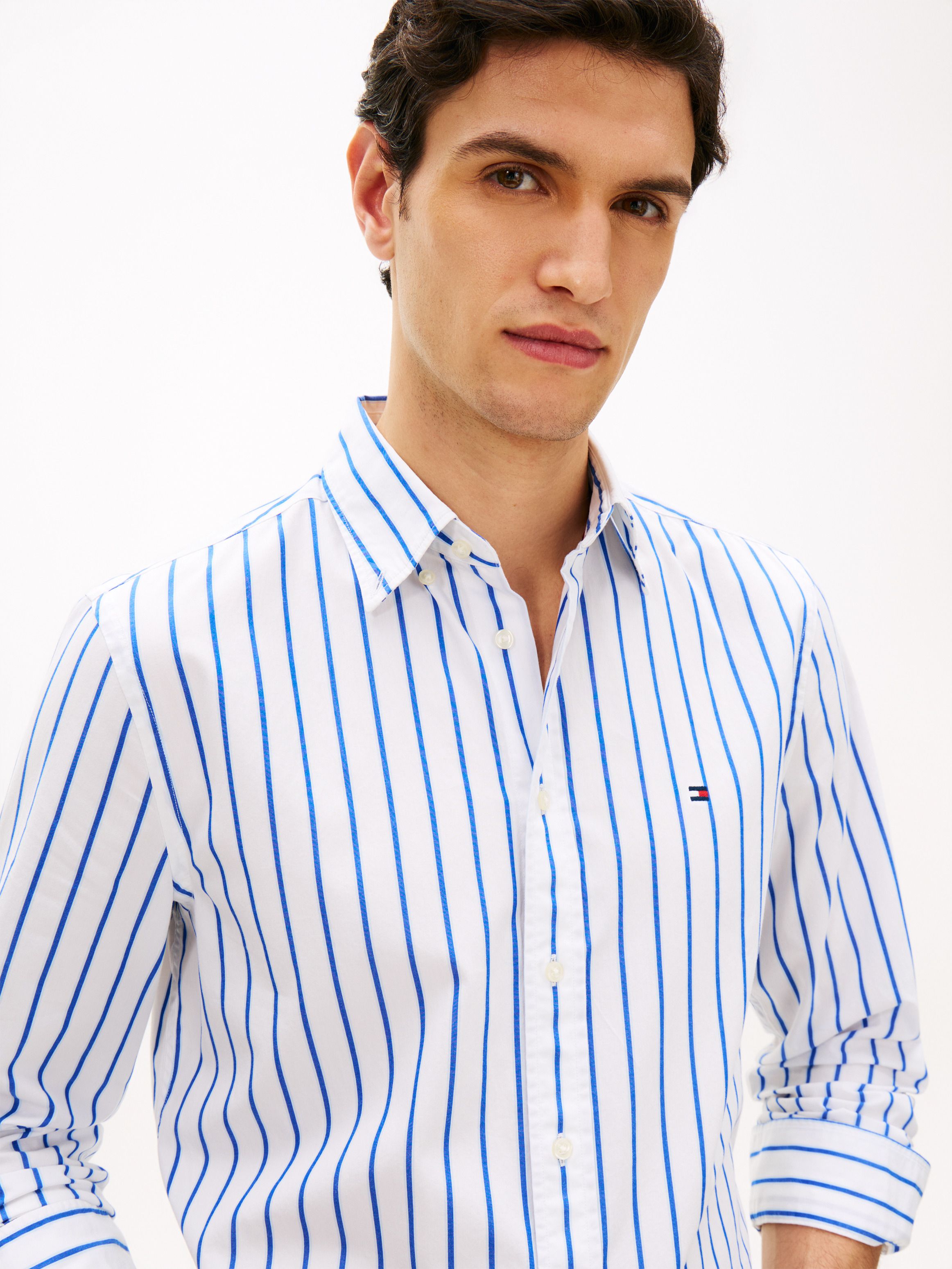 • Pure peached cotton poplin • Flex technology • All-over vertical stripe • Button-down collar • Rounded one-button cuffs • Box pleat on back • Shirttail hem • Signature tape inside neckline • Tommy Hilfiger branding • Tommy Hilfiger flag embroidery on chest